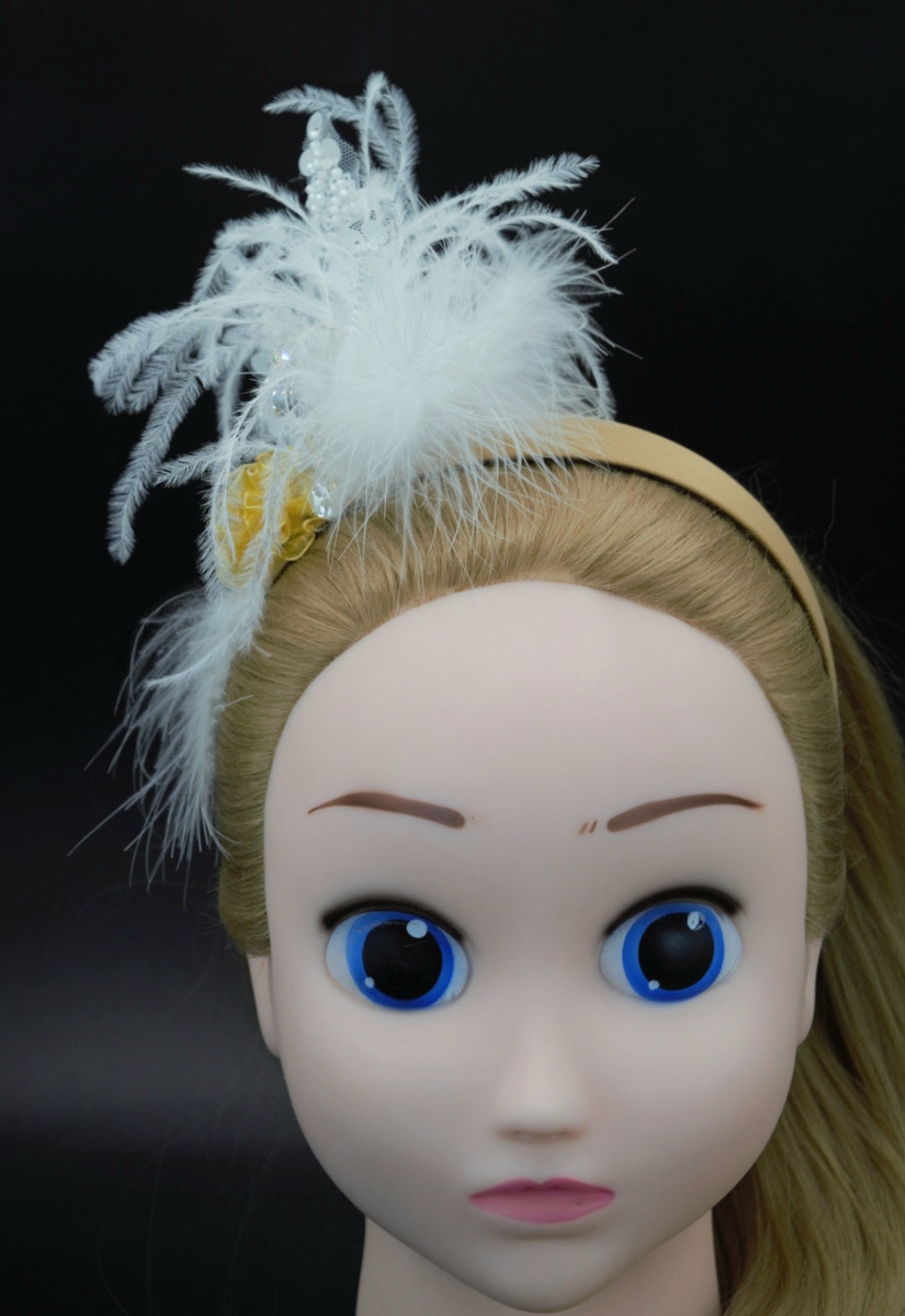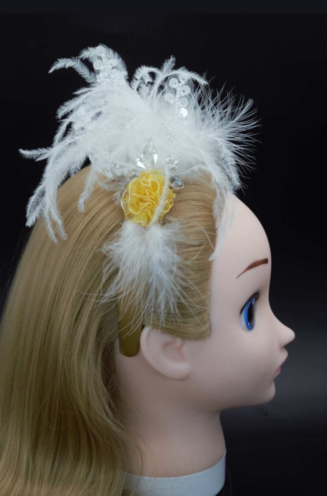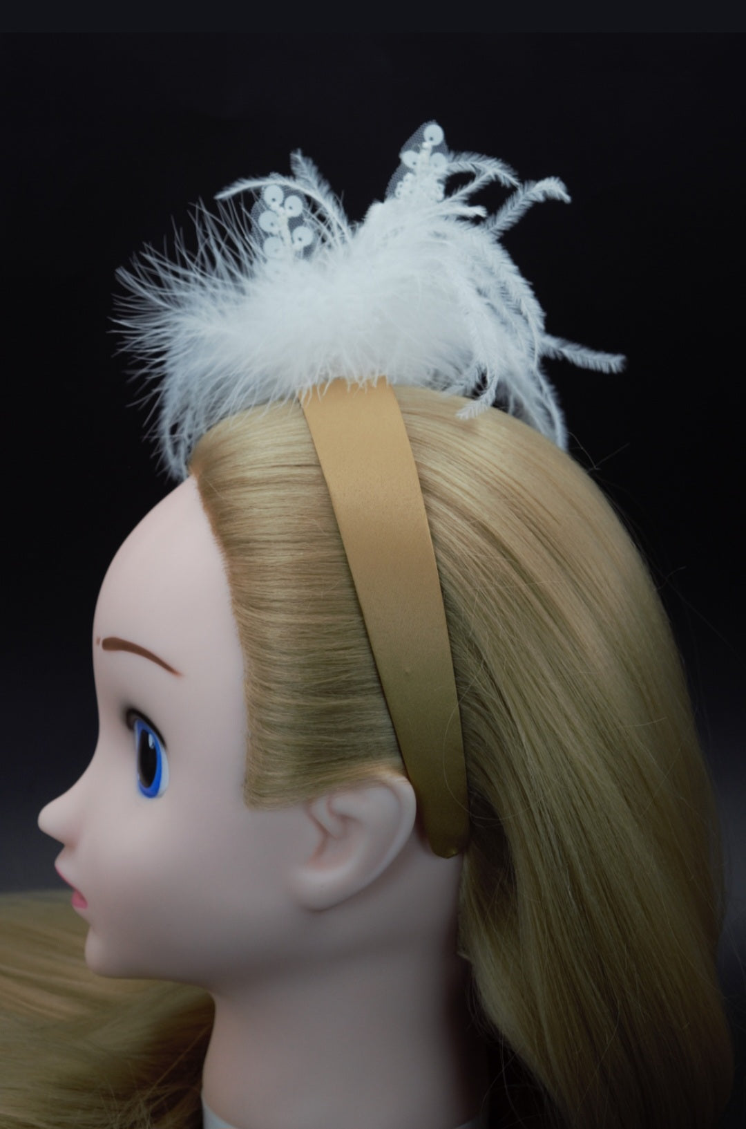 This handcrafted alluring vintage inspired headband is absolutely stunning on any person of any age. This artisanal gold satin headband with a gold tulle fabric flower and gleaming white faux feathers will have you the talk of the party! This is the perfect hair accessory for any social gatherings, parties, weddings, or just because!!