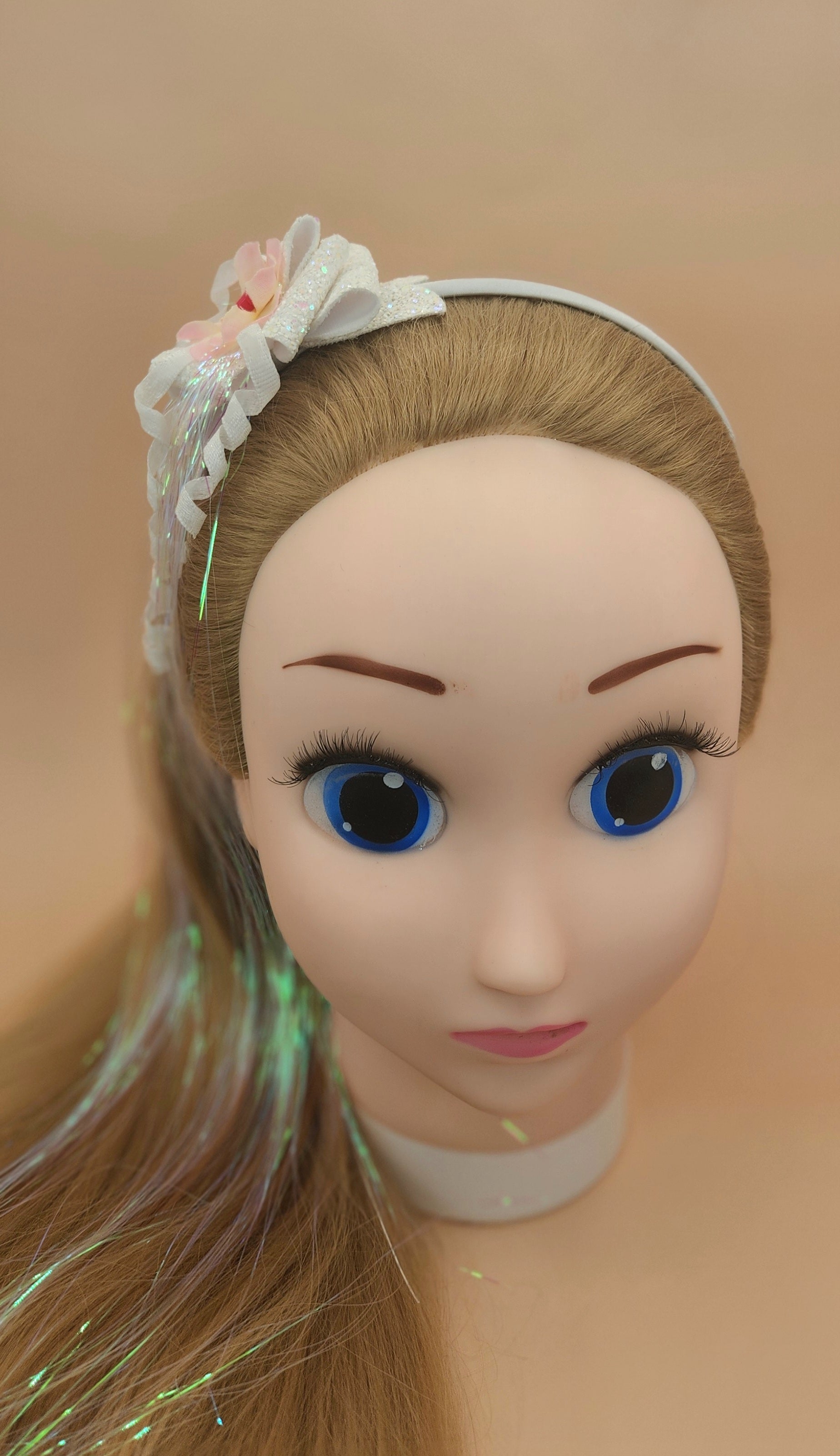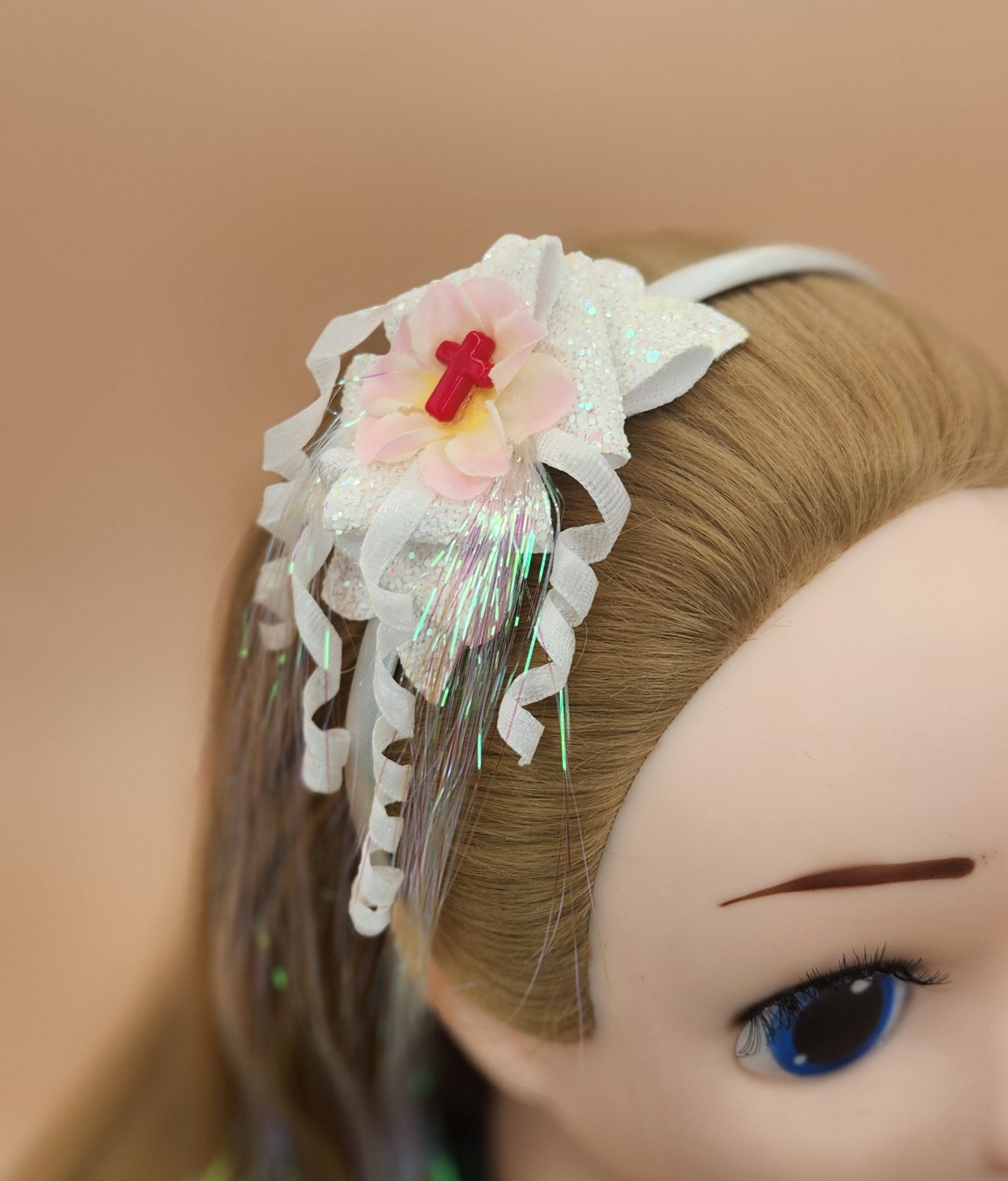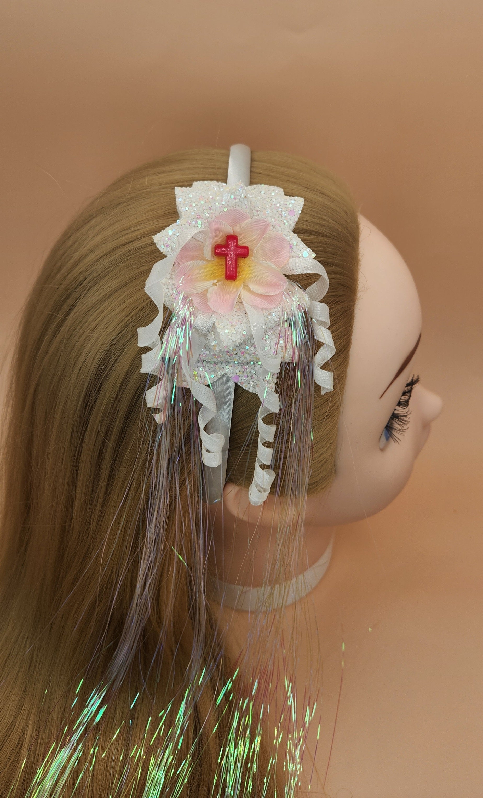 This handmade Angelic headband with white textured cloth bow, curled satin ribbon, artificial flower, sparkling iridescent free-flowing tinsel AND a tiny pink cross is quite lovely and has an innocent, appealing soft glow about it! The tinsel is an estimated 17 1/2 inches in length.