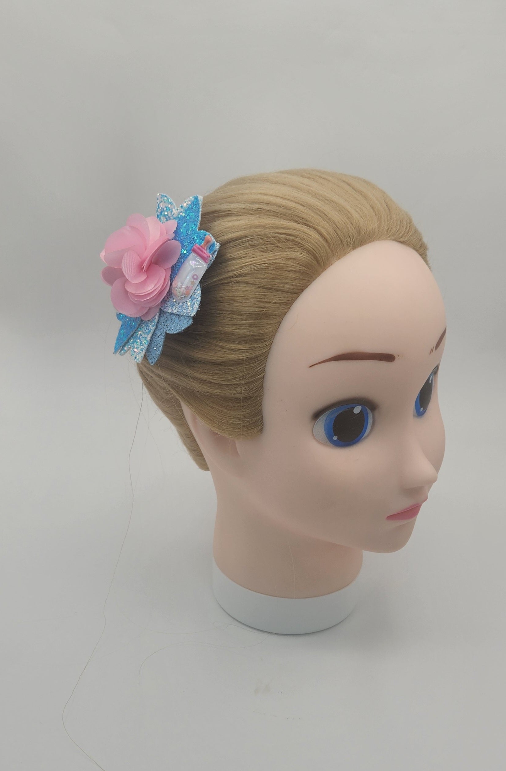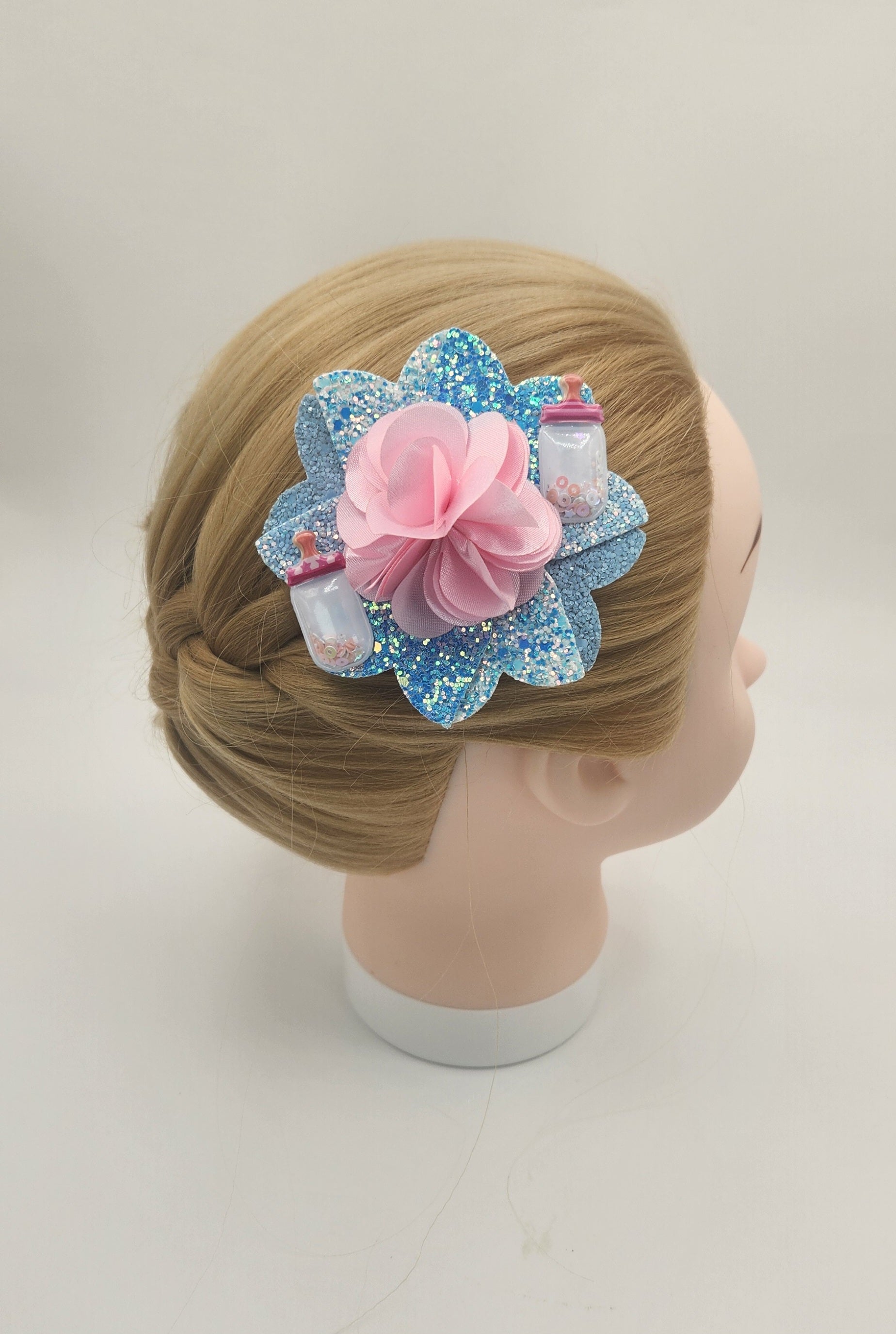 This precious handmade hair clip is so adorable with two plastic confetti filled baby bottles and pink fabric flower. This hair clip is perfect for any little girl who's a doll baby that likes to wear things in her hair. The clip attached to this is steel and has teeth for better grip.