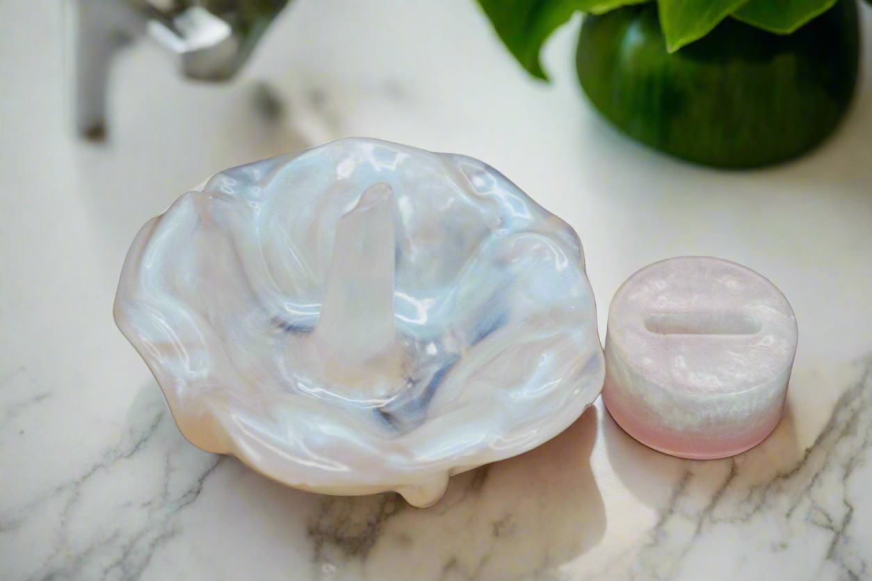 This resin jewelry set is just beautiful with swirls of ivory and pale pink shimmery colors that have a gorgeous shine to it! This set includes one jewelry dish and one ring holder.