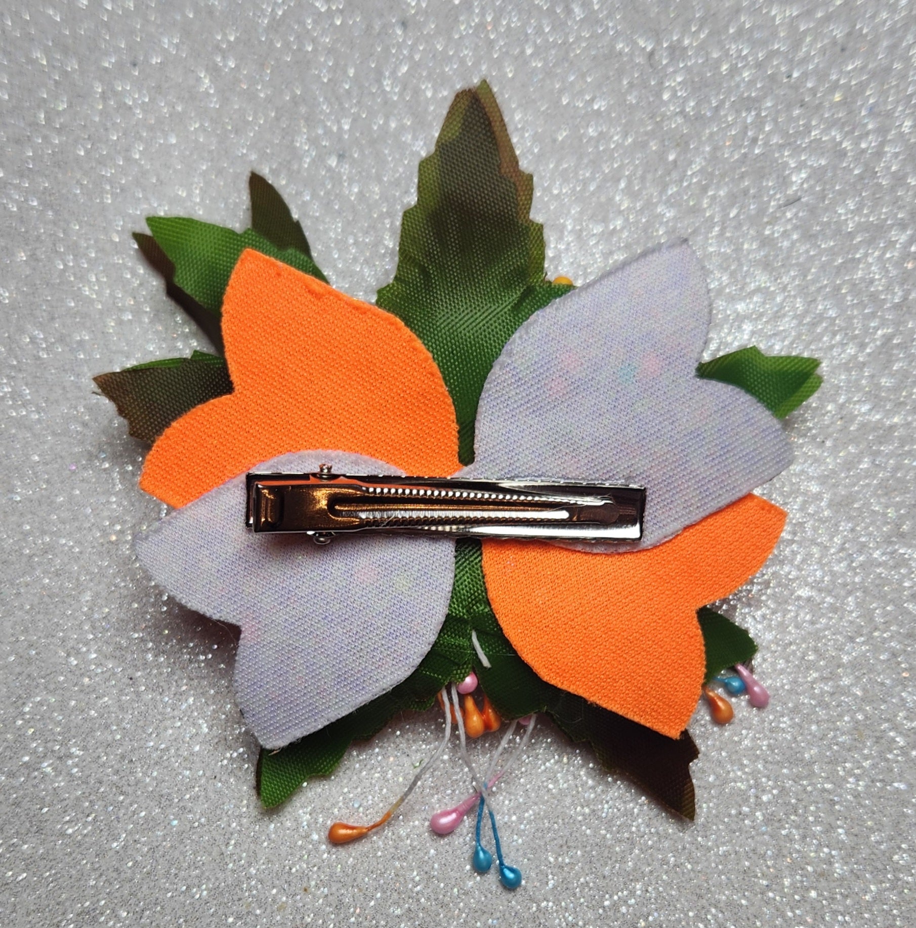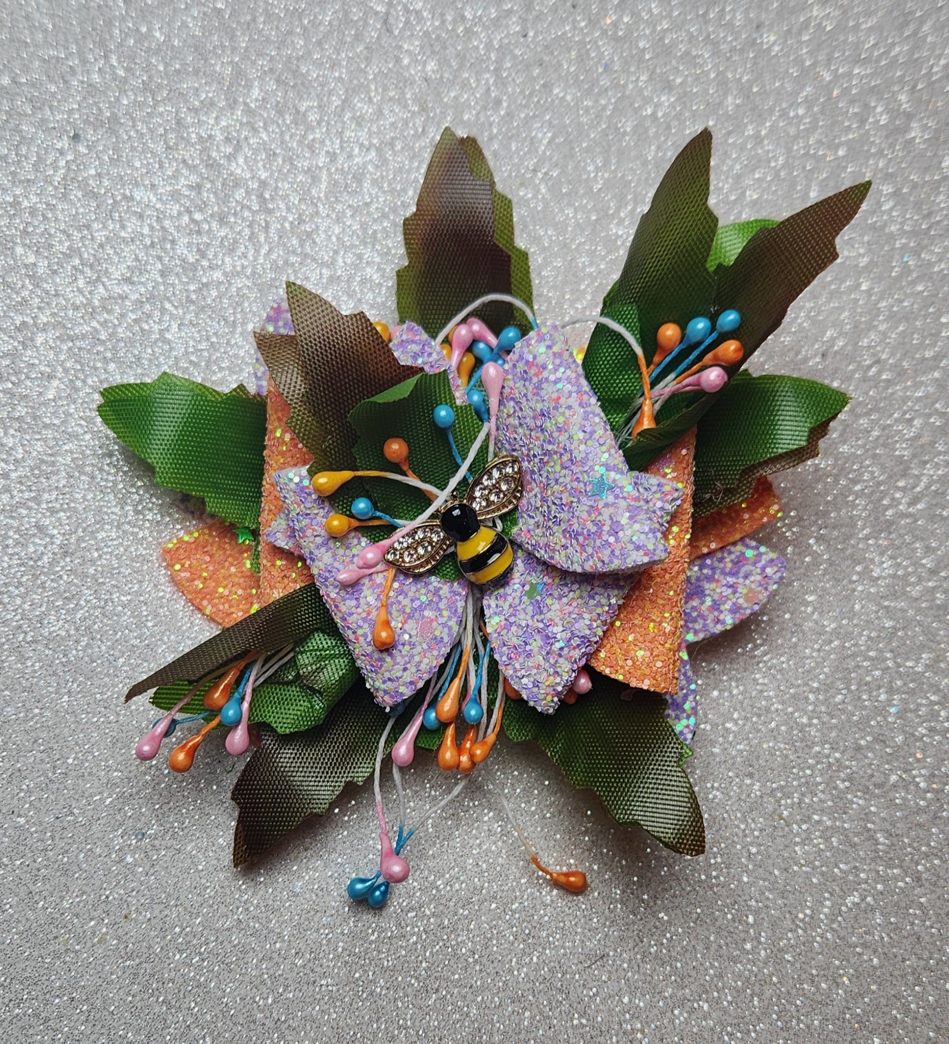 This shimmery artisanal orange and purple spotted cloth hair bow with green leaves, a friendly bee and multiple colored anther filament flower parts is the perfect spring and summer time bow to show your side of nature! The clip attached to this bow is steel and has teeth for better hair gripping.