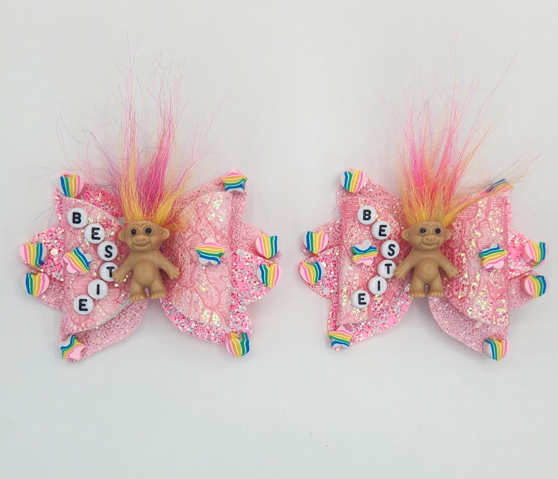 These charming handmade pink shimmery cloth hair bows with rainbow stars and a messy hair TROLL centerpiece are the perfect bows for two lil mischievous forces of nature! Just two Pretty-N-Pink gal pals who know how to have fun! The clips on the back of these bows are steel and have teeth to grip onto the hair and friendship.