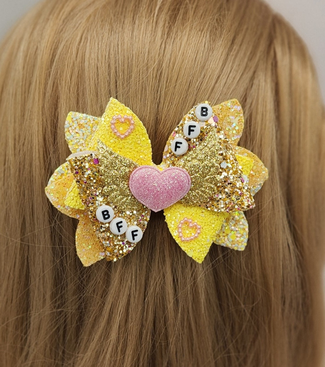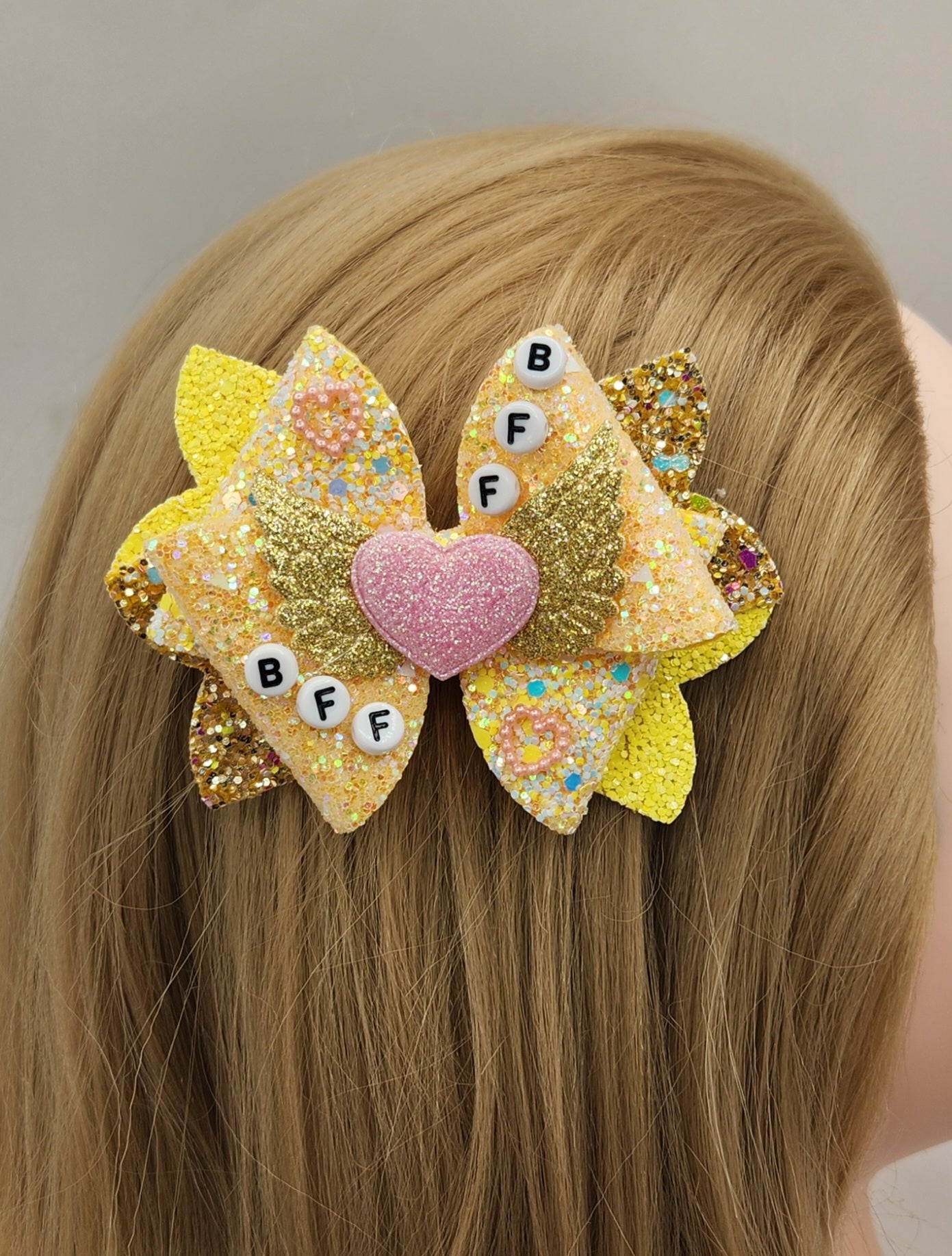 These adorable handcrafted BFF bright sunny yellow and gold glitter cloth hair bow set with gold angel wings and a pink glitter heart for a centerpiece will surely shine in any girls hair! And, with the letters BFF in beads are for two sisters or friends whose friendship is heaven on earth! Both bows have a steel clip with teeth to grio onto the hair and friendship!