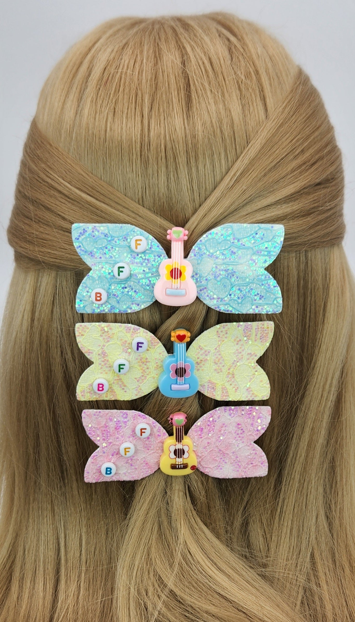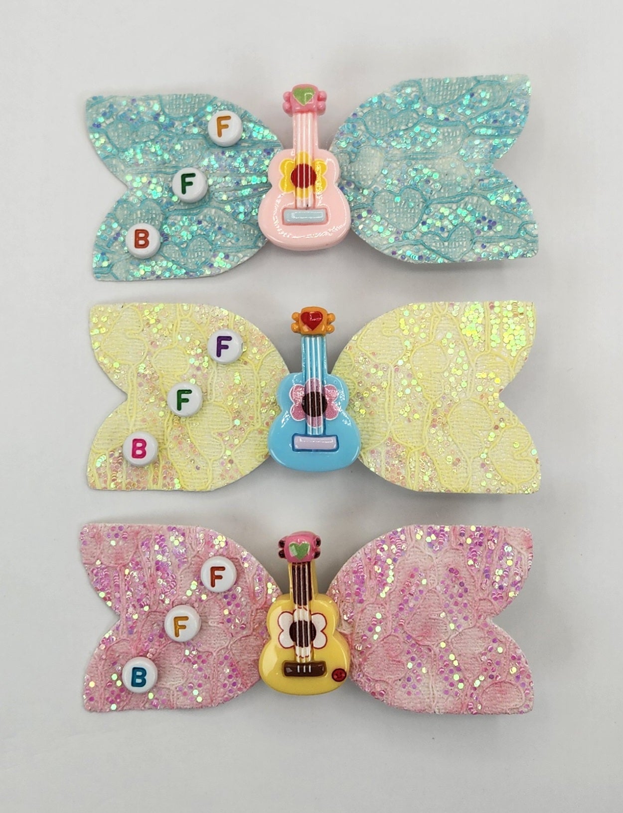 How cute are these handmade cloth hair clips that say BFF with beads and mini plastic guitars for three friends with music and friendship in their soul! The clips on the back of these are steel and have teeth to grip onto the hair and friendship.