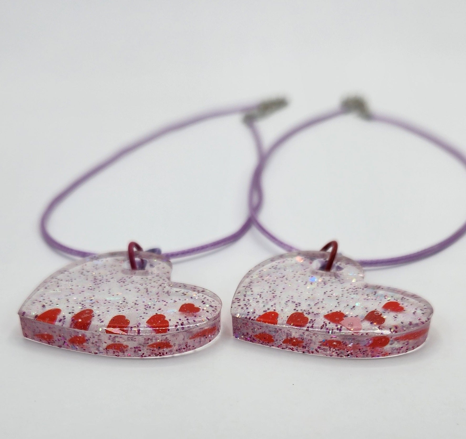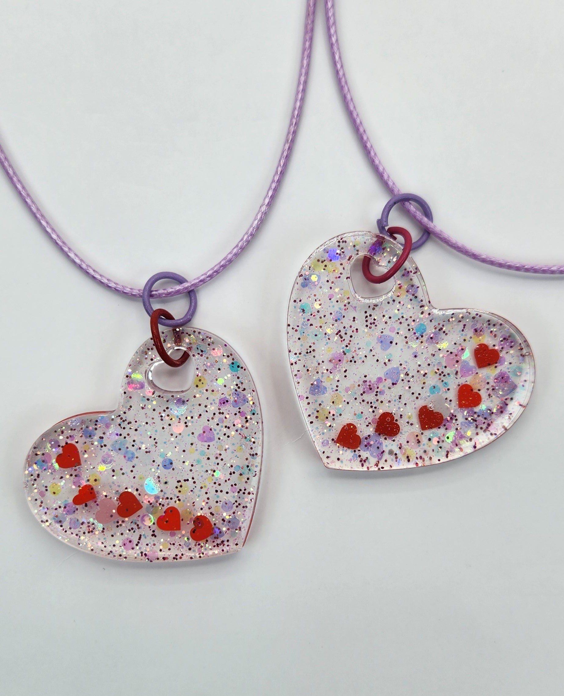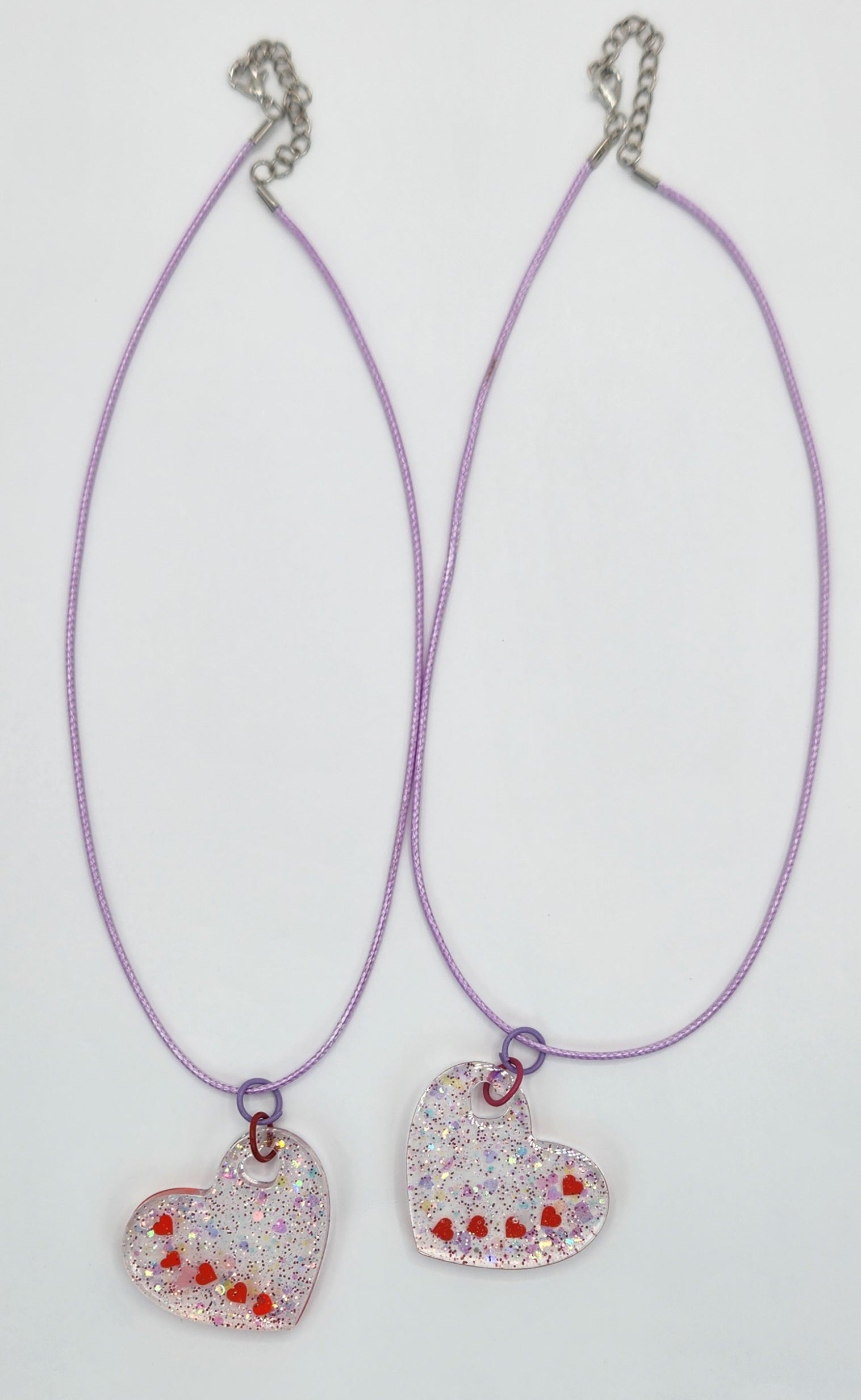This BFF clear resin handcrafted glitter heart shaped necklaces with purple wax cords is the perfect set for you and your BFF to show off your friendship! With a touch of sparkle and mini red hearts inside, it will show the two of you shining together side-by-side!