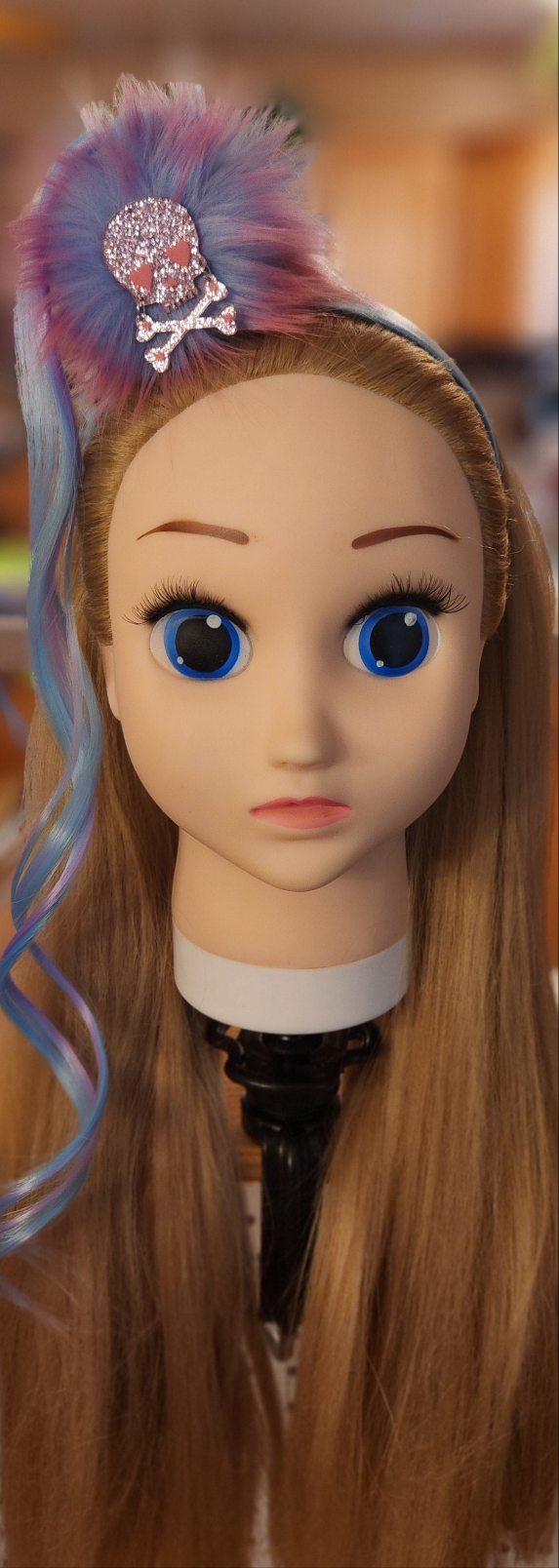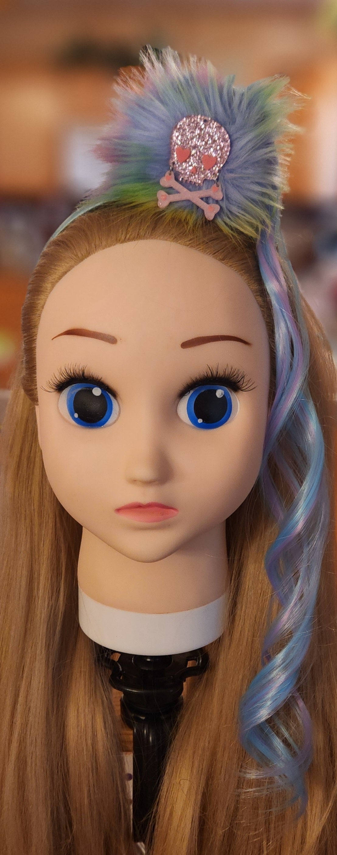 This handmade BFF sets is wicked cool for any two friends who love to show off their friendship with fun, sassy, spooky styles in their hair! Furry pom-poms, curly colorful hair, and a pink glittery skull to show you two are friends til the end! *These two headbands are sold as a set! *Hair is roughly 16inches long.