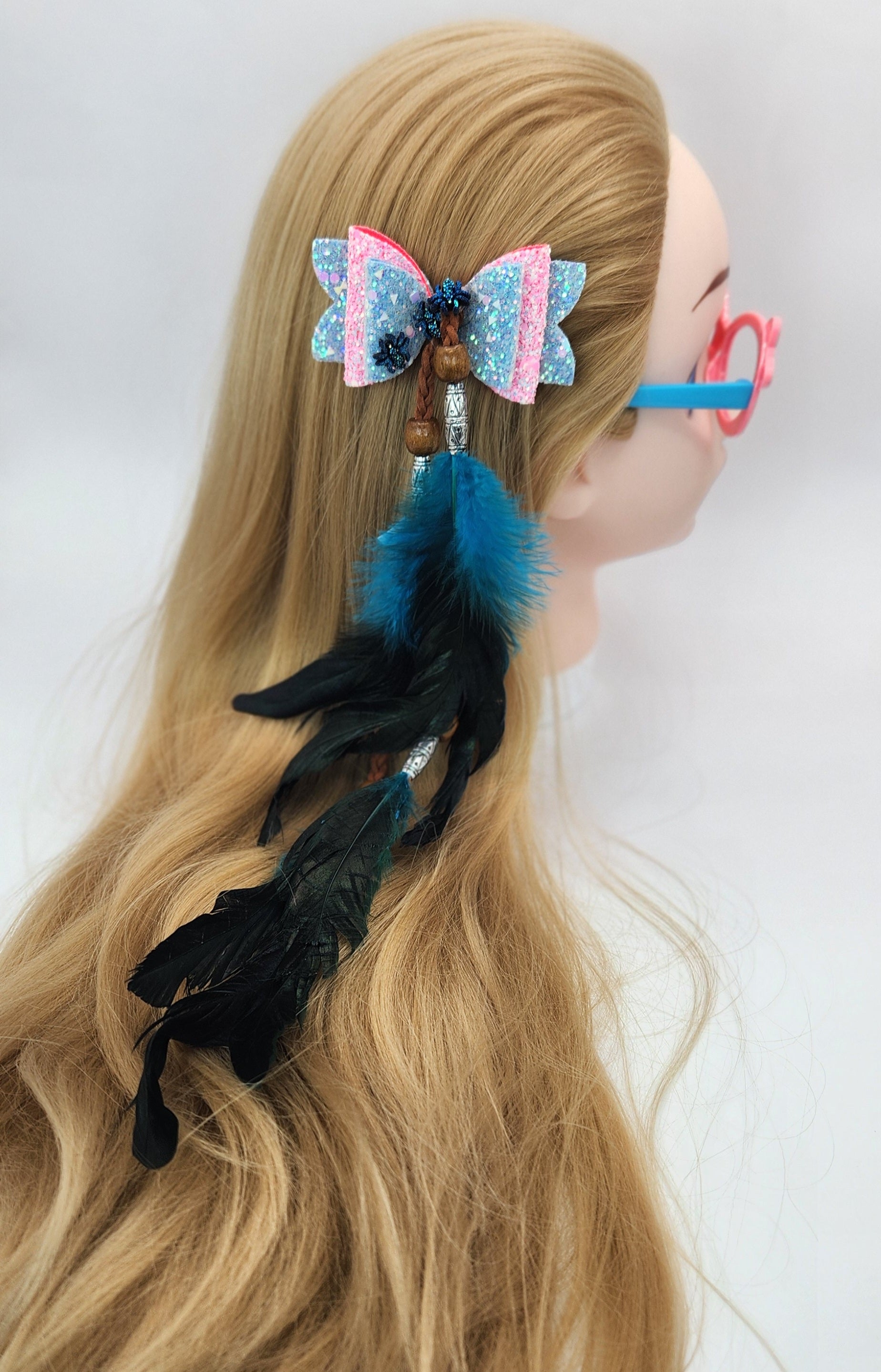 This handcrafted iridescent pink and baby blue cloth hair bow will show a sweet side to your child with tiny black spiders added to show off the arachnophile side! It also has artificial suede leather string free falling from the center of the bow with beads and faux blue and black feathers for a free spirited feel. The clip attached to this bow is steel and has teeth for better hair gripping.