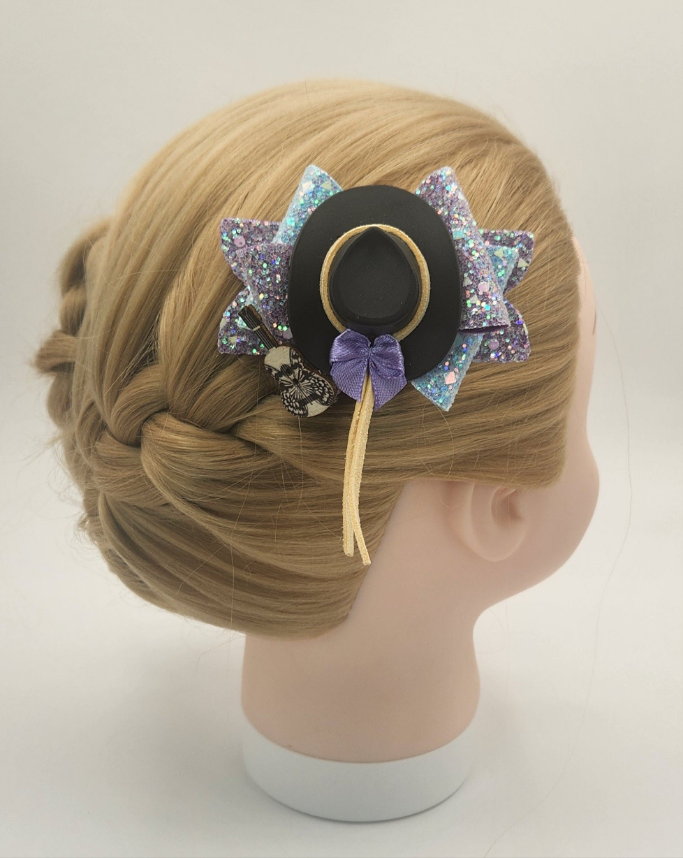 This fun handcrafted shiney iridescent purple and blue cloth hair bow with a black cowgirl hat and wooden guitar says classic and sassy all in one! The hat band on this hat shows a traditional look and all ties together with a cute bow. The clip attached to this bow is steel and has teeth for better hair grip.