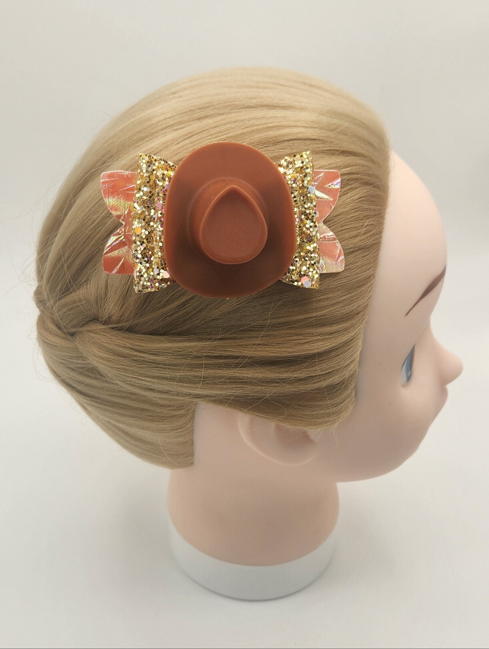 This handmade fun shiney glittery cloth hairbow with a cowgirl hat shows a stylish side to your little farmer! The glitter gold and iridescent colors are sure to shine and glisten under the sun. The clip attached to this bow is steel and has teeth for better hair grip.