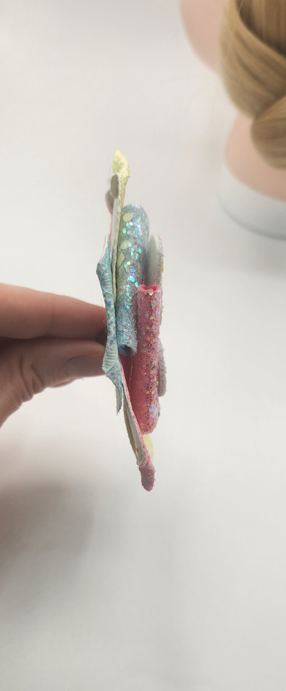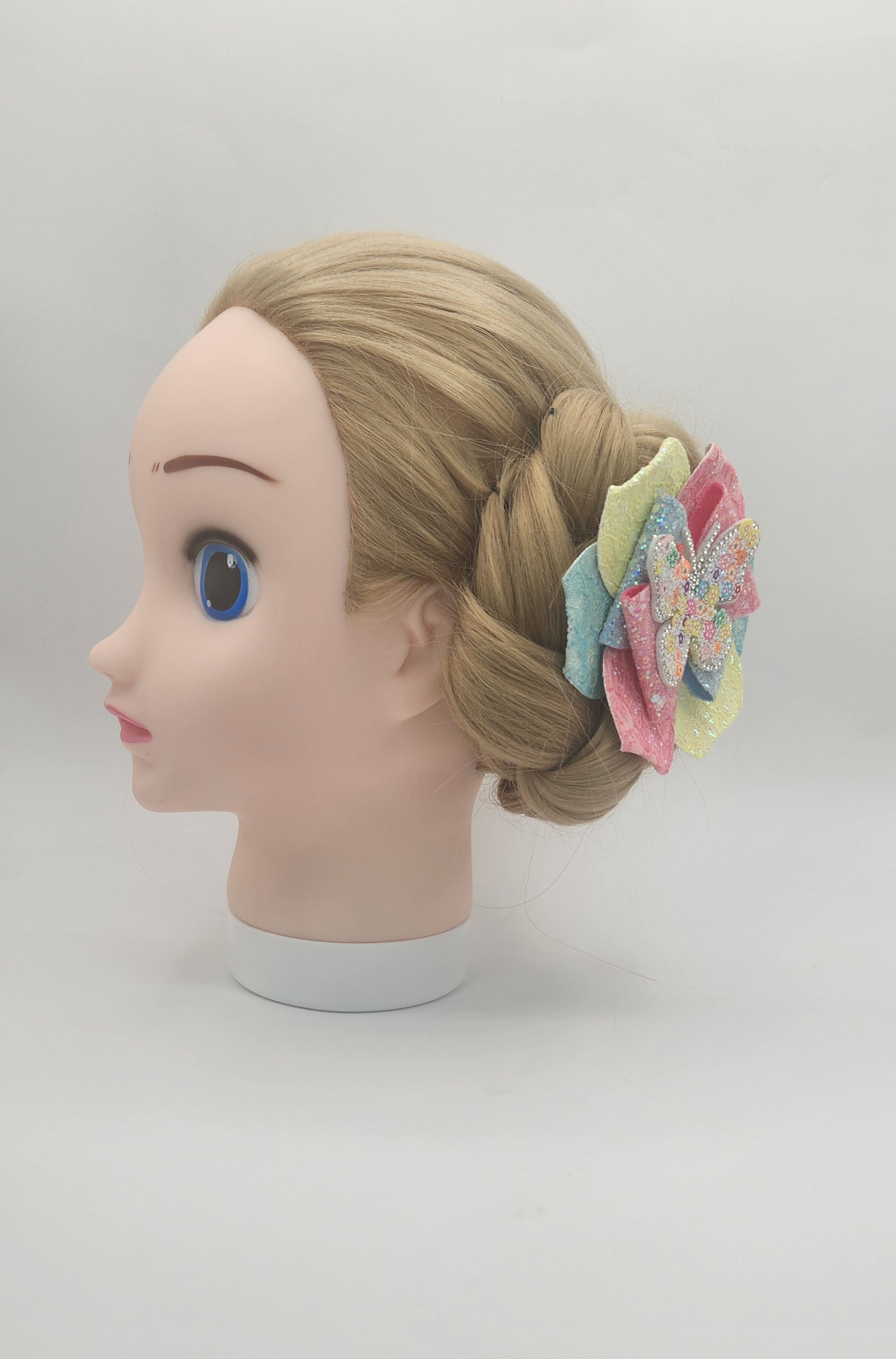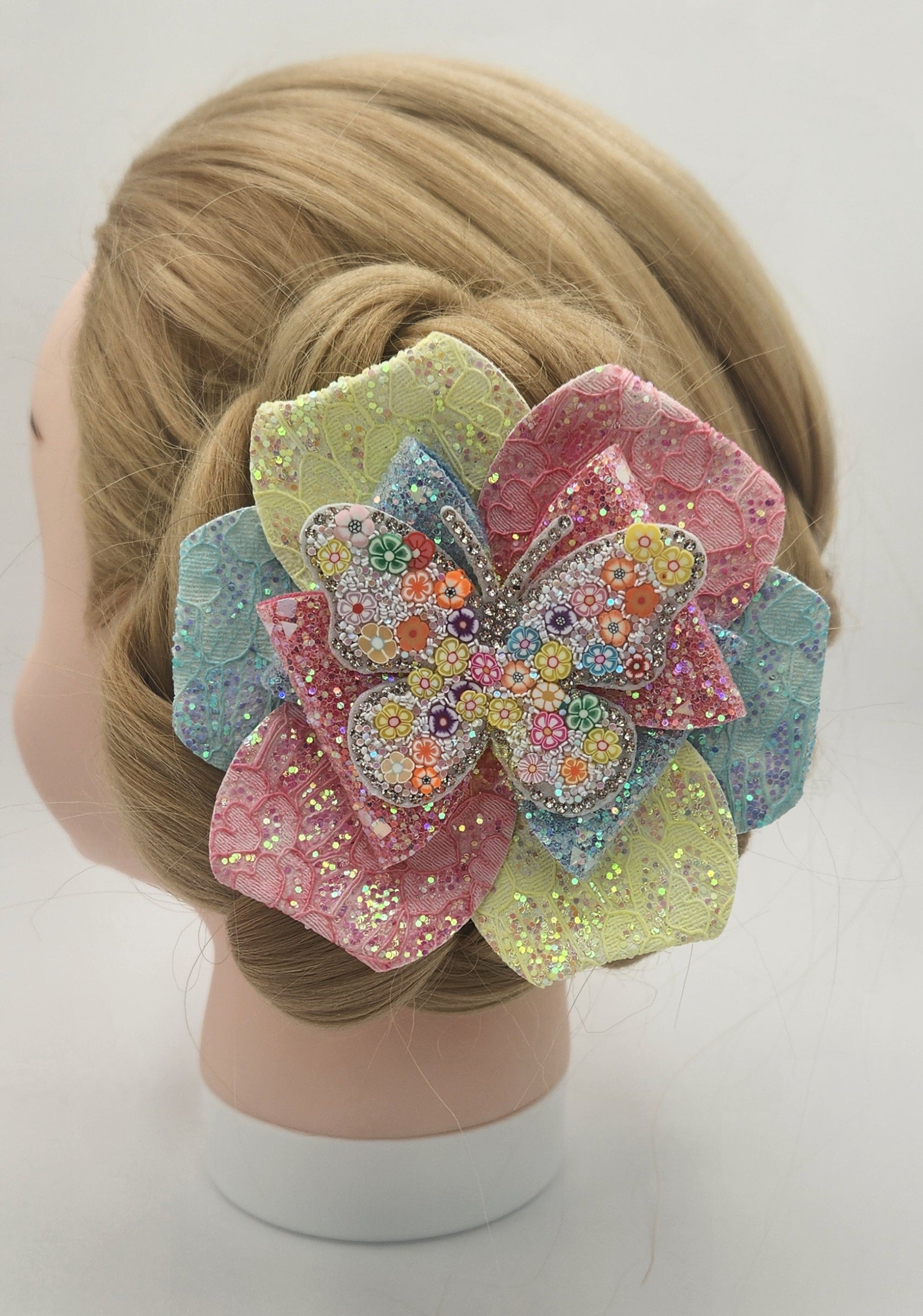 This artisanal iridescent multi-colored cloth hair bow is designed to be flat and acts as a centerpiece design to showcase a bun hairstyle. This of course can be worn in any hairstyle you choose. The beads and rhinestones of the butterfly's body adds a playful touch of summer. The clip attached to this bow is steel and has teeth for better hair grip.