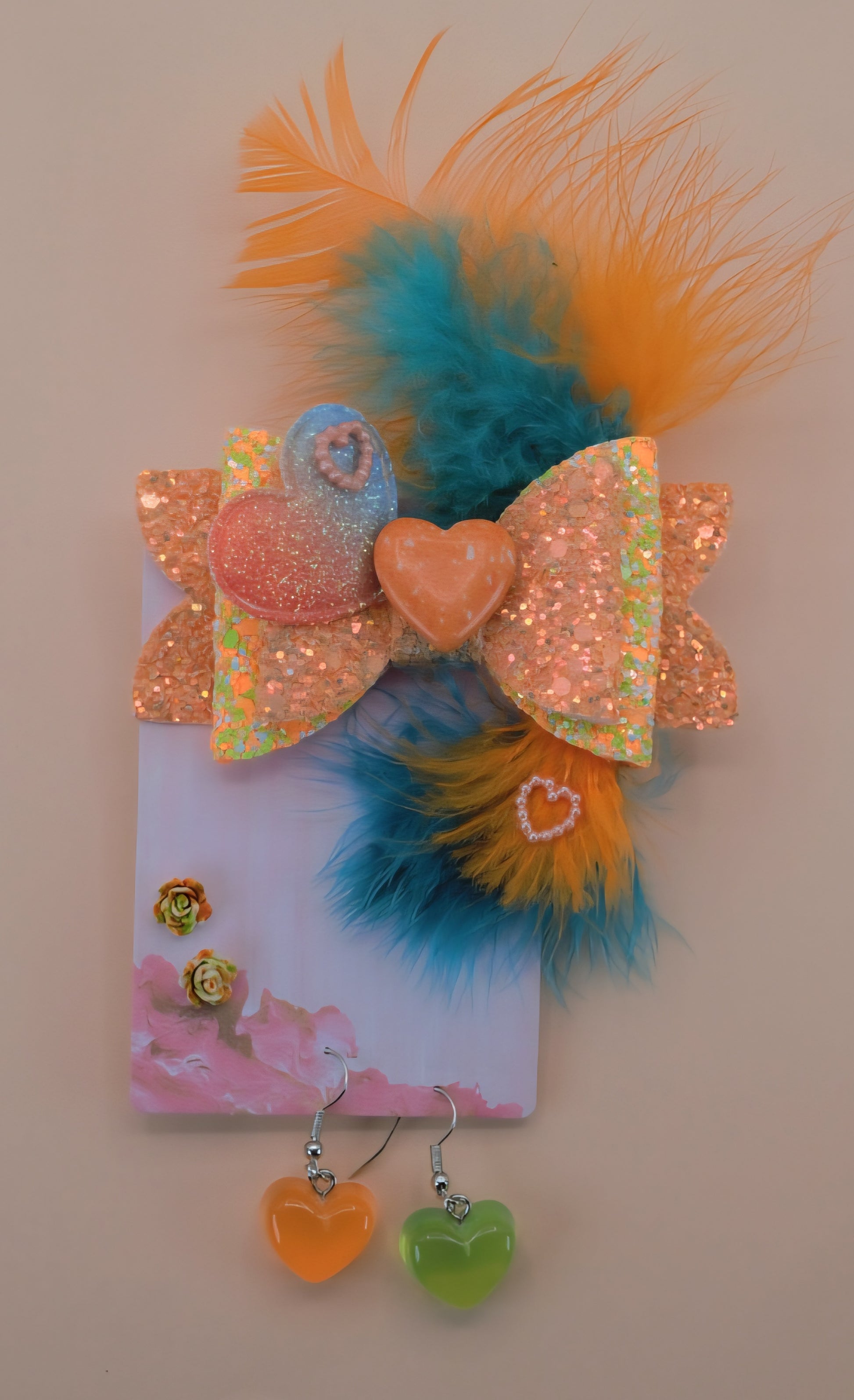 This handcrafted piece of hair art with teal and orange faux feathers attached to an orange and green spotted cloth hair bow will show a sophisticated classy side to any lil gals who wears it! This bow comes with two pair of earrings. One small multicolored resin rose stud earrings. And one dangle pair of heart shaped resin mismatched orange and green earrings. The clip attached to this bow is an alligator clip with teeth for better hair grip. Both earrings have stainless steel hooks and backs.