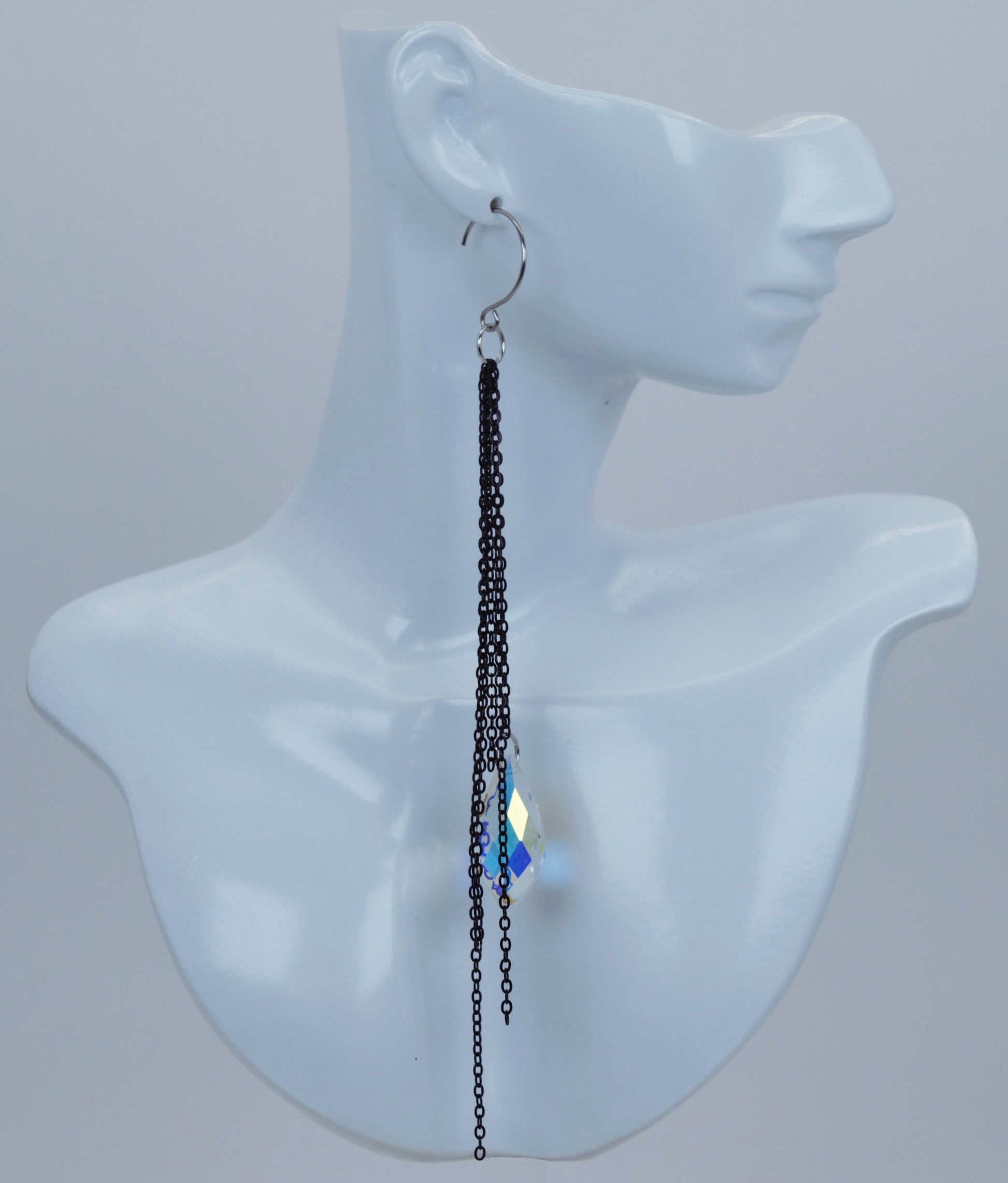 These long earrings are eye-catching all the way from the French loop, down to the hanging crystal. If you want a pair of earrings that say, "My fashion sense hangs as long as these earrings", then this is the accessory for you! Featuring five black stainless steel chains of various lengths with a piece of faux crystal dangling at the end of the shortest chain. The earring hooks are French loops made from stainless steel and are hypoallergenic.