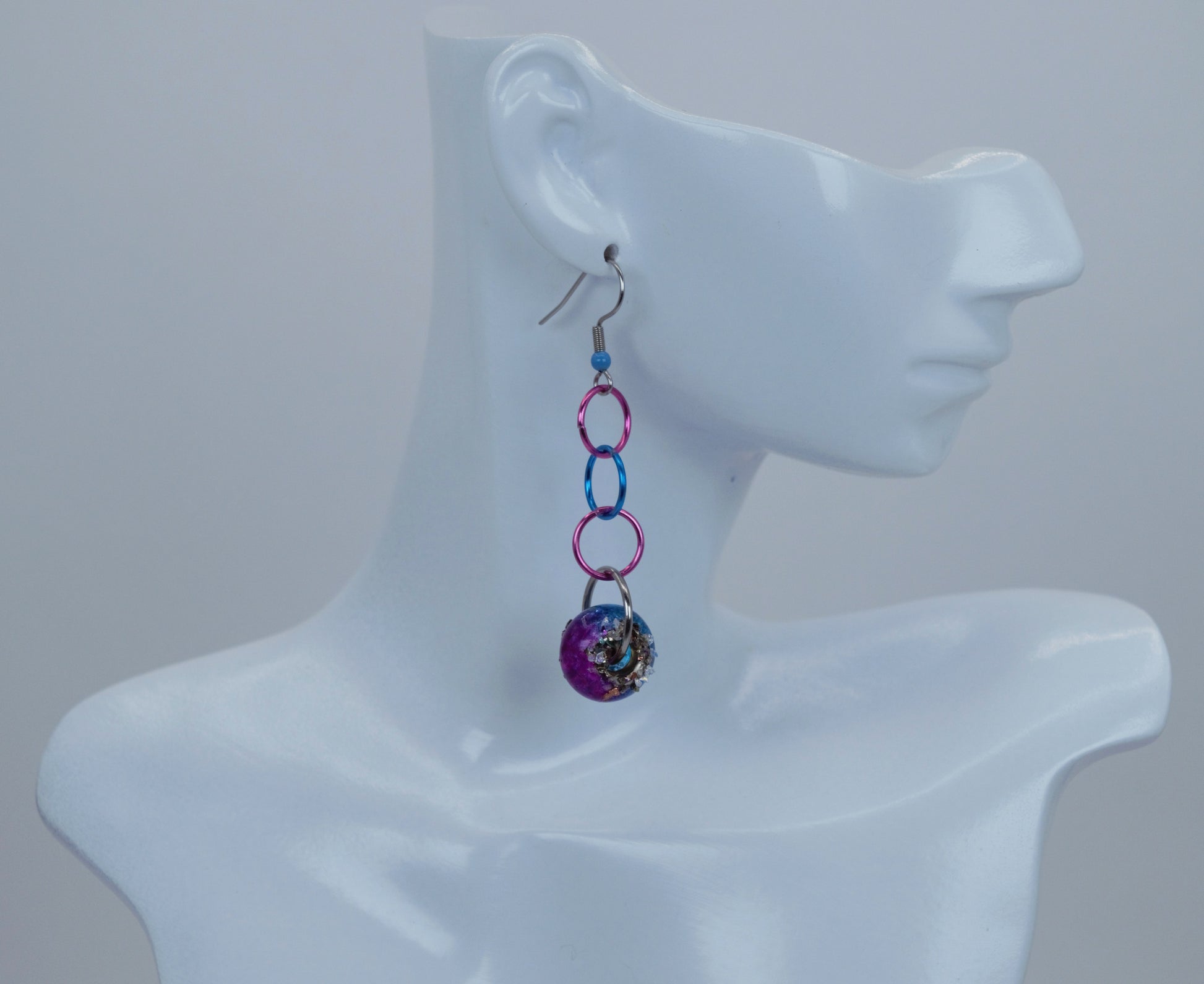 Fun! Bright! Lightweight! Perfect! A pair of earrings featuring four multicolored aluminum jump rings with a glass bead hanging at the end adorned with shard of broken colorful stone to add texture.