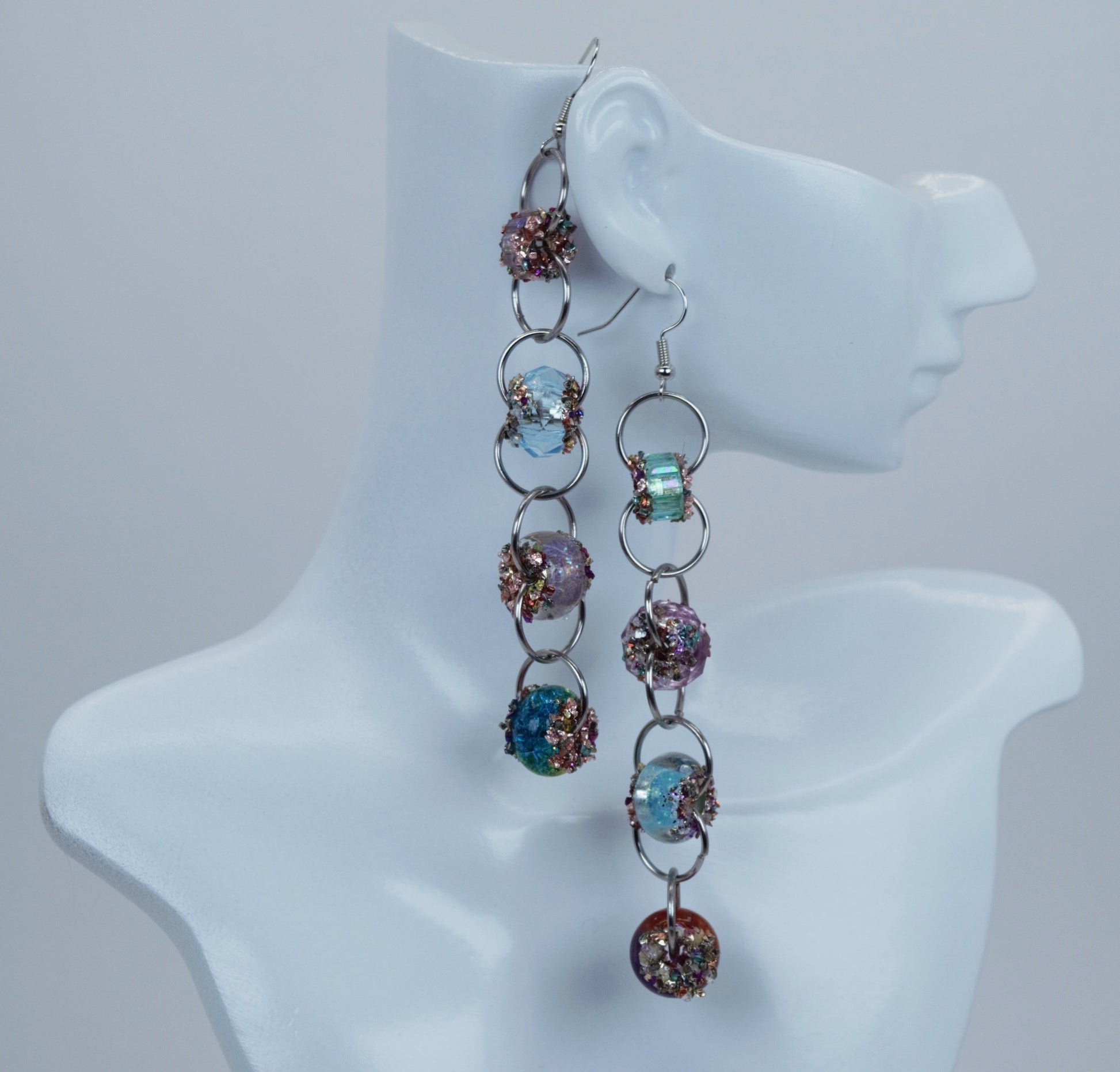 A pair of earrings featuring four multicolored glass beads with broken stone pieces around the bead opening for a textured appearance. The bead colors on both earrings are unique and different. Earrings are made from stainless steel and are hypoallergenic.