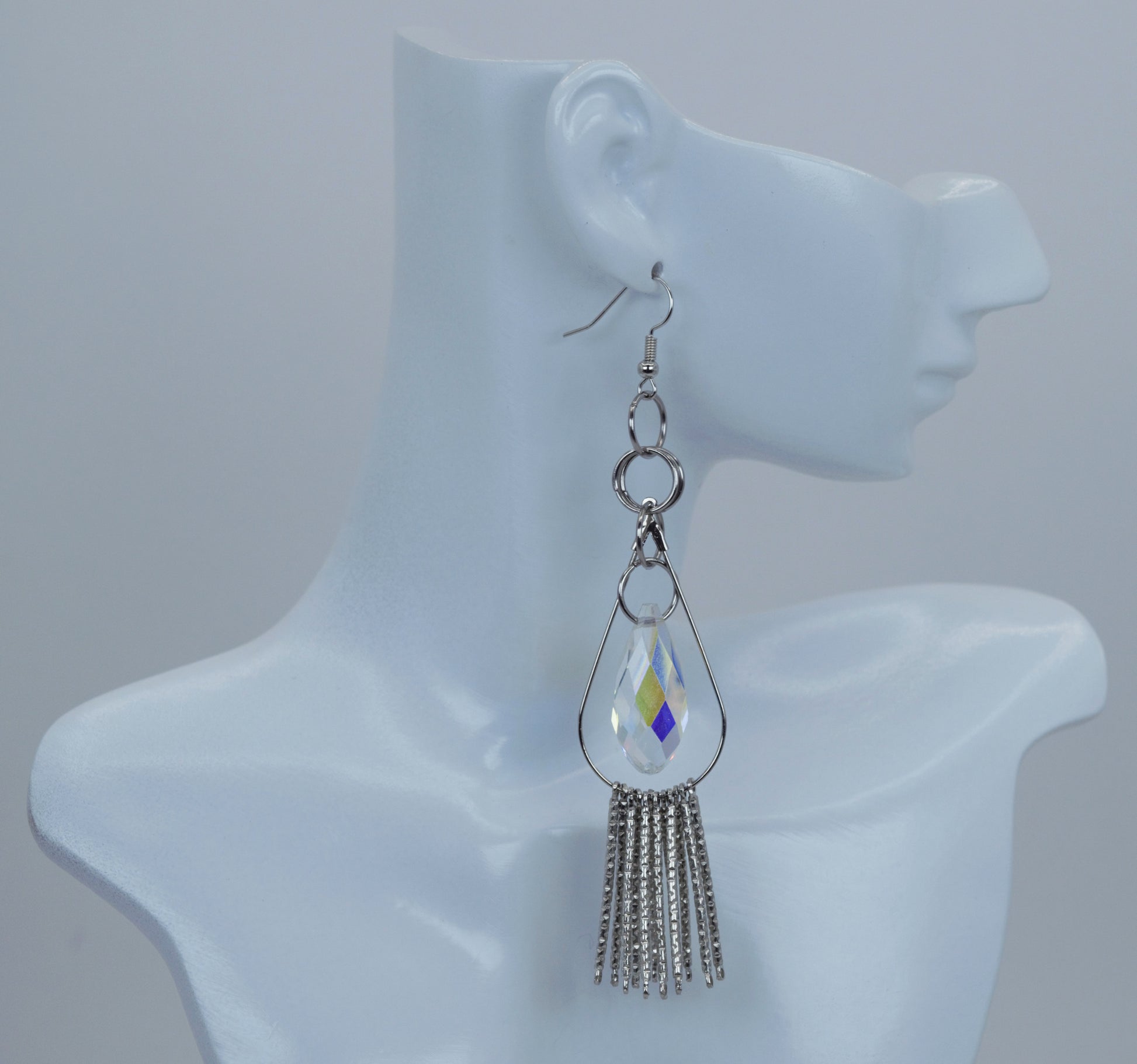 These eye-catching earrings featuring a faux crystal pendant that hangs within a large wire teardrop frame are lightweight and will add value and class to even the simplest outfit! The hook it hangs from is stainless steel and are hypoallergenic.