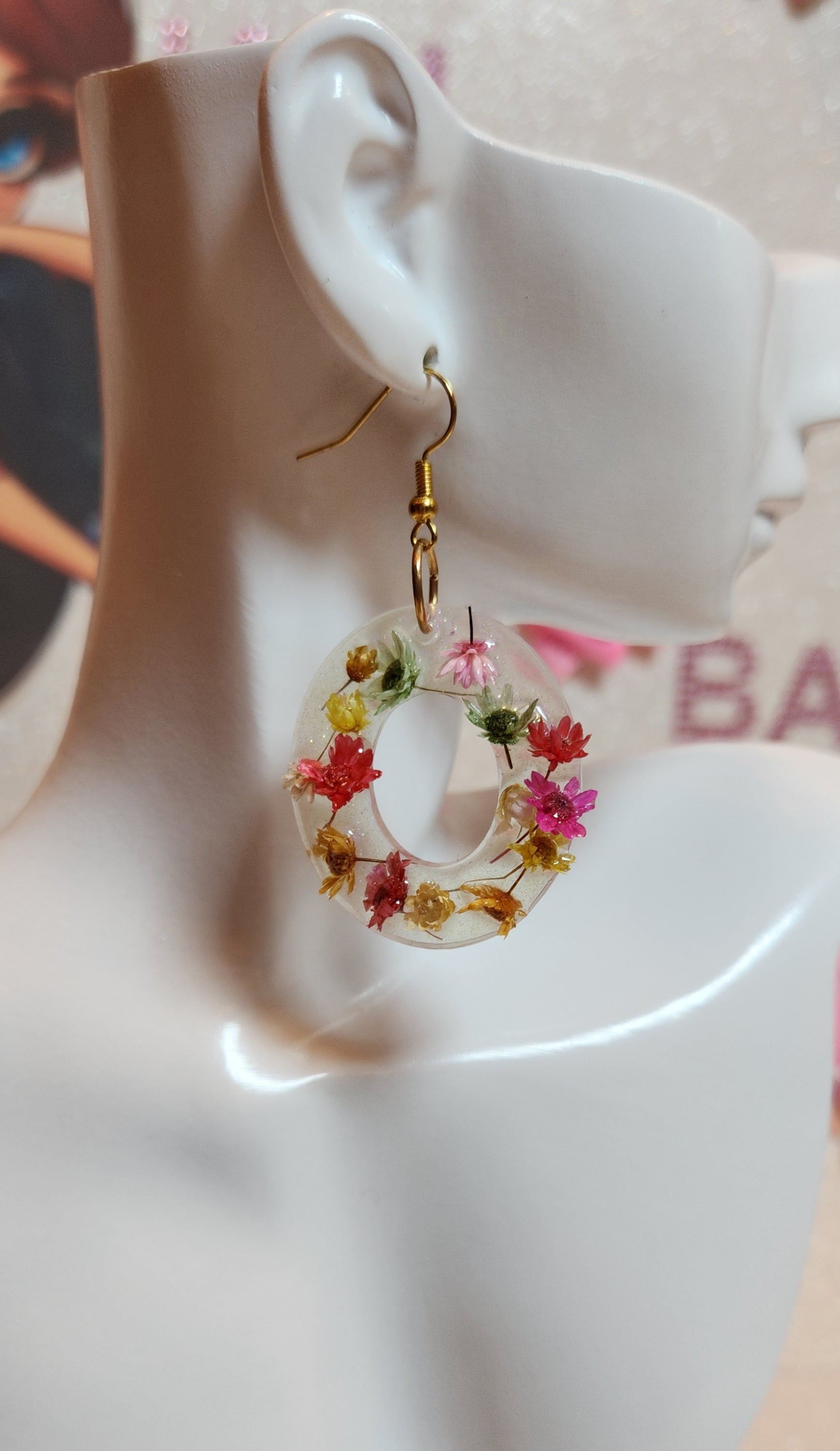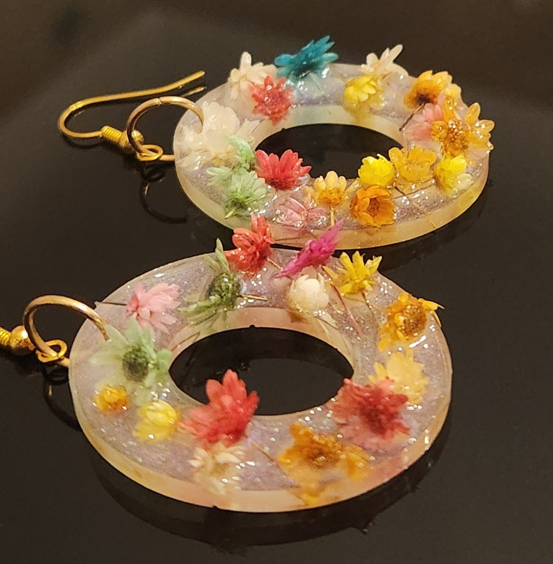 These lovely simple handcrafted earrings with real dried flowers preserved in resin are easy on the eye and show a sensitive side to your style. They hang from a steel gold hook and are lightweight on the earlobe. The flowers lay partially inside the resin earring and on top so they have a 3-D textured appearance.