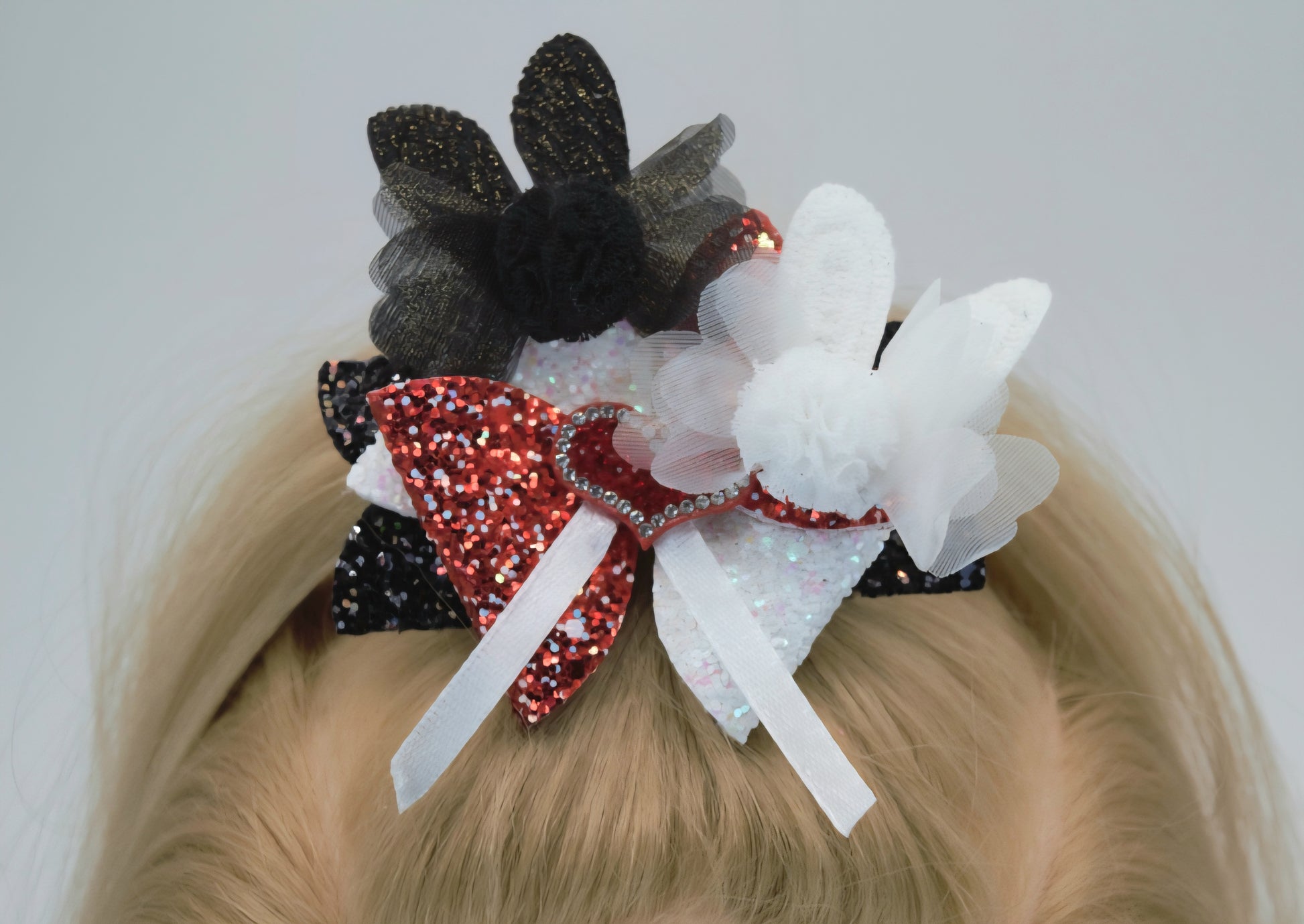 This handmade bow is great because... you get "2" bunnies!! Two soft cloth bunnies added to a pretty red, black and white textured glitter cloth hair bow, one satin ribbon, and one beautiful red rhinestone heart centerpiece is a lovely was to say, I ADORE ANIMALS! Especially, two bunnies!