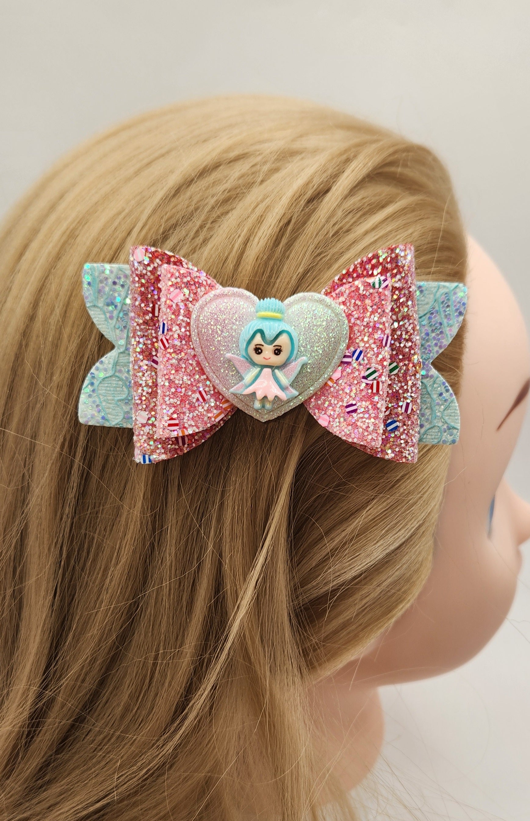 This adorable handmade cloth hair bow is perfect for that little girl who loves fairies and has a mystical side! This shimmery pink and blue bow is made from cloth, and the tiny fairy centerpiece is acrylic. The clip attached to this bow is steel and has teeth for better hold.
