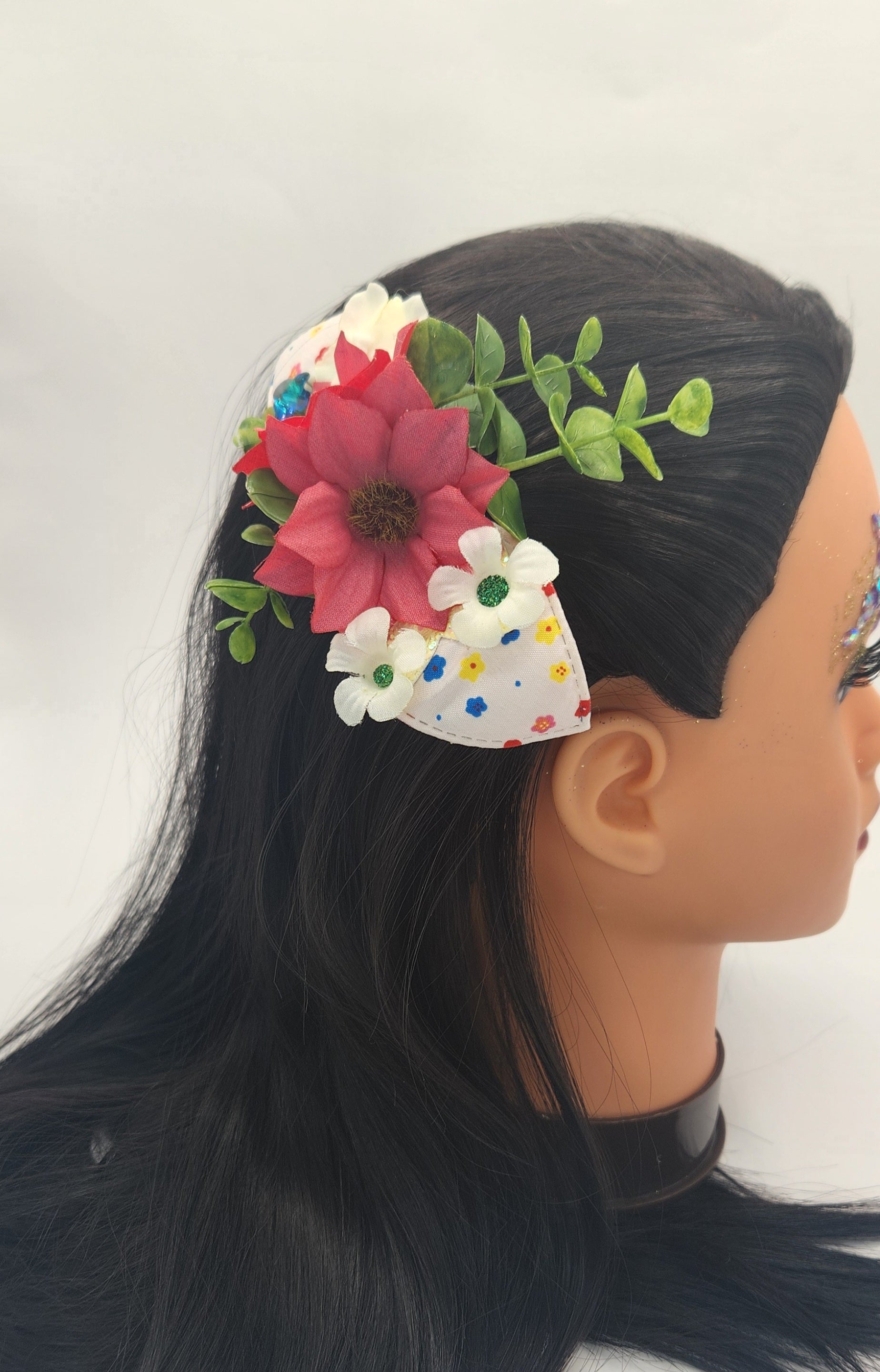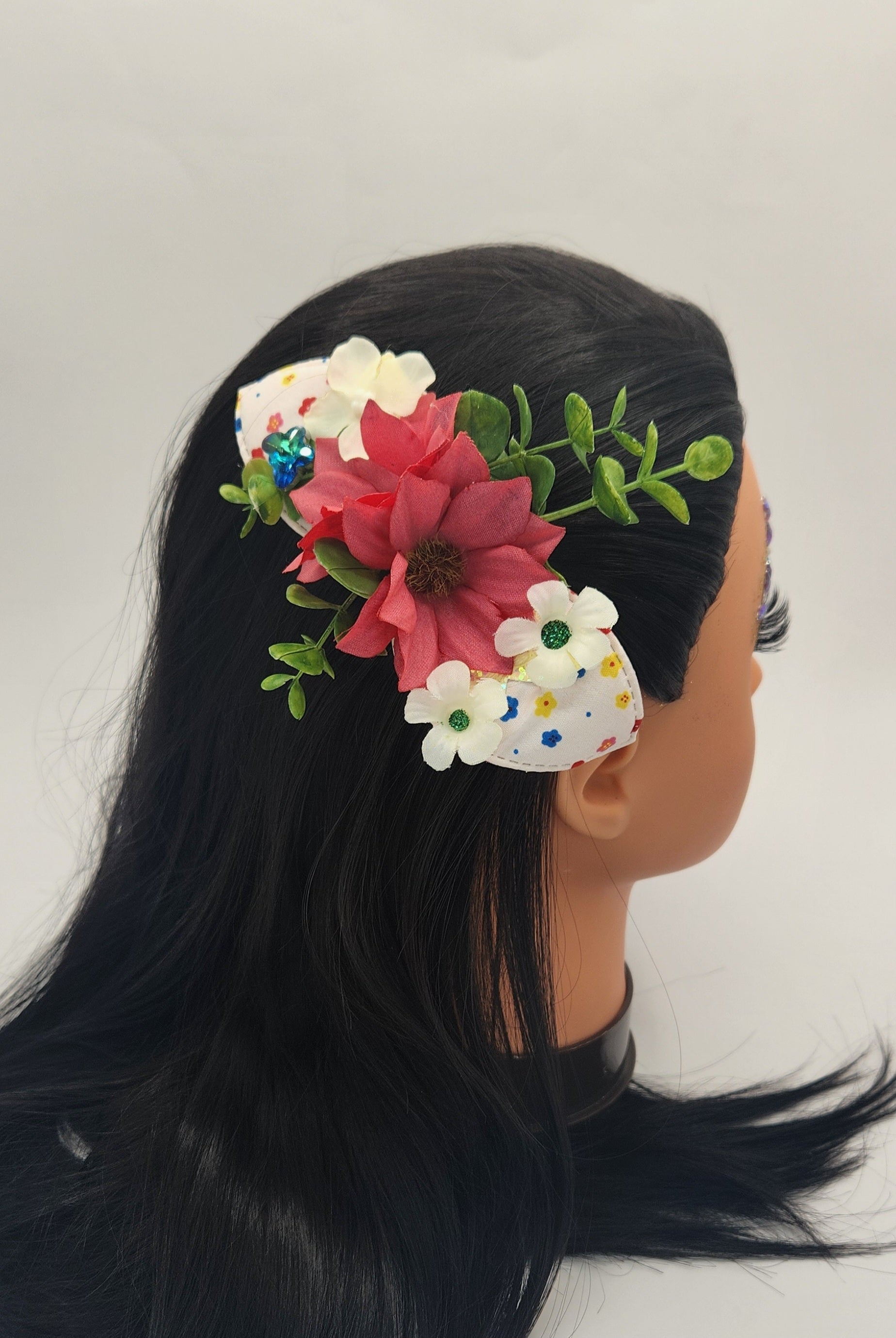 This feminine 5 1/2 in wide flower power handmade hair bow is quite lovely and is well suited for anyone's hair, from children to adulthood. This hair piece will add a floral softness to your finished style with multiple flowers, green stems, and a tiny blue faux crystal butterfly adorned on top of a flower pattern cloth bow.