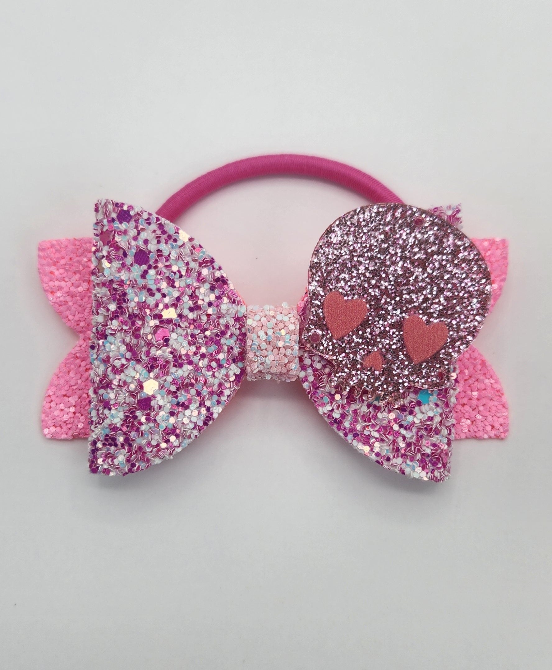 Skulls never looked so glamorous unless they are bright pink and glittery with cute heart shaped eyes! This glam skull head is atop a spotted cloth hair bow with an elastic band suited for anyone's hair type.