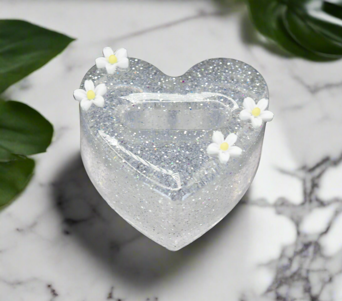 This handmade ring holder is perfect for that one special ring that has meaning and value that you want to protect from damages or losing. This shiney, glittery ring holder is adorned with multiple tiny acrylic white flowers for decoration.