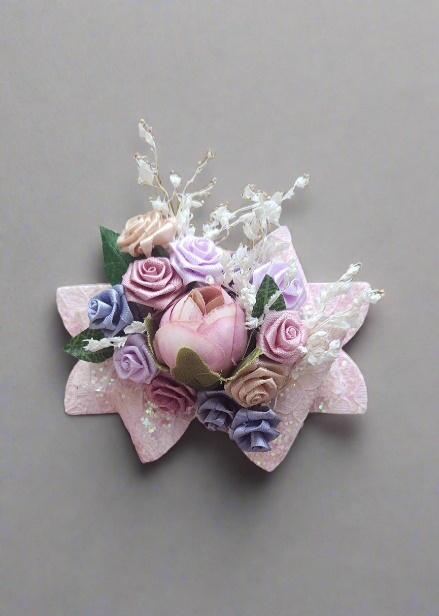 This beautiful handcrafted pink cloth hair bow with one large pink artificial rose centerpiece surrounded by mini multicolored roses constructed from ribbon with real dried delicate white sprigs is a lovely piece to wear to any occasion- big or small!