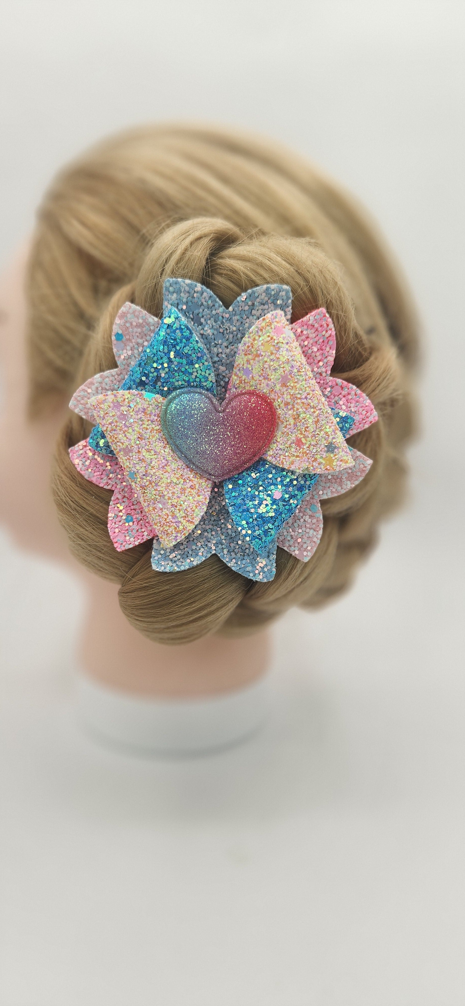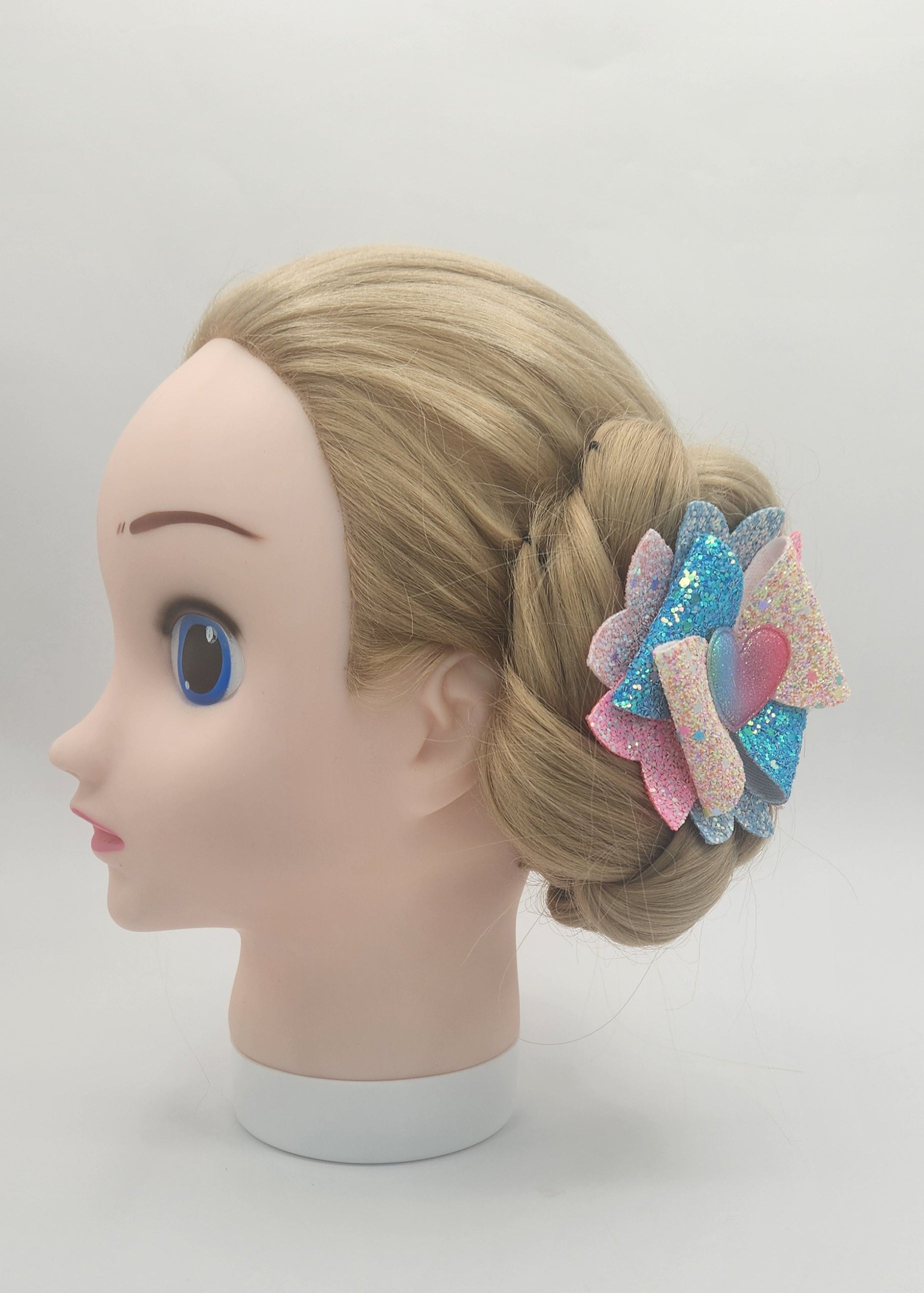 This sparkling pastel multicolored hair bow can be worn in any hairstyle, but it's designed to be on the flat side and fits directly in the center of a bun hairstyle. The light glittery colors and a pretty heart centerpiece is sure to draw attention your childs hairstyle. The clip attached to this bow is steel and has teeth for better hair gripping.