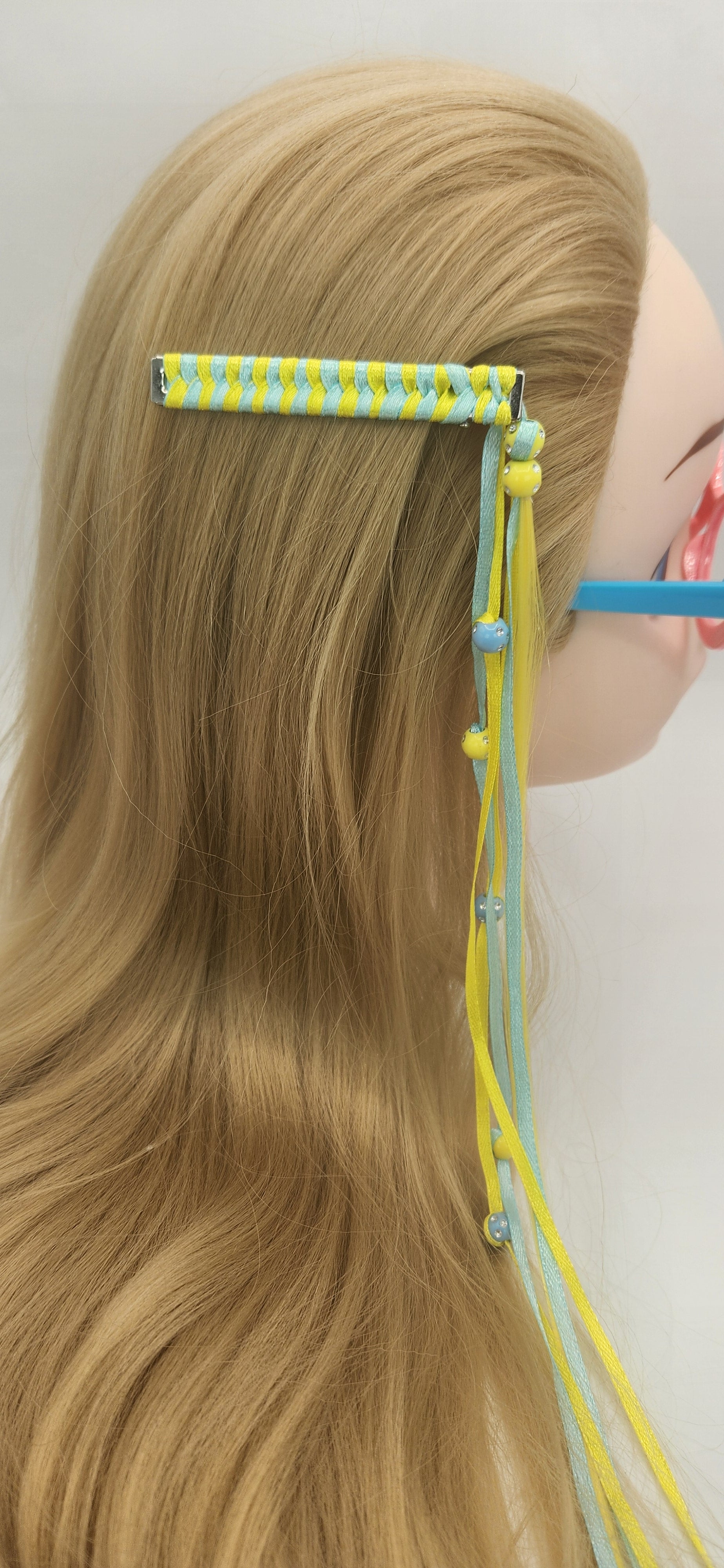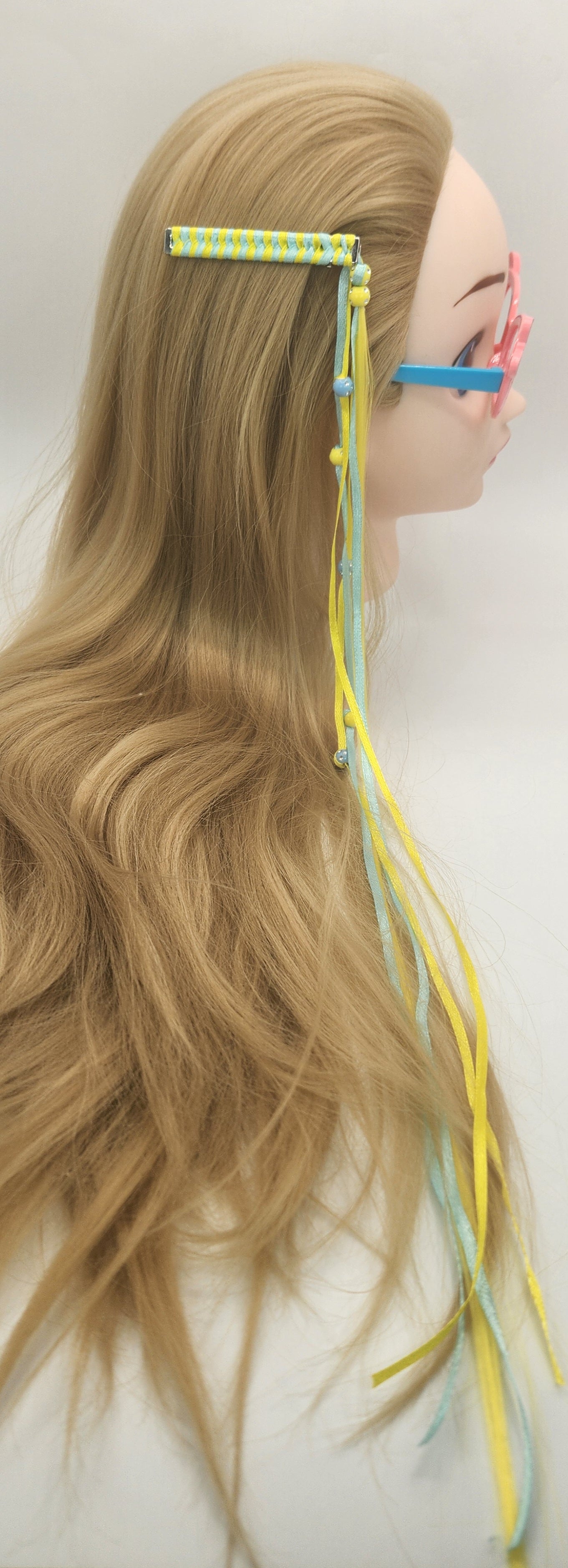 This handmade blue and yellow braided ribbon hair clip has excess ribbon free flowing from the ends with beads dangling to add some length and fun to your hair. There is a thin piece of yellow artificial hair hanging for creativity. The length of the ribbon overflow is an estimated 15inches long, artificial hair is an estimated 20inches