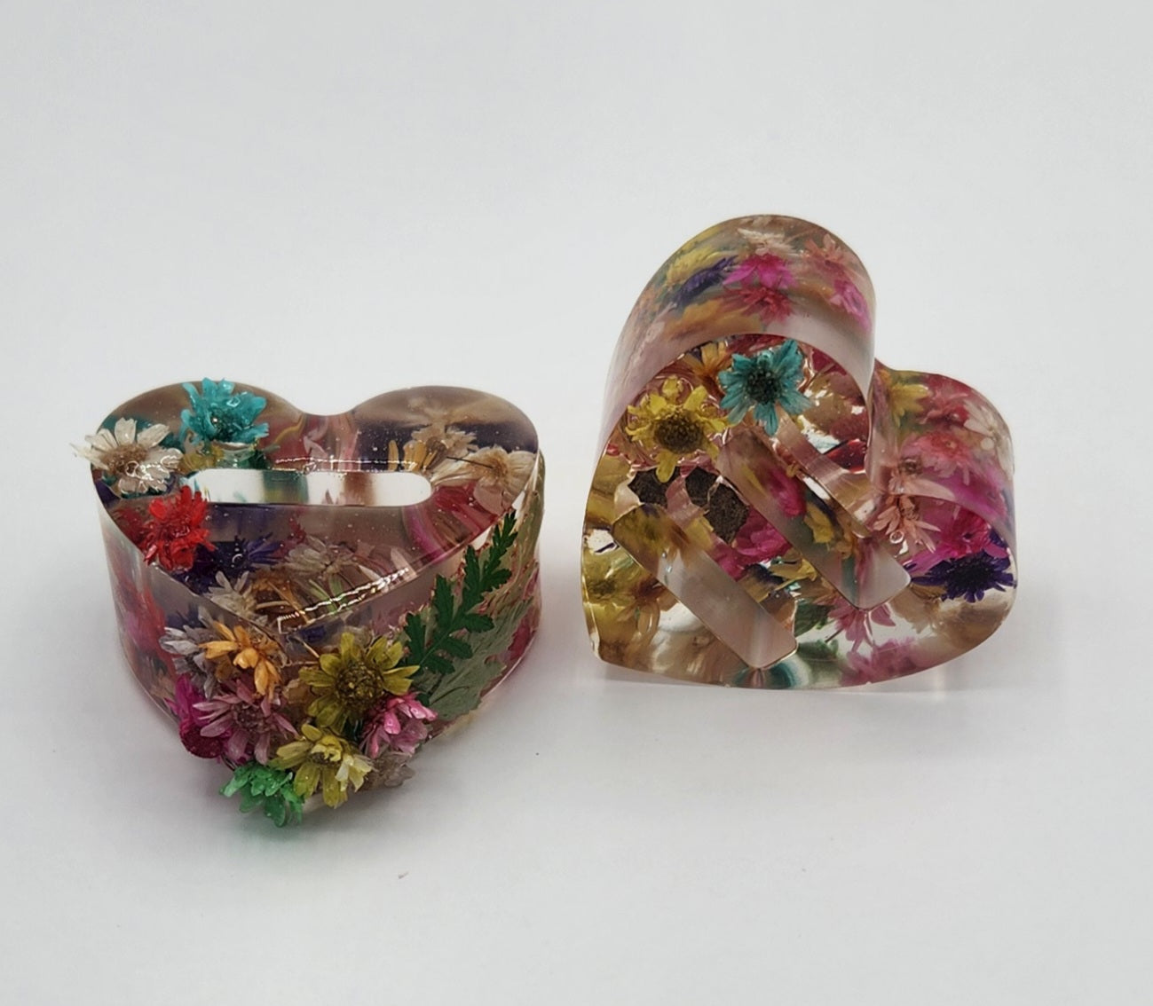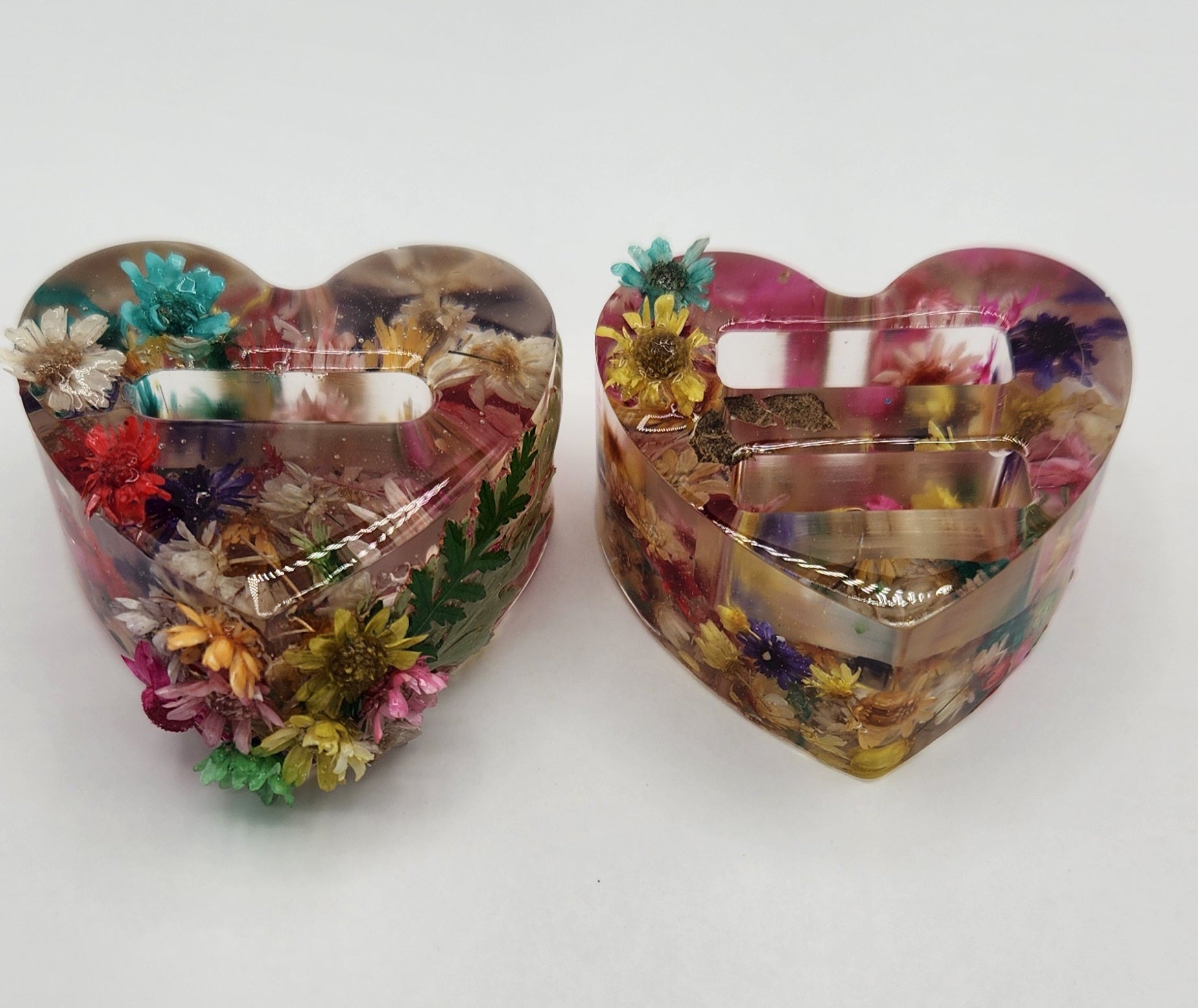 These handcrafted two resin heart-shaped ring holders are sold as a set. They are perfect for anyone who enjoys pretty, glossy items with flowers for a feminine touch. These holders are designed to prevent damages to your most precious rings.