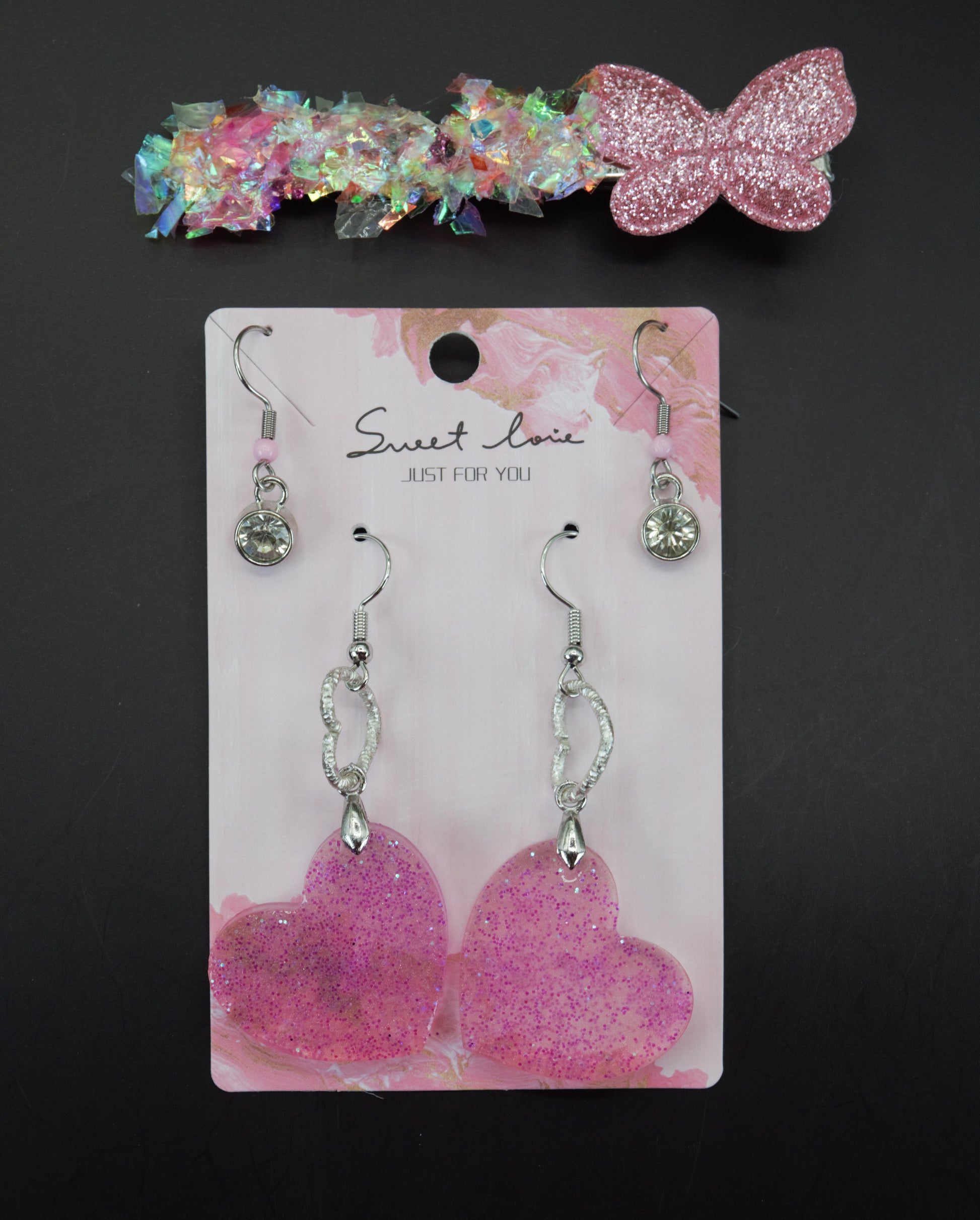 This set if great for anyone who loves pretty pink hearts and butterflies! This adorable handmade set has a youthful design. It comes with two pairs of earrings and one hair clip. The first pair of dangling heart shaped earrings are made from resin and layered with sparkly glitter. They hang from stainless steel hooks and have a steel heart shaped jump ring connecting the two. The second pair of dangle earrings are clear glass stone that also hang from stainless steel hooks. The hair clip which is attached to an alligator clip with teeth for better gripping has a cloth glitter butterfly and is piled high with iridescent confetti for a textured 3-D appearance and feel.
