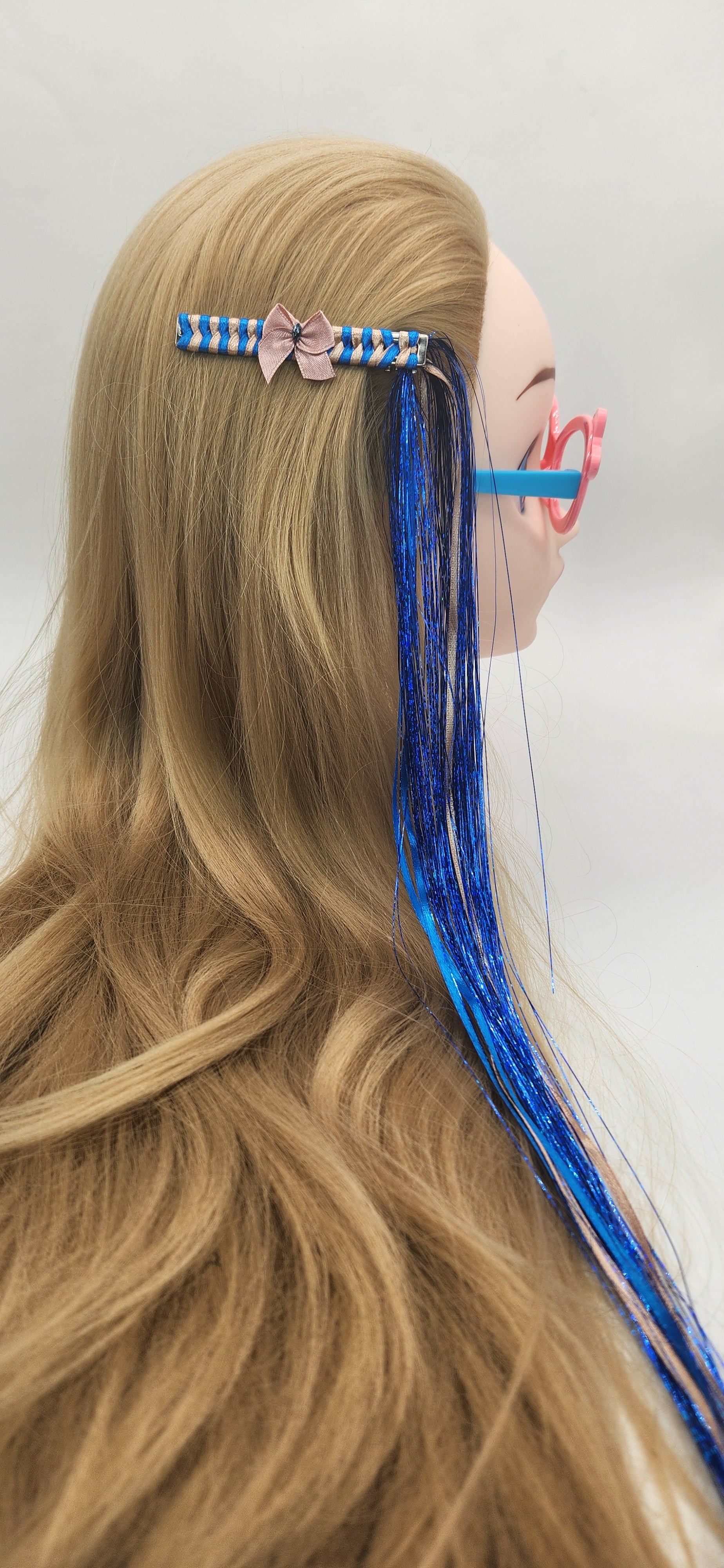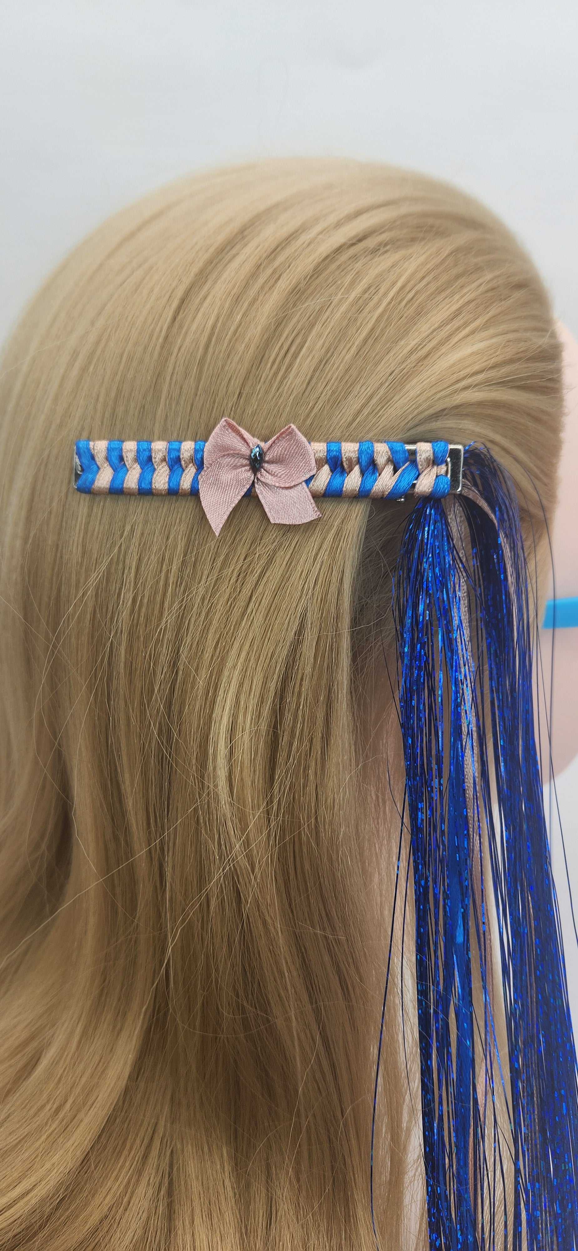 This handmade iridescent blue tassel hair clip with braided blue and tan ribbon is designed to add some fun for your hair. The tinsel and ribbon overflow is an estimated 23inches long.