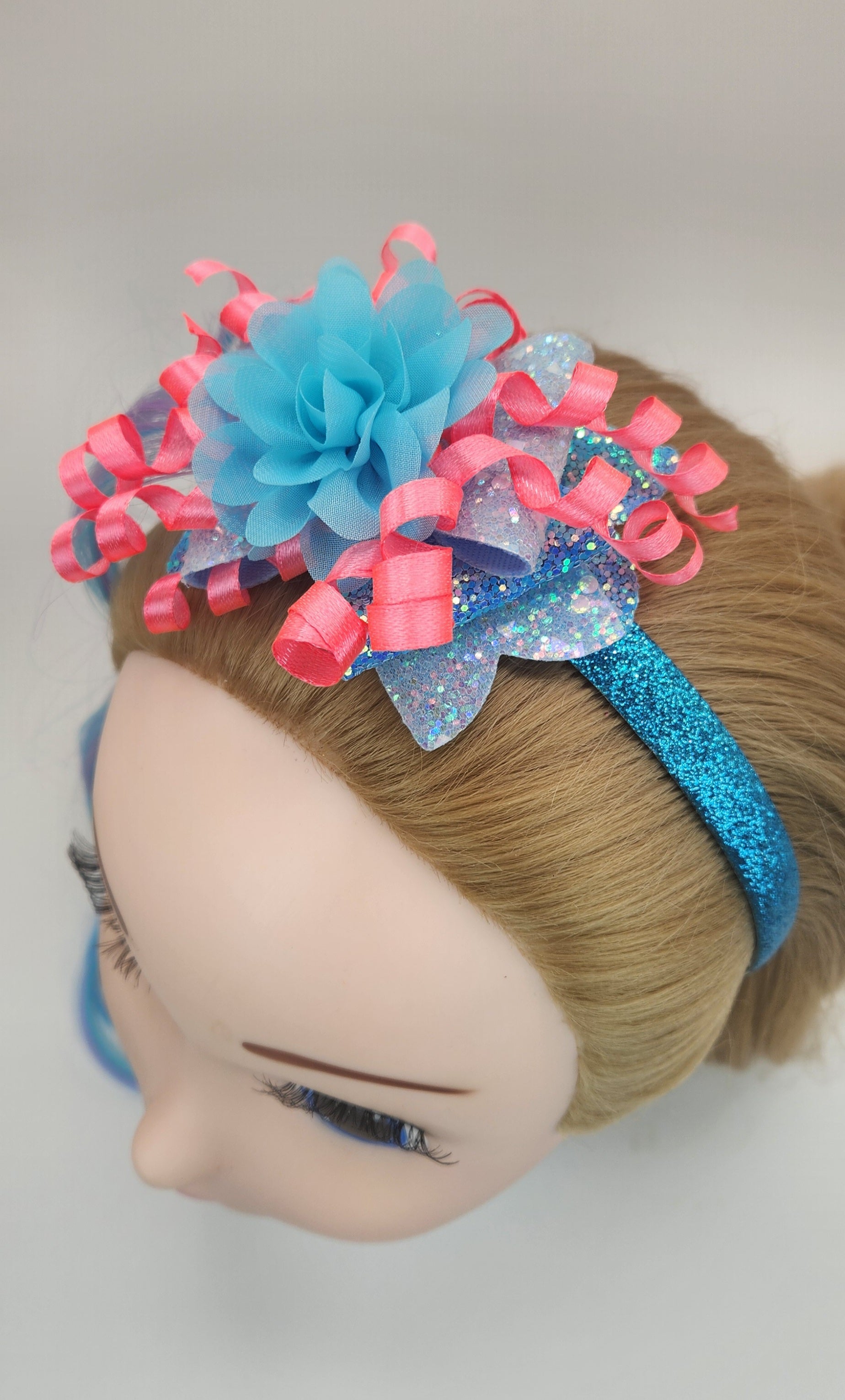Gorgeous handmade baby blue glittery iridescent cloth bow with baby pink Korker ribbon and artificial multicolored hair atop a glittery headband is adorable and sure to make a simple outfit appear more stunning! *Hair is roughly 16inches long.