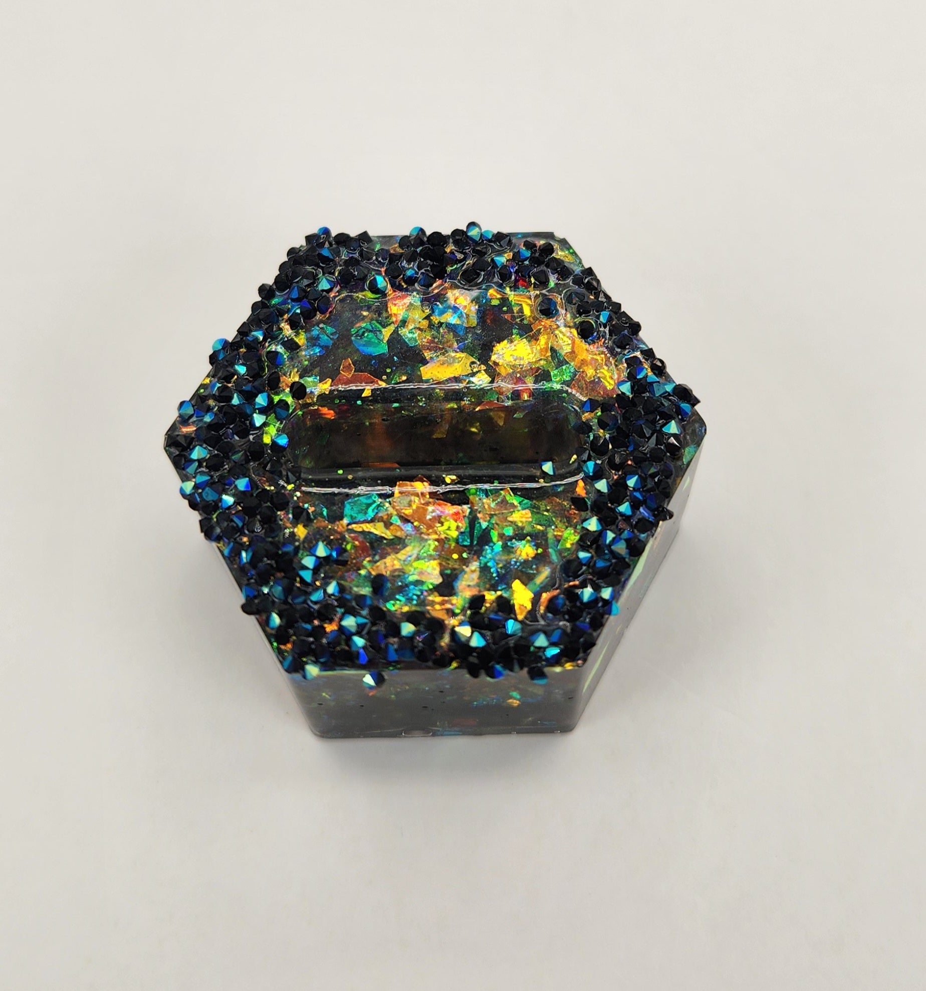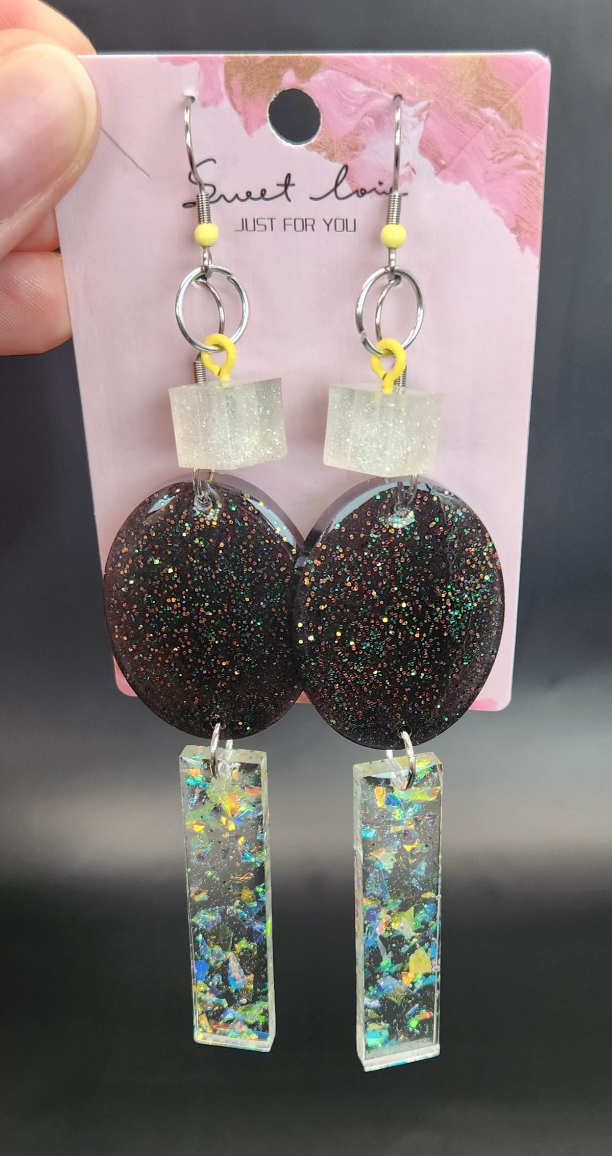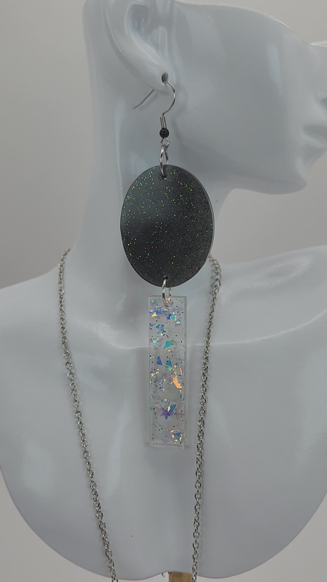 This sexy, shimmery set is perfect if you want to add some bold shine and style to make your look stand out. This set is handmade 100% from resin. It includes one clear shimmery iridescent confetti alligator hair clip with teeth. One black ring holder with iridescent confetti. Two pairs of earrings: one small dangling box shaped earrings with pale yellow glitter, that hang from stainless steel hooks. The second pair has two parts: the top oval section is black with blue, green, and gold glitter that also hang from stainless steel hooks. It attaches to the bottom with a stainless steel jump ring. The long bottom half rectangle has a glossy finish with iridescent flakes inside. And to top this set off for a complete look, it has one heart-shaped shimmery iridescent gold necklace with a heart-shaped black stainless steel chain.