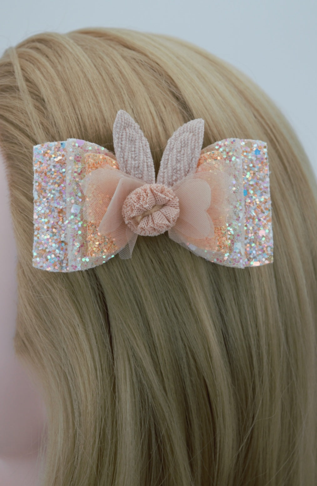 This handmade cloth layered bow with a soft tan bunny is simple, yet the iridescent textured glitter cloth adds a pretty sparkle to your hair. This hair bow is attached to a steel alligator clip with teeth for better hair gripping.