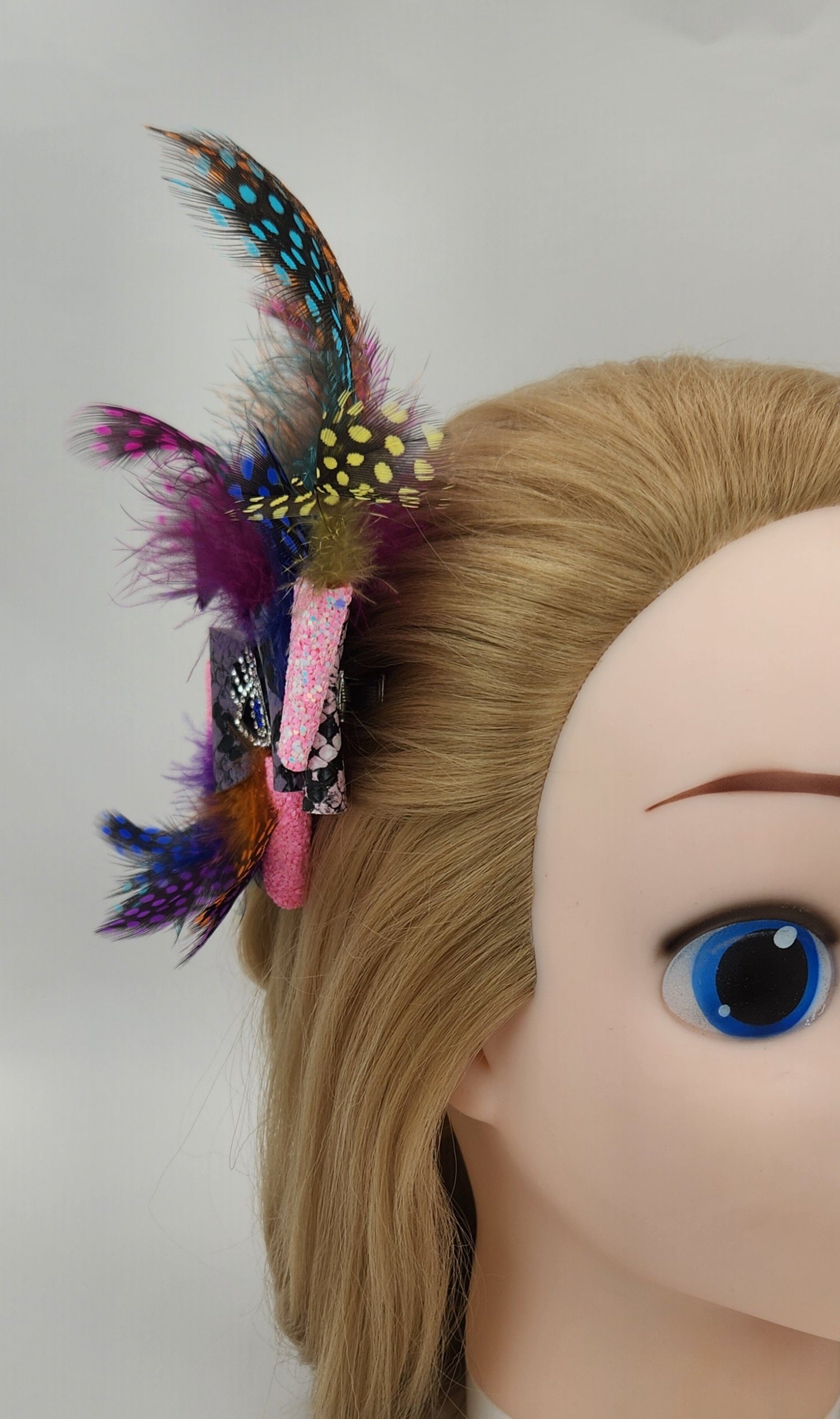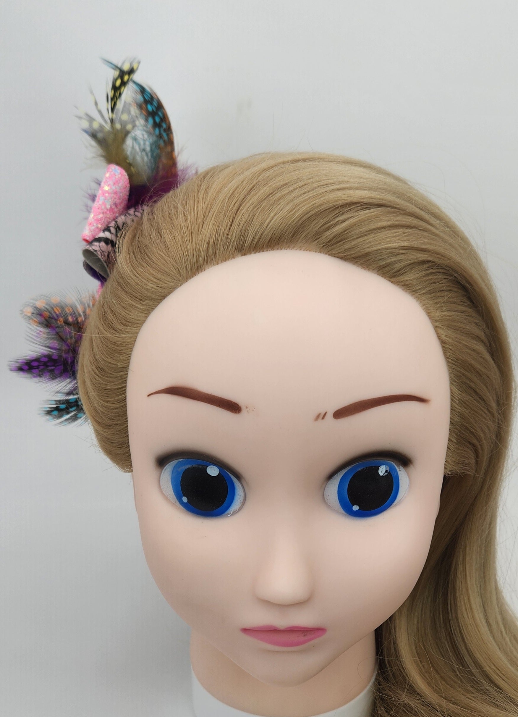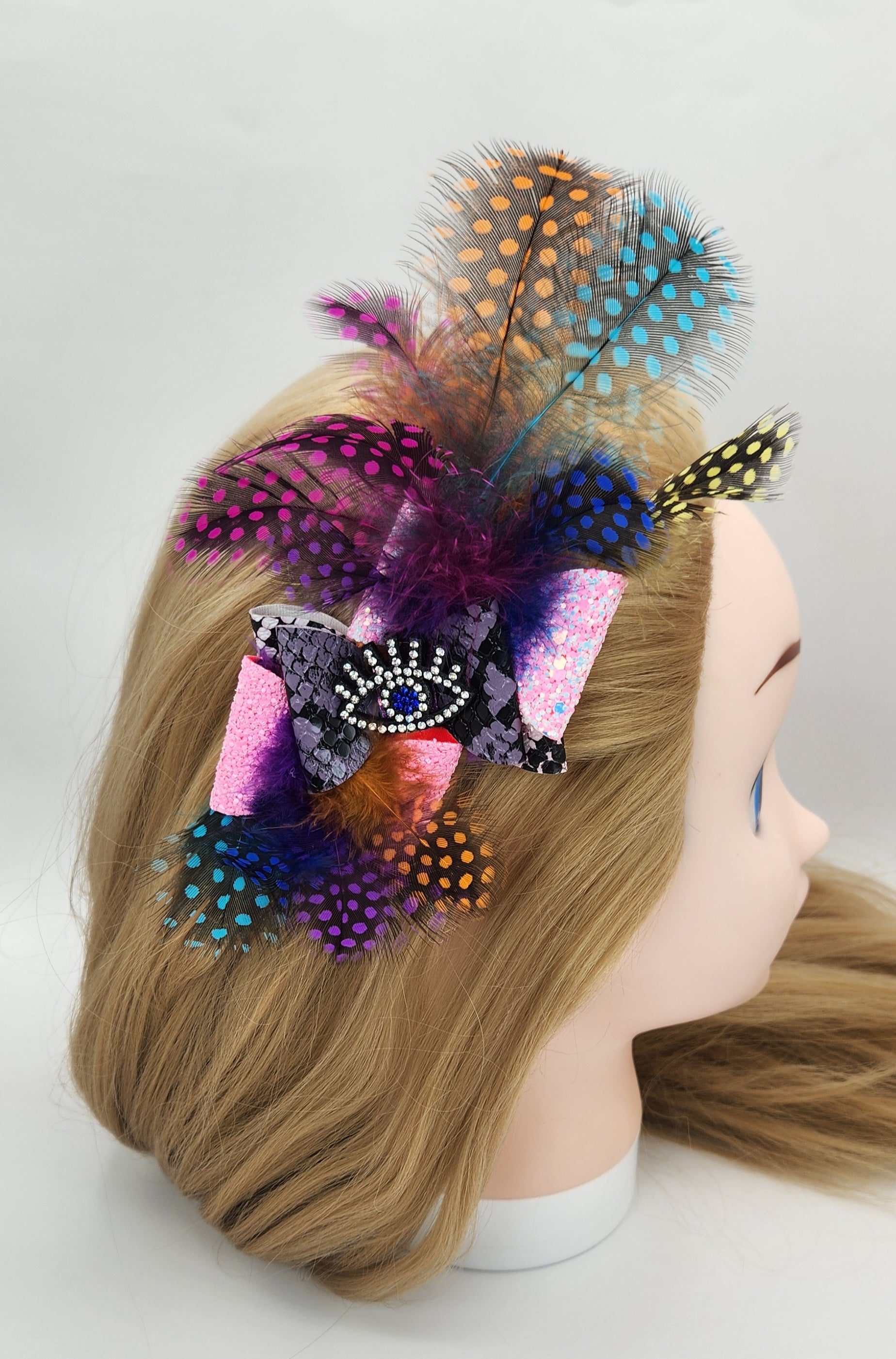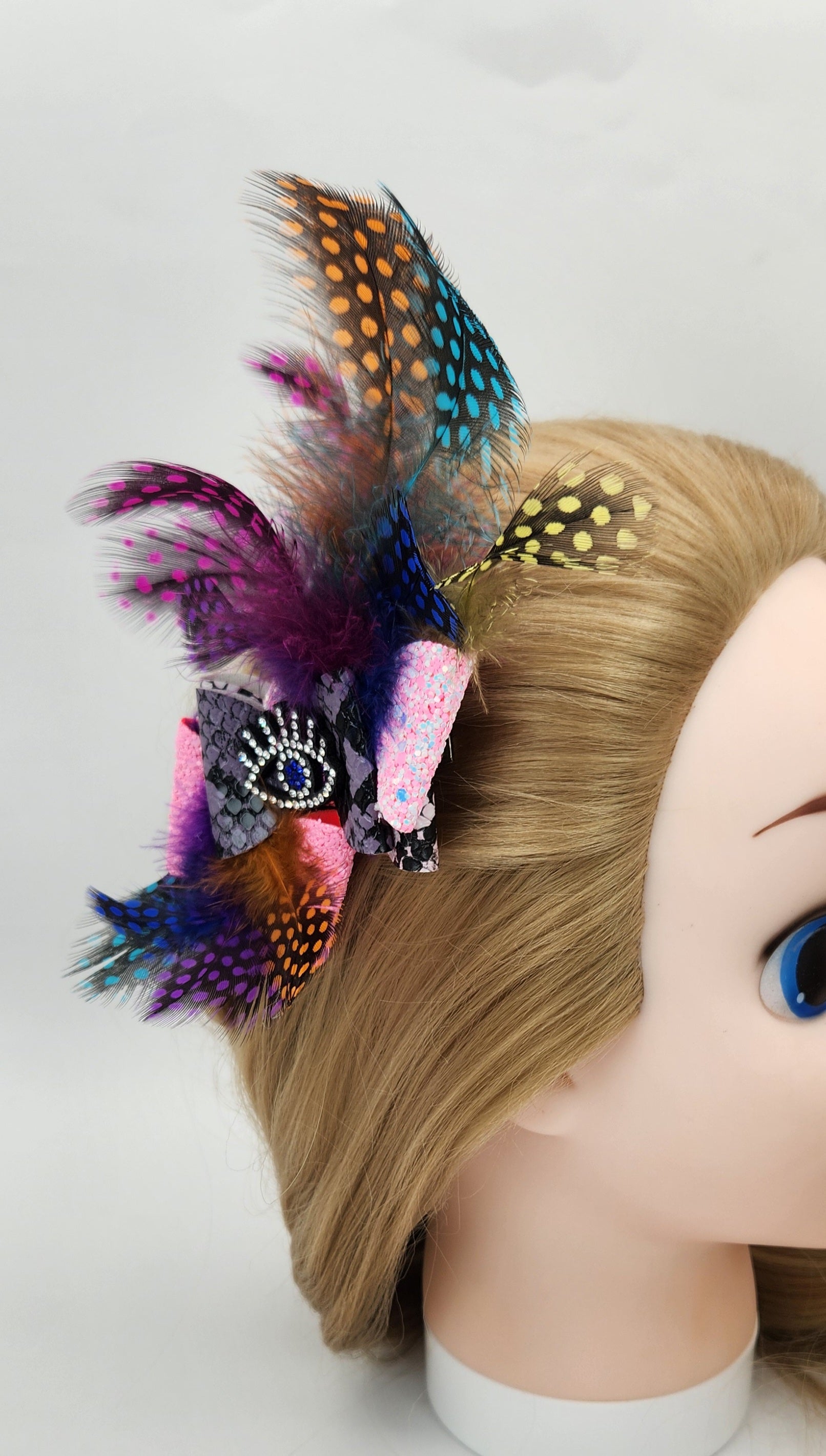 This multicolored tripple layered cloth hair bow with a rhinestone shaped eye as a centerpiece and faux feathers is a unique piece of hair art. This isn't your standard hair clip. This piece says, "EYE" have my own style and like to stand out in the crowd! The clip attached to this artistic handmade bow is steel and has teeth for better hair gripping.