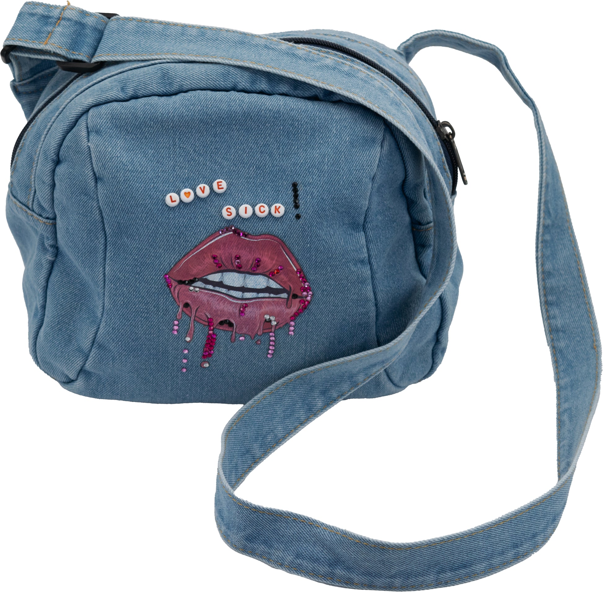 This denium modern cross body purse is perfect for someone who prefers to carry a small simple on-the-go bag. The adjustable cross body strap makes this accessible and convenient. There is a zipper across the top for privacy and security, with two pouches inside: one with a zipper. The cool stylish oozing sick lips give this bag an edgey look for that modern chick!