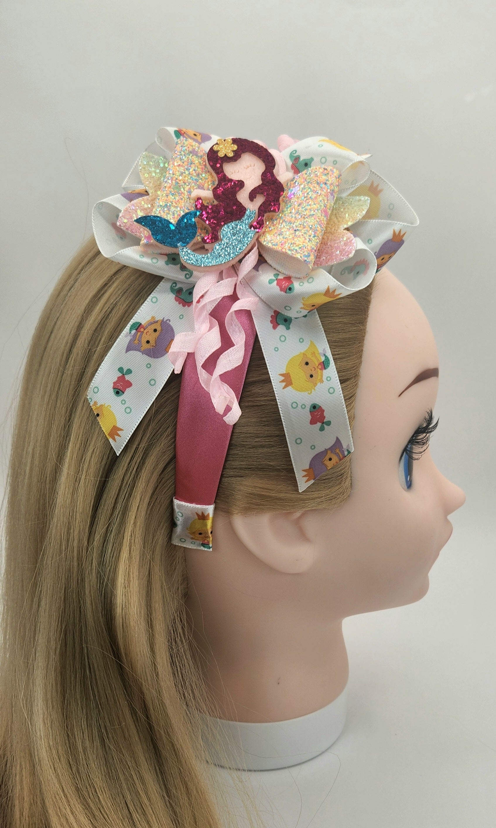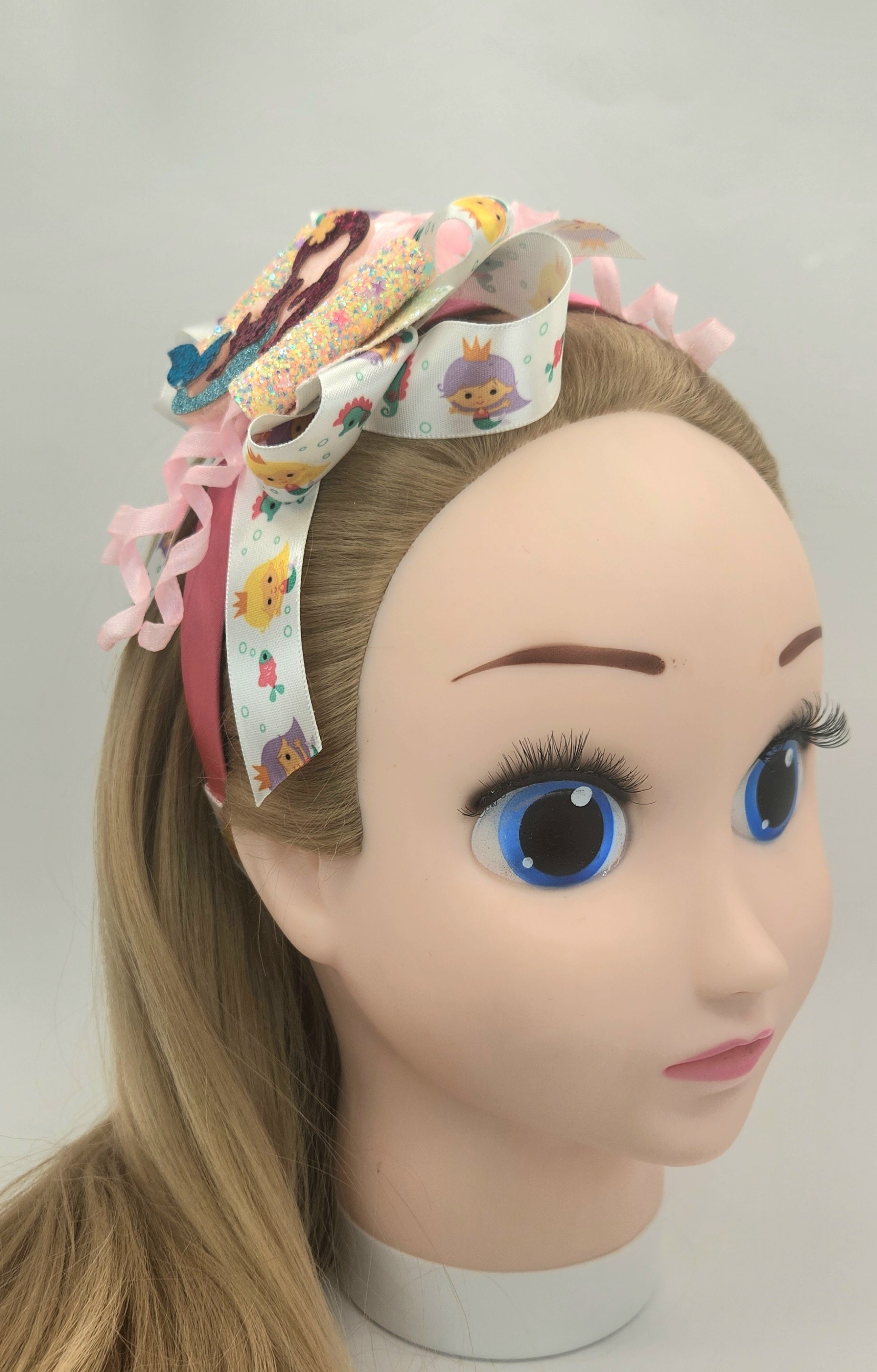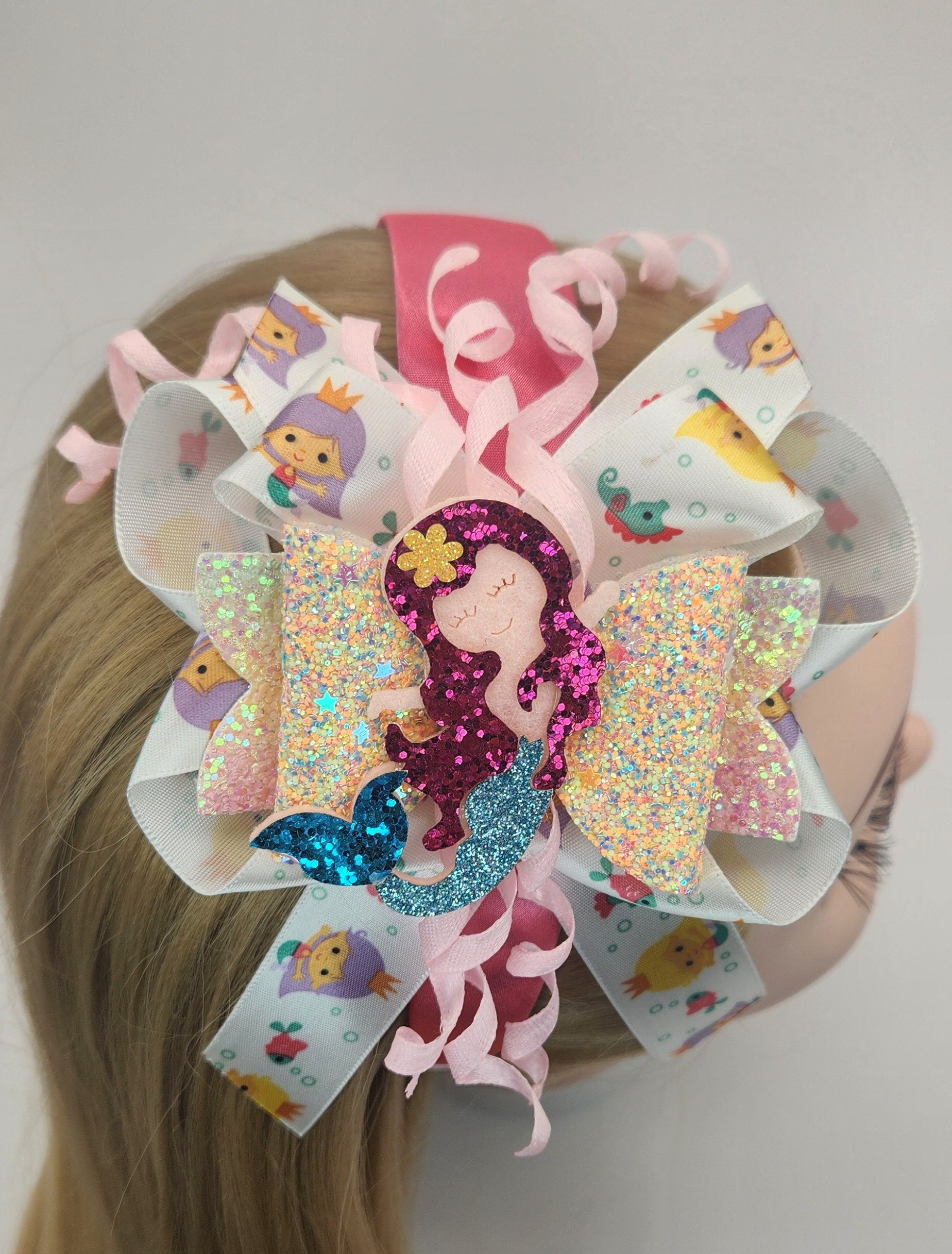 This thick pink satin handcrafted headband with a large ribbon bow featuring mermaids, and a speckled cloth bow as a centerpiece, topped off with a glitter felt mermaid is 100% the most adorable headband your little sea-lover with adore!