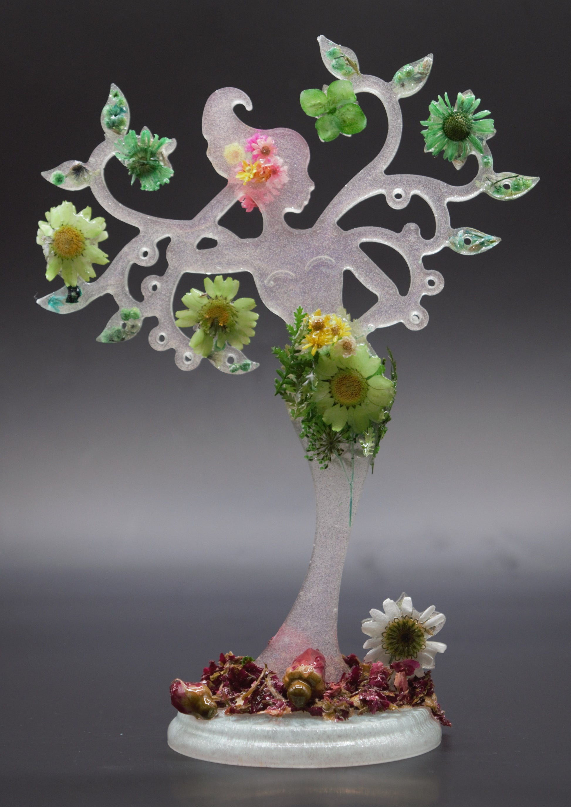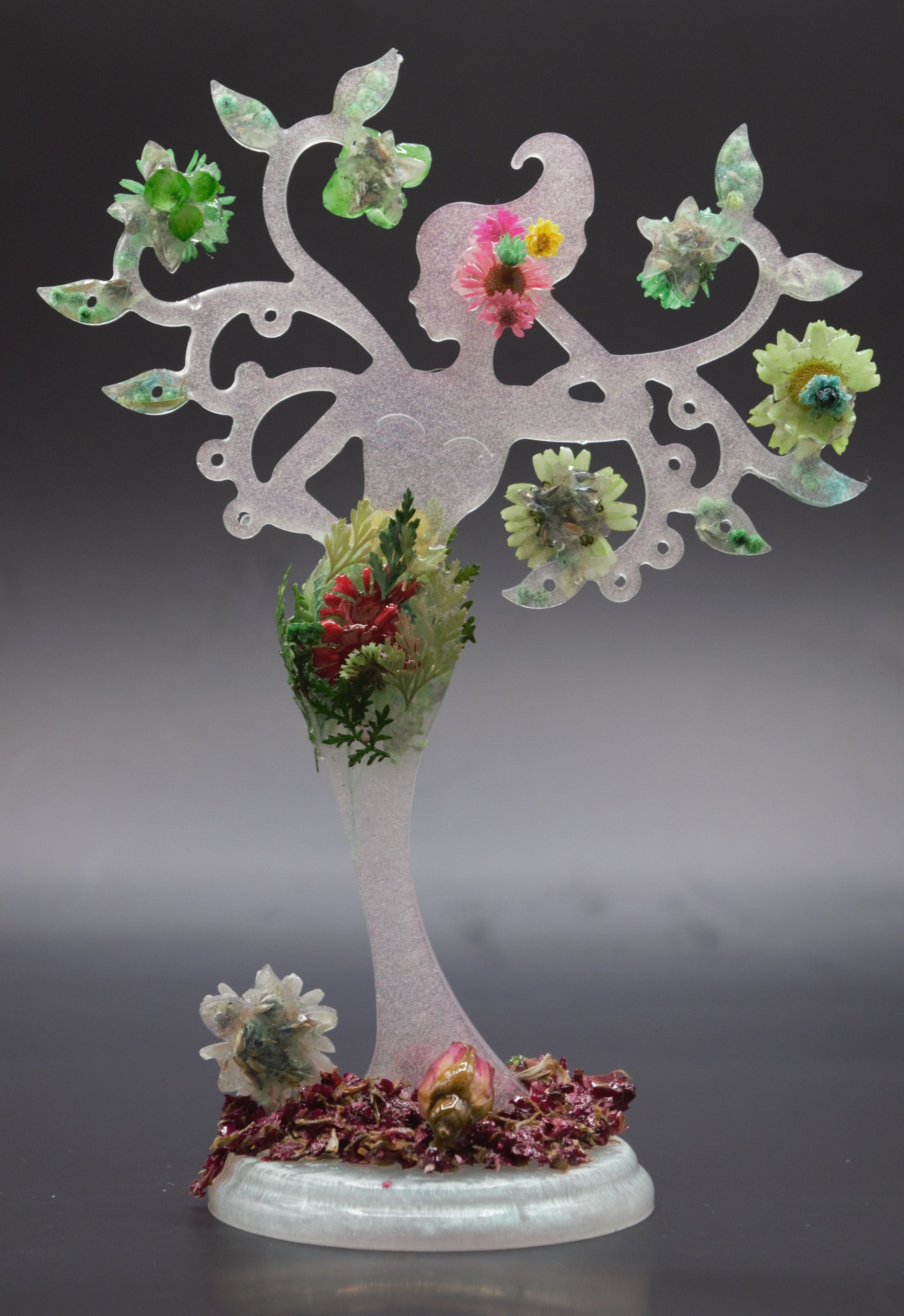This mother nature display stand is made from resin with real, dried flowers. This piece is perfect for someone who loves flowers and nature. The Mother Nature Tree display stand was created to display or showcase jewelry. The base is embellished with crushed, dried rose with three whole dried roses. Both side are designed with different flowers and colors. The real dried flowers are fragile even though they are covered with resin, and the display stand should be handled with care. *PLEASE NOTE THAT THE TREE STAND IS NOT DESIGNED TO HOLD HEAVY ITEMS.