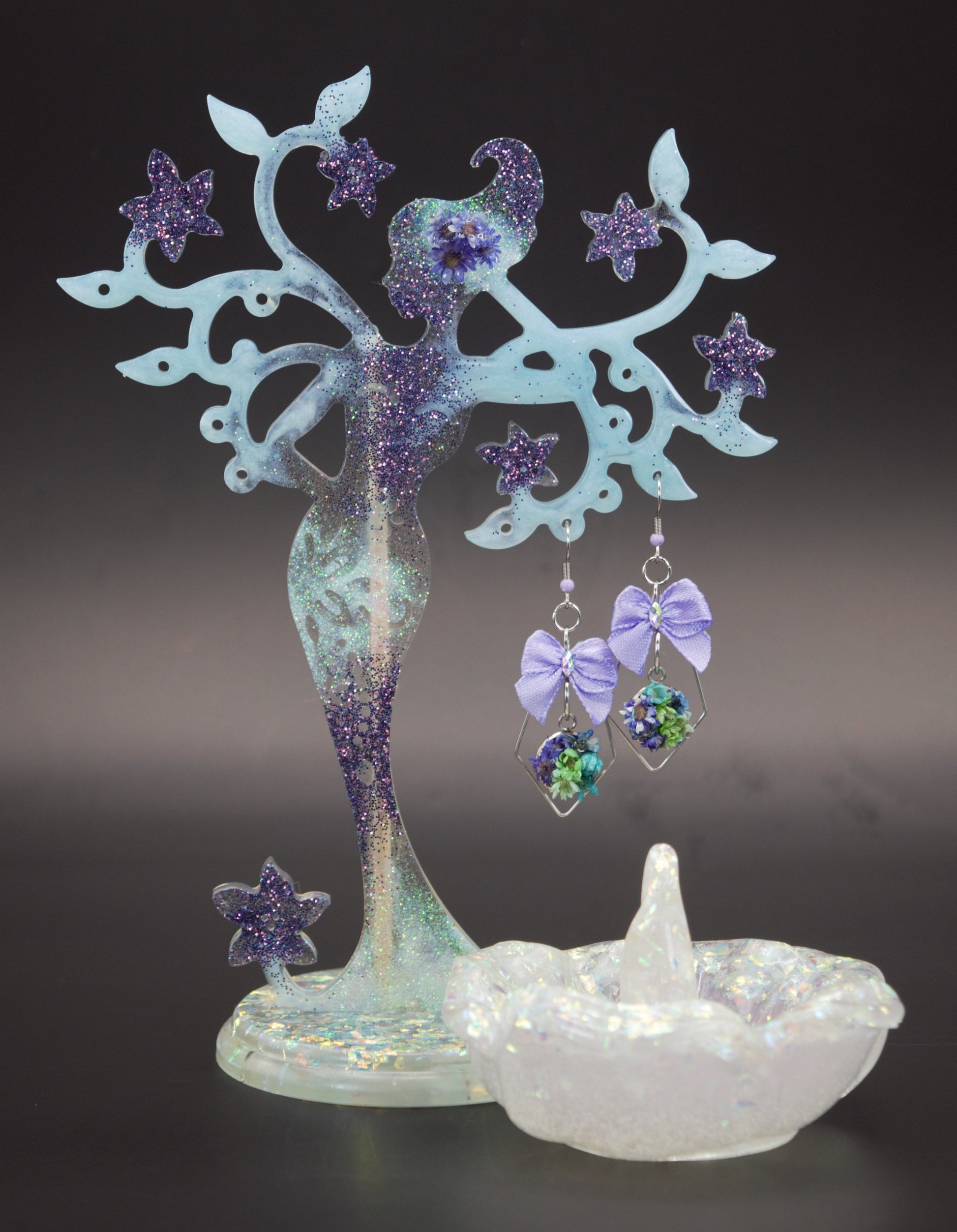 This display stand set comes with a pair of earrings and a jewelry dish. The Mother Nature Tree display stand was created to display or showcase jewelry. The stand has real dried purple flowers coated in resin as a decorative hair piece. The earrings have a steel frame decorated with a purple bow and a steel circular centerpiece containing real dried flowers, coated in resin. The jewelry dish is made of resin with iridescent confetti and silver glitter. * PLEASE NOTE THAT THE TREE STAND IS NOT DESIGNED TO HOLD HEAVY ITEMS.