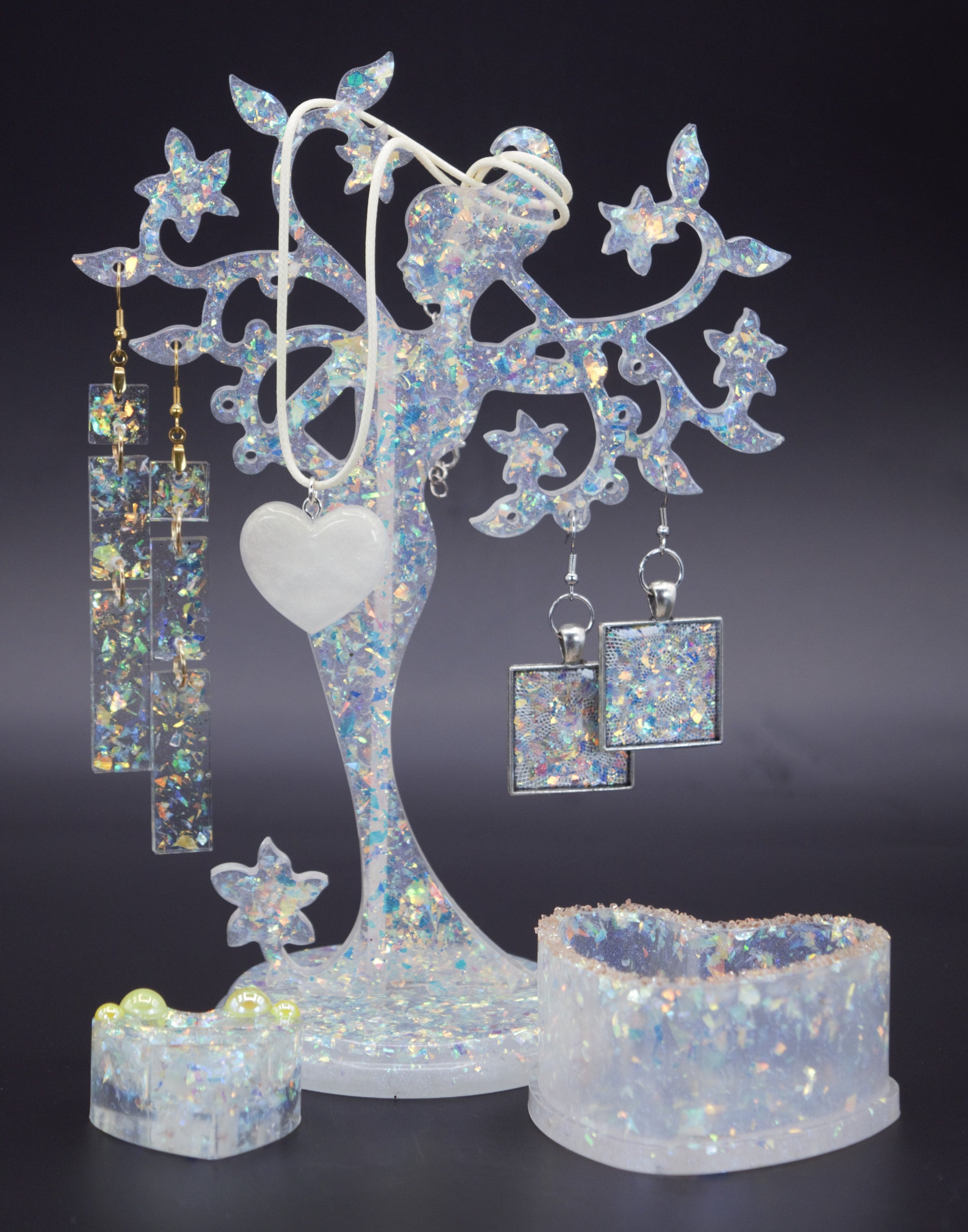 Mother Nature Resin Tree Stand Set - Clear w/ Iridescent Confetti with Jewelry and Jewelry Dishes