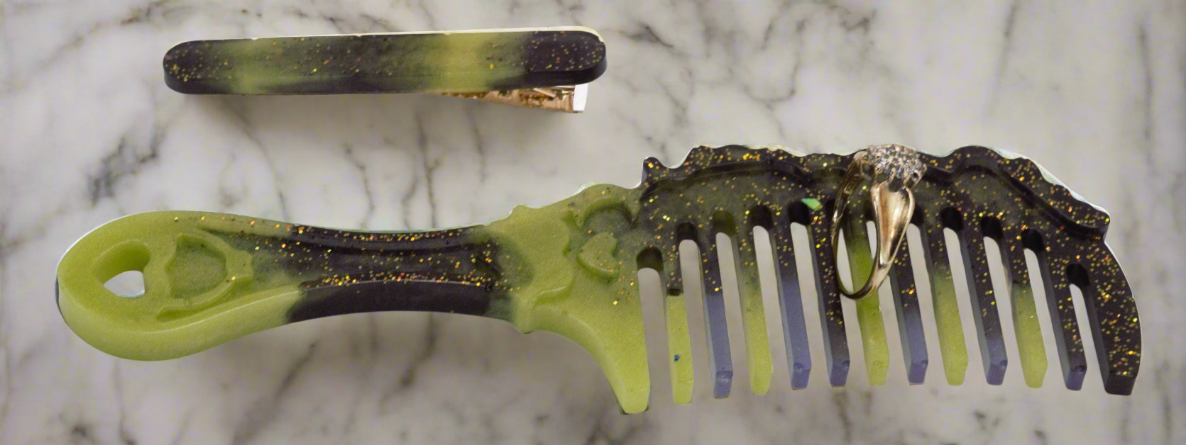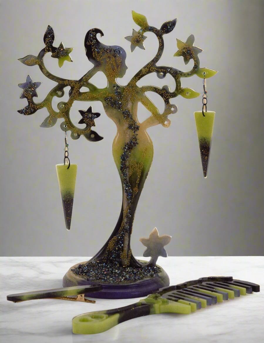 This set is made 100% from resin. The Mother Nature Tree display stand was created to showcase jewelry. It comes with a pair of earrings, a comb inspired ring holder, and a hair clip. The earrings are triangular shaped transitioning from lime green to black with glitter-speckles on the end and have hypoallergenic stainless steel hooks. The hair clip is pale green and black with speckles of glitter and has teeth for better hair gripping. The comb is not designed to go thru hair due to the teeth are too thick. This comb is designed to hold rings between the teeth, as shown in the photo. *PLEASE NOTE THAT THE RING IN THE PHOTO IS USED AS AN EXAMPLE ONLY AND NOT INCLUDED IN THIS SET!