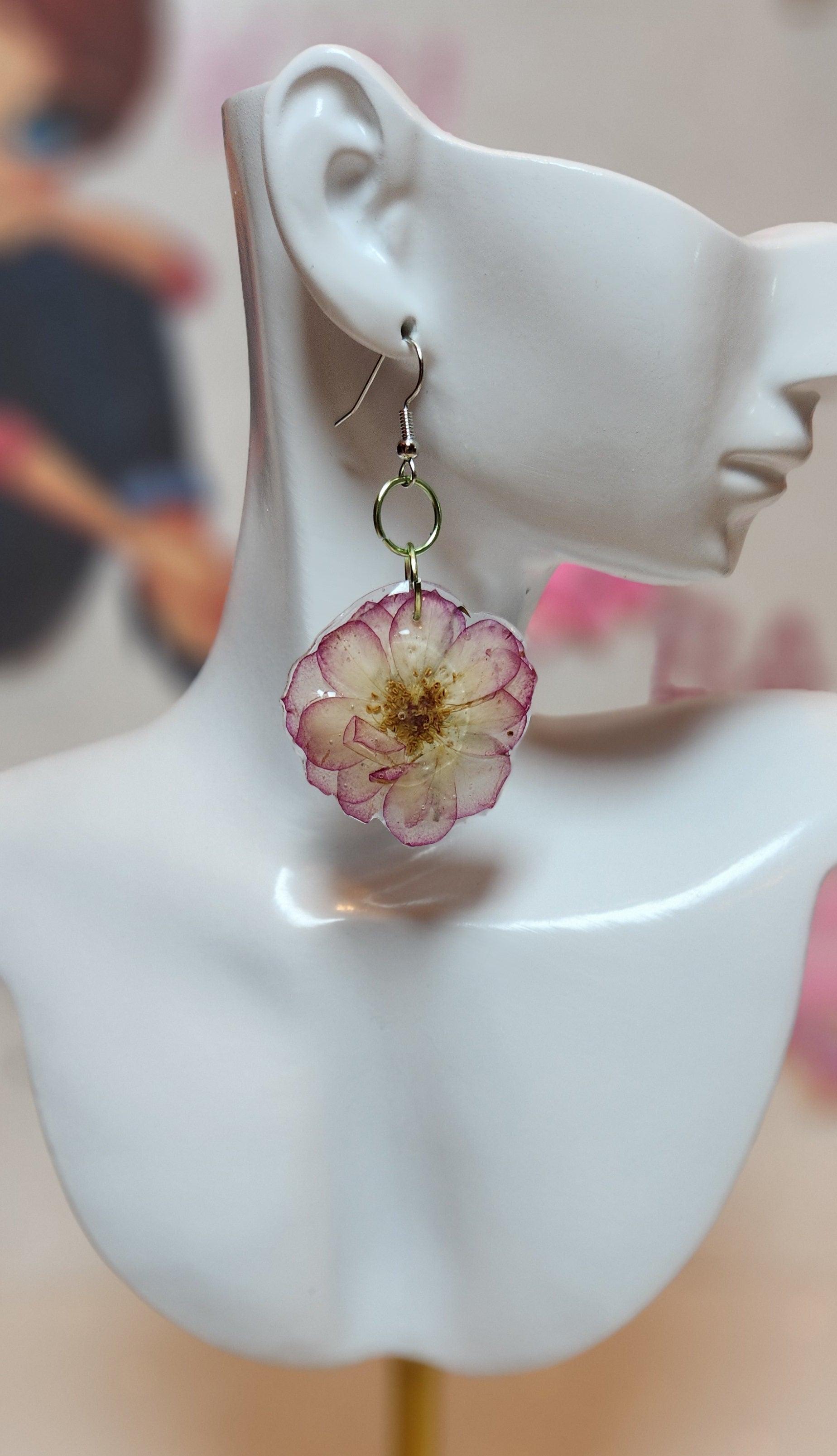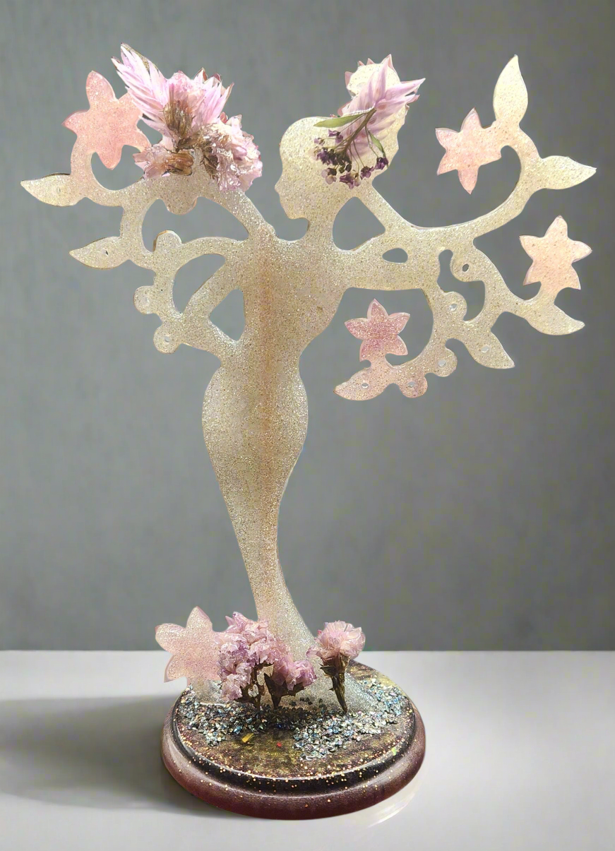 This handcrafted resin Mother Nature Tree display stand is uniquely made to organize or showcase jewelry. This particular piece is lightly adorned with real dried flowers coated in resin and delicately placed to add a touch of nature and unique beauty. It comes with a stunning pair of earrings- preserved flowers coated in resin, hanging from a stainless steel hook.
