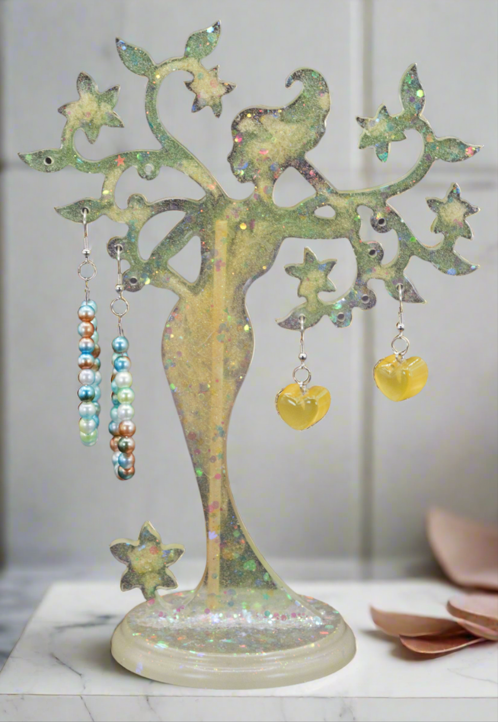Mother Nature Resin Tree Stand Set - Yellow w/ Glitter & Iridescent Confetti. Two Sets of Earrings