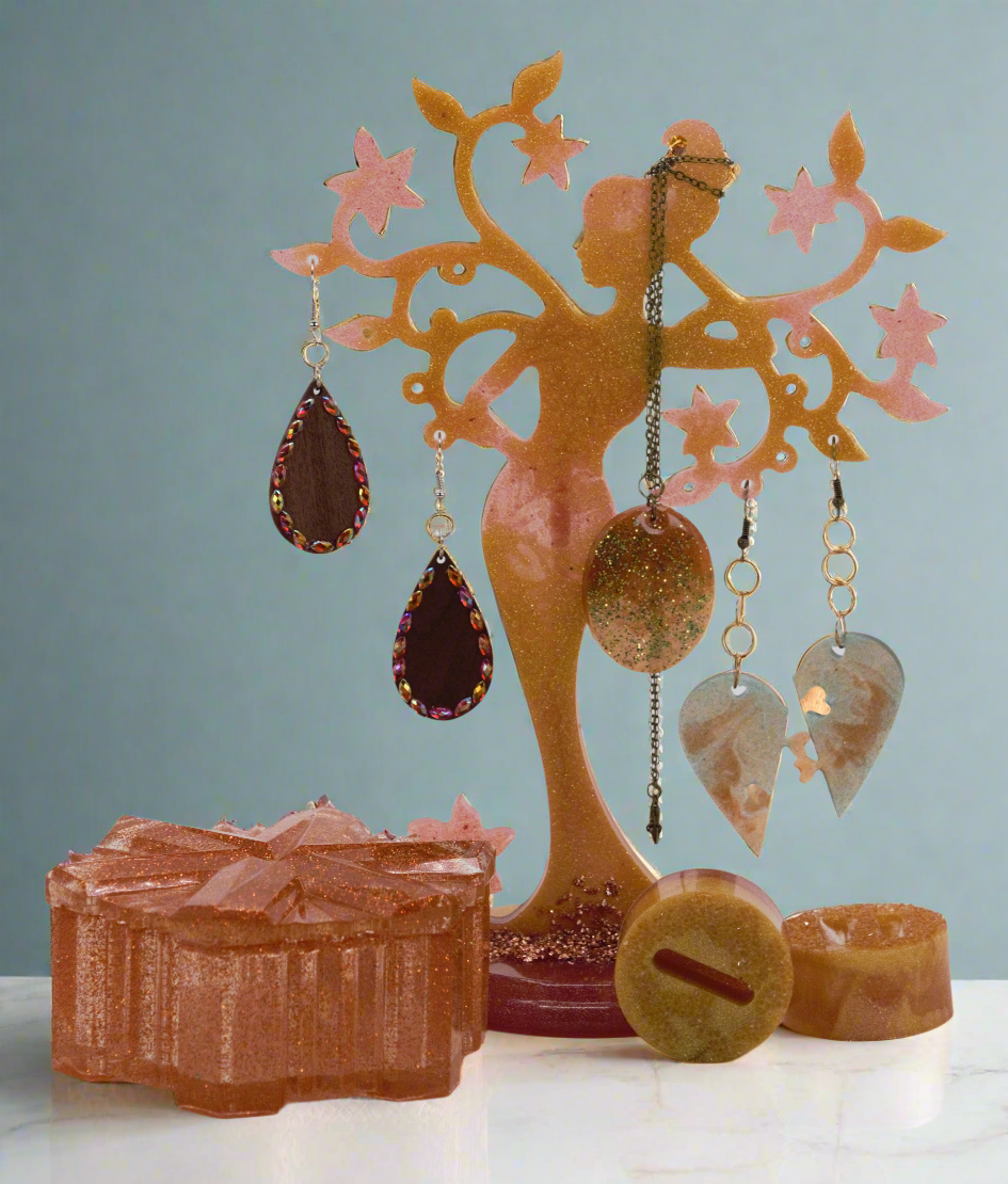 This resin display stand set is perfect for someone who has an eye for gold and the finer things in life! The Mother Nature Tree display stand was created to display or showcase jewelry. It comes with two pairs of earrings, two ring holders, a necklace, and a jewelry dish. One pair of earrings are a wooden tear drop shape with amber rhinestones. The other pair of earrings are broken heart shaped with amber and turquoise colors made from resin. Both pairs of earrings have hypoallergenic stainless steel hooks. The necklace has a bronze chain and a resin pendant that is amber, orange, green, and has turquoise glitter. The resin ring holders are amber and orange with broken gold, shimmery glass beads adorned on top. The resin amber jewelry dish is clear resin with orange glitter and comes with a lid to keep jewelry clean. Shimmery, amber colored broken stones at the base of the tree stand to give a textured appearance. *PLEASE NOTE THAT THE TREE STAND IS NOT DESIGNED TO HOLD HEAVY ITEMS.