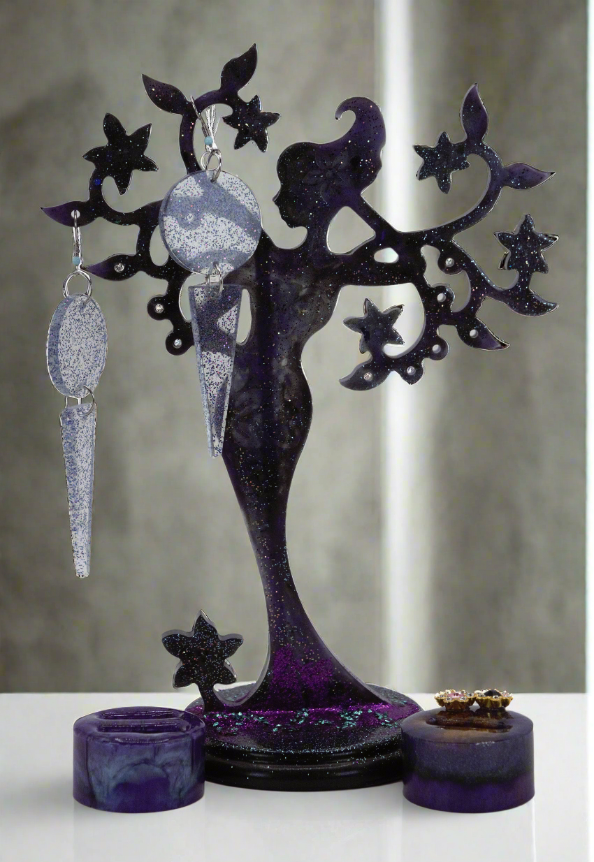 Mother Nature Resin Tree Stand Set - Black, Blue, Purple, and Green Colors w/Earrings and Ring Holders