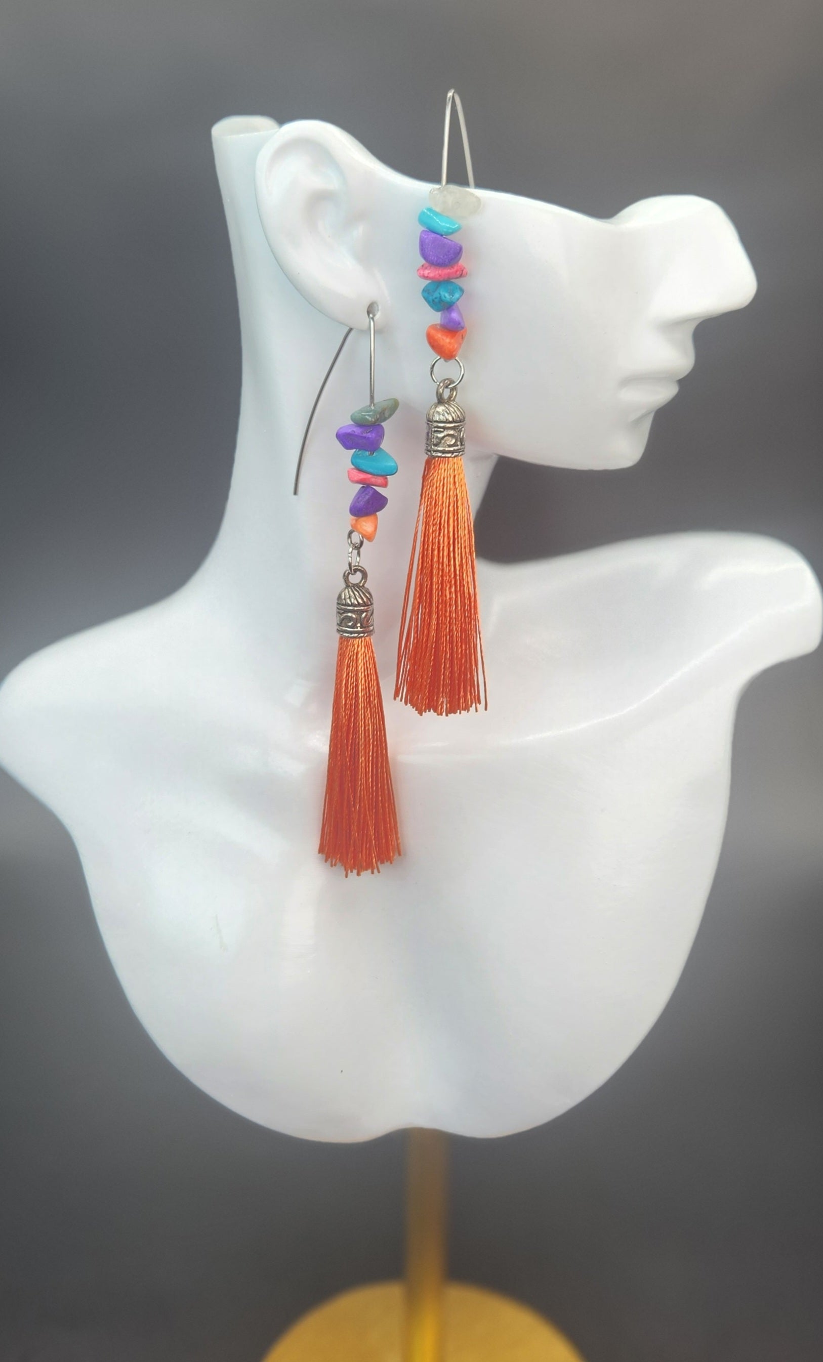 This handcrafted multicolored stone earrings with bright orange tassels hanging from a stainless steel V-shaped Marquise hook will dazzle any fun-loving free spirited hippie chick who's into wearing stone or any style!