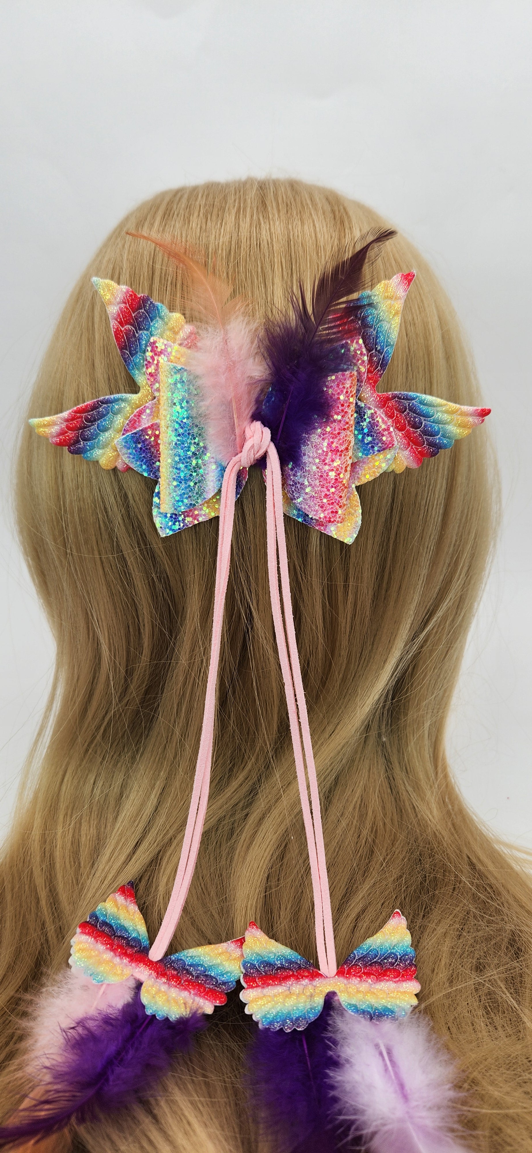 This handcrafted bright rainbow colored cloth hair bow and rainbow wings with faux feathers with have you feeling all the colors of the world! The free falling artificial suede leather string dropping from the center of the bow has violet and purple faux feathers and wings feeling like you can fly over the rainbow. The clip attached to this bow is steel and has teeth for better hair grip.