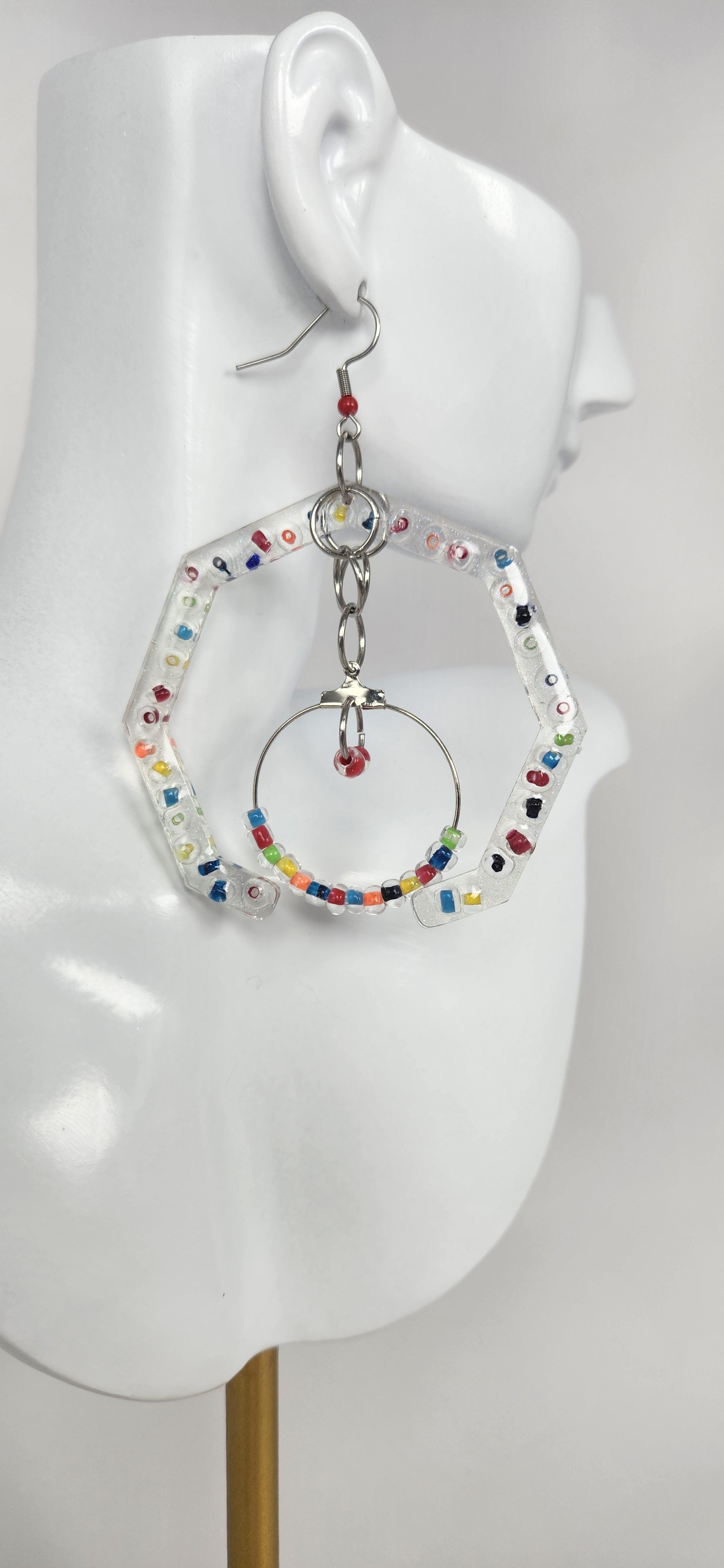 This open bottom resin handmade hoops with multicolored glass beads inside hang from a stainless steel hook and has a closed wire hoop in the center showcasing colorful beads as well. This pair of earrings say I'm fun, colorful, loud and ready to play:)