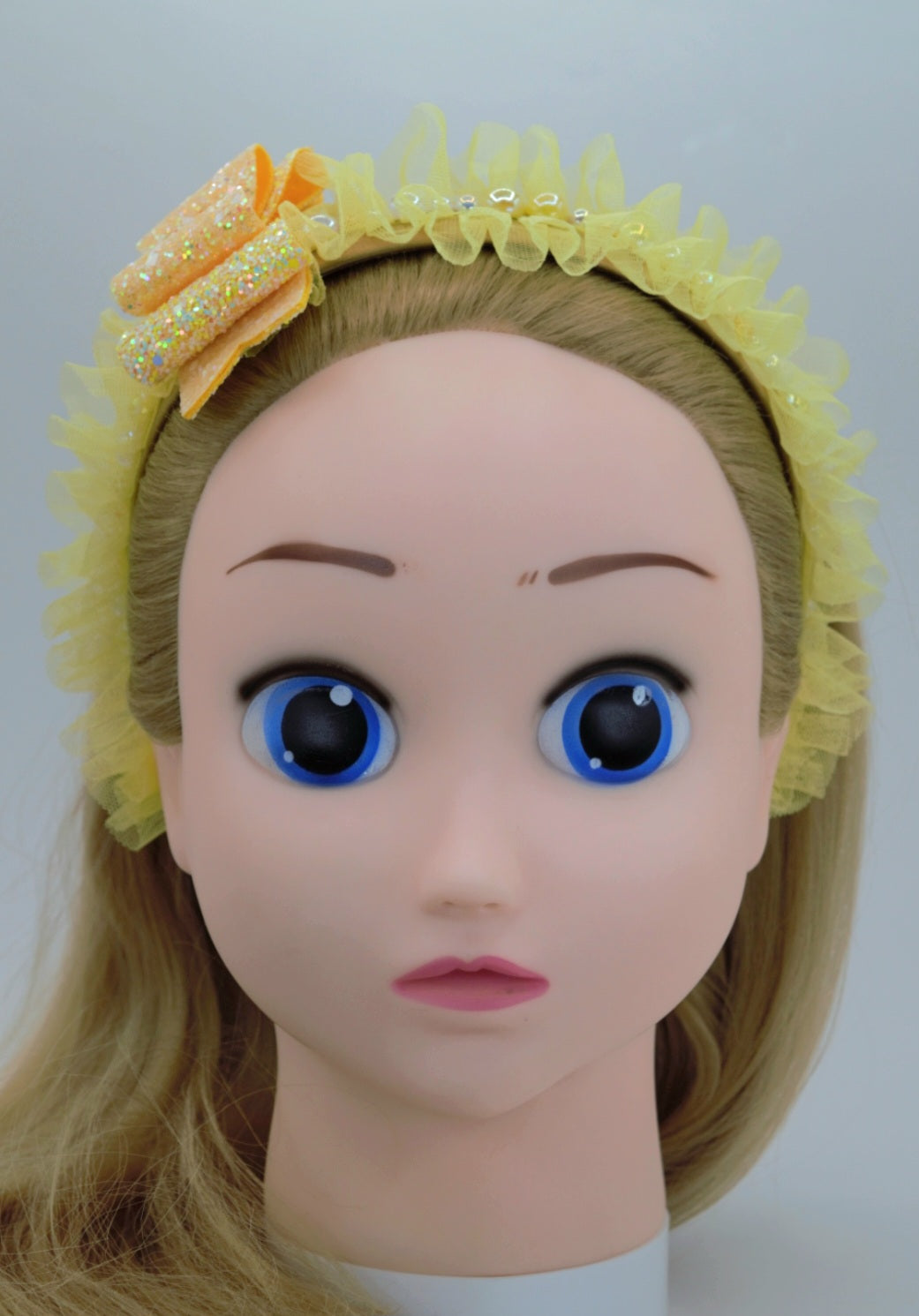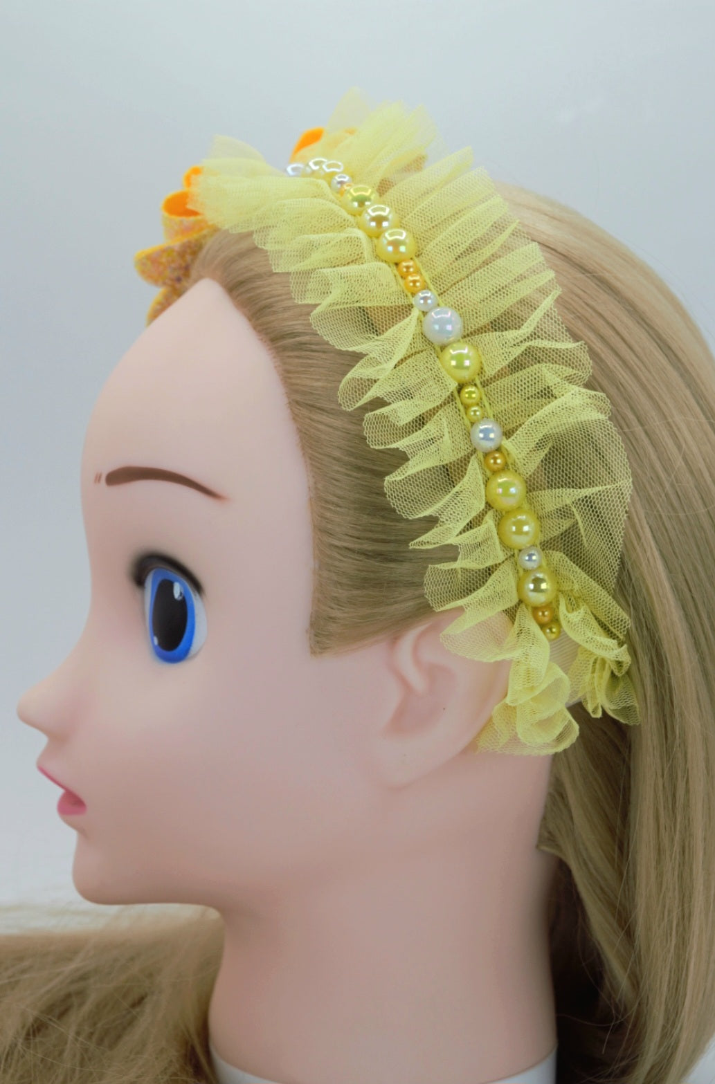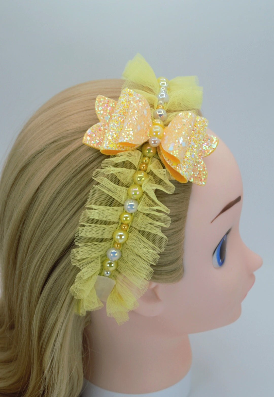 Classic beauty at its finest! Lovely faux pearls... textured sunshine yellow tulle... adorable shimmery glitter hair bow... combine all three and you will have a timeless, elegantly handcrafted hair accessory!