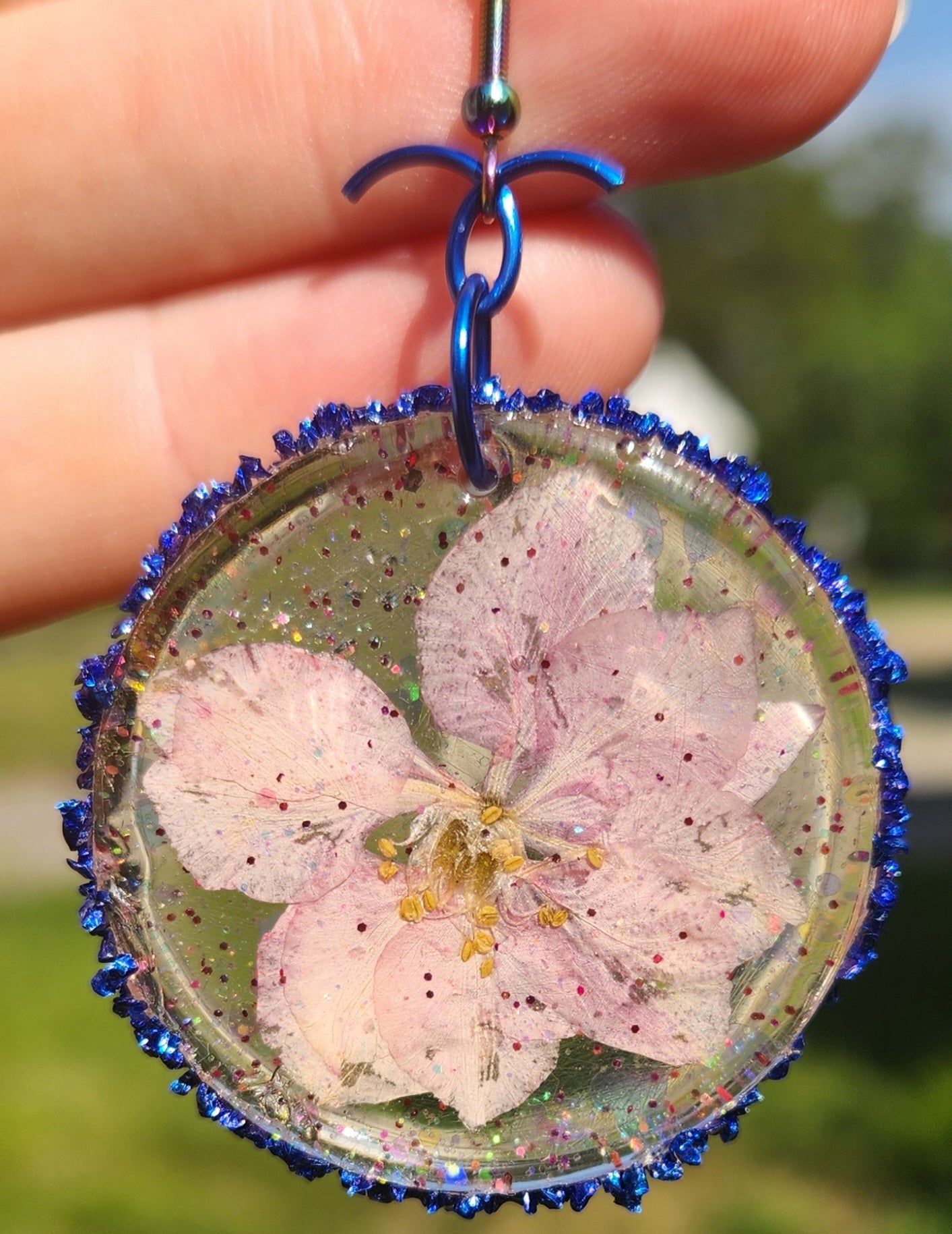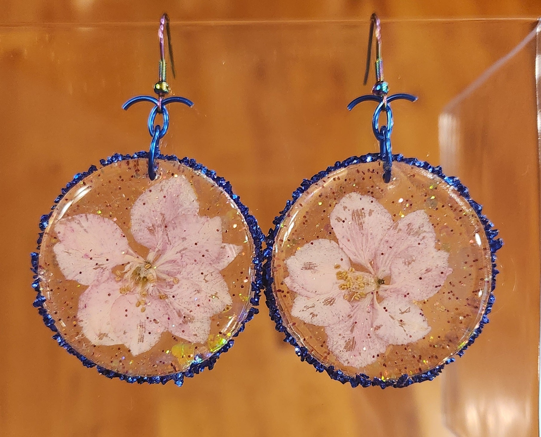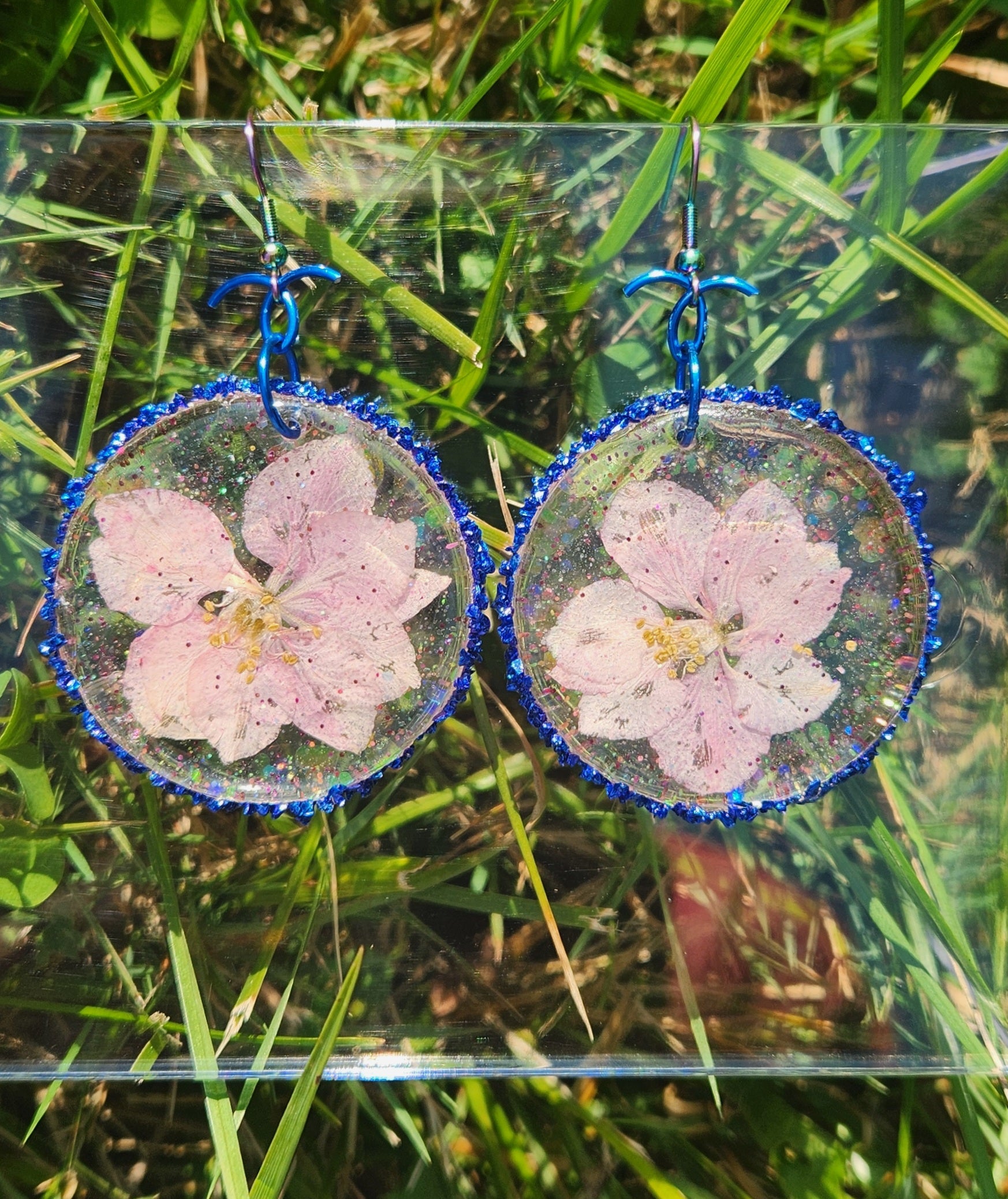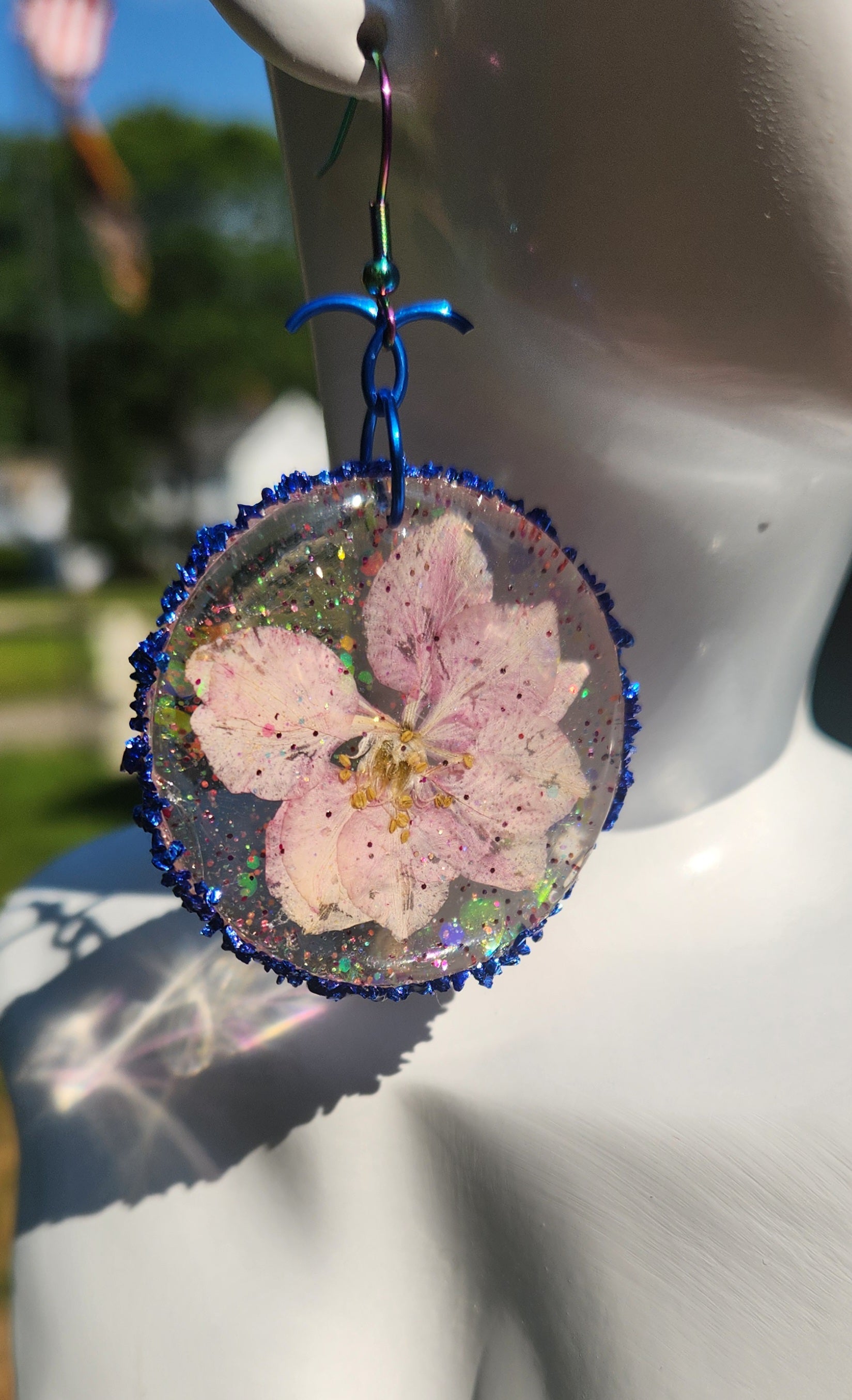 These glossy glitter resin earrings showcasing a real preserved pink flower are ABSOLUTELY gorgeous and elegantly handcrafted! They are sure to add a lovely touch of youth and feminine attractiveness to any lady's style! These earrings hang from a iridescent rainbow colored stainless steel hook and are hypoallergenic.